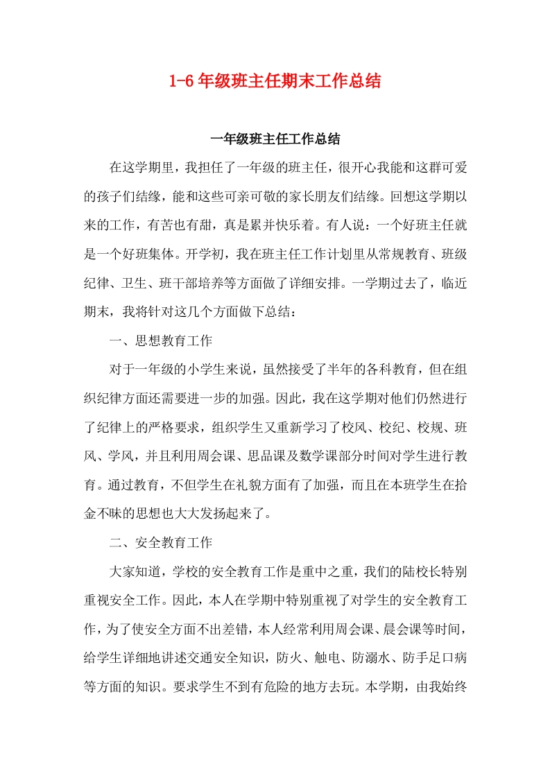 1-6年级班主任期末工作总结一年级班主任工作总结在这学期里,我担任了一年级的班主任,很开心我能和这群可爱的孩子们结缘,能和这些可亲可敬的家长朋友们结缘。回想这学期以来的工作,有苦也有甜,真是累并快乐着。有人说:一个好班主任就是一个好班集体。开学初,我在班主任工作计划里从常规教育、班级纪律、卫生、班干部培养等方面做了详细安排。一学期过去了,临近期末,我将针对这几个方面做下总结:一、思想教育工作对于一年级的小学生来说,虽然接受了半年的各科教育,但在组织纪律方面还需要进一步的加强。因此,我在这学期对他们仍然进行了纪律上的严格要求,组织学生又重新学习了校风、校纪、校规、班风、学风,并且利用周会课、思品课及数学课部分时间对学生进行教育。通过教育,不但学生在礼貌方面有了加强,而且在本班学生在拾金不昧的思想也大大发扬起来了。二、安全教育工作大家知道,学校的安全教育工作是重中之重,我们的陆校长特别重视安全工作。因此,本人在学期中特别重视了对学生的安全教育工作,为了使安全方面不出差错,本人经常利用周会课、晨会课等时间,给学生详细地讲述交通安全知识,防火、触电、防溺水、防手足口病等方面的知识。要求学生不到有危险的地方去玩。本学期,由我始终