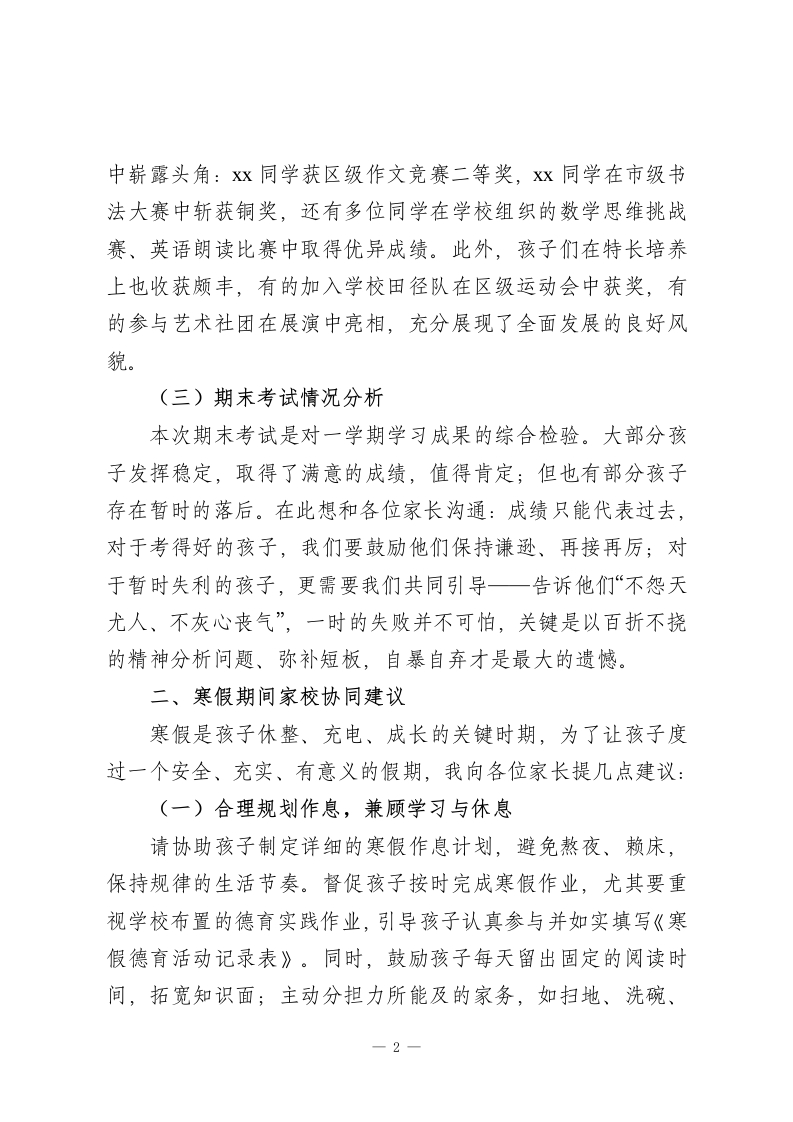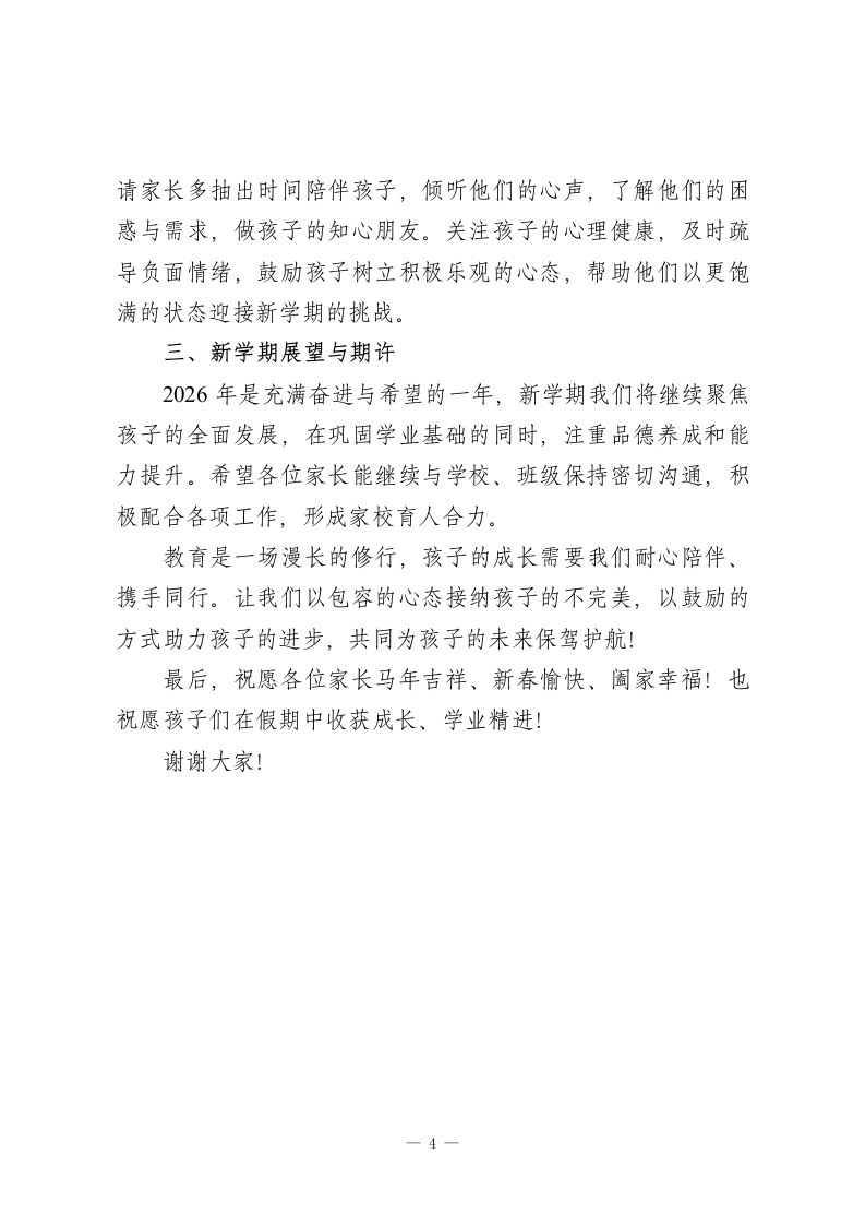 秋季学期末家长会班主任讲话:不怨过往稳前行,家校携手育新苗尊敬的各位家长朋友们:大家晚上好!首先,我代表班级全体师生,向在百忙之中抽空前来参加本次家长会的各位,表示最热烈的欢迎和最衷心的感谢!今天我们齐聚一堂,既是对本学期的总结回顾,也是为了搭建家校沟通的桥梁,共商孩子成长大计。过去这一学期,孩子们在知识学习、品德养成、能力提升等方面都有了不同程度的进步,这既离不开孩子们自身的努力,更离不开各位家长的悉心陪伴与支持。一、学期班级工作回顾(一)德育养成成效显著本学期,班级围绕“文明礼仪、爱校爱班、责任担当”开展了系列主题活动,孩子们的行为习惯和道德素养明显提升。在学校纪律卫生流动红旗评比中,我们班多次上榜,尤其在课堂纪律、课间文明活动等方面表现突出,得到了学校的肯定。通过每月一次的特色主题队会,孩子们主动参与策划、展示风采,在活动中学会了合作、懂得了感恩,班级凝聚力也不断增强。(二)学业与特长齐头并进学业上,孩子们始终保持勤奋好学的态度,课堂上积极互动,课后及时巩固,整体成绩稳步提升。部分同学在学科竞赛1