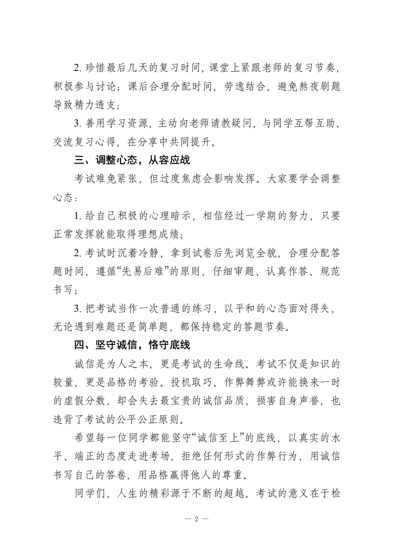 秋季学期末考试动员校长国旗下讲话:诚信应考,超越自我老师们、同学们:大家早上好!今天我国旗下讲话的题目是《诚信应考,超越自我》。时光匆匆,转眼间,紧张而充实的本学期已临近尾声,期末考试即将在本周开考。这既是对大家一学期以来学业成果的全面盘点,更是对我们学习态度、综合素质与诚信品格的一次重要检验。如何高效复习、从容应考、交出满意答卷?这里有几点建议与大家共勉。一、正视考试,明确意义期末考试不是简单的分数比拼,而是查漏补缺的契机,是检验学习效果的标尺,更是锻炼心理素质、培养责任意识的平台。它能帮助我们看清自己的知识薄弱点,为后续学习指明方向;也能让我们在备考过程中,学会规划时间、克服惰性、突破自我。因此,每一位同学都应抱着严肃、认真、负责的态度,重视这次考试,把它当作成长路上的一次重要历练。二、科学复习,高效冲刺“温故而知新,可以为师矣”,扎实的复习是取得好成绩的关键。同学们要结合自身情况,制定详细、合理的复习计划,避免盲目刷题、杂乱无章。1.梳理知识体系,将零散的知识点串联成网,重点攻克薄弱学科和易错题型;一1
