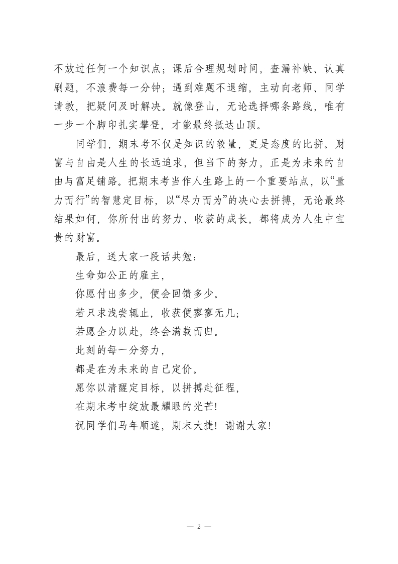 秋季学期末考试动员校长国旗下讲话:量力而行定目标,尽力而为赴征程尊敬的老师们、亲爱的同学们:大家上午好!期末的钟声即将敲响,这是检验一学期学习成果的关键时刻,也是我们践行“量力而行、尽力而为”的最佳考场。同学们,人生如同一场漫长的跋涉,目标是前行的灯塔,而清醒的自我认知与全力以赴的态度,便是抵达彼岸的双桨。林肯曾说:“喷泉的高度不会超过他的源头,一个人的事业也是这样,他的成就绝不会超过他的信念。”目标的高度,决定了我们能抵达的远方。少年时的拿破仑,在同伴沉迷玩乐时,便立下“不想当元帅的士兵不是好士兵”的壮志,他如饥似渴地研读历史、战争、哲学等各类书籍,为理想默默积蓄力量。他的故事告诉我们,心有多大,舞台就有多大。但高远的目标,并非不切实际的空想。“量力而行”是智慧的前提:我们要客观看待自己的能力,根据学科基础、学习节奏,制定跳一跳能够得着的期末目标一一基础薄弱的同学,可将“扎实掌握基础知识点、减少失误”作为核心;成绩中等的同学,可瞄准“突破薄弱学科、稳步提升排名”;学有余力的同学,则可追求“拔尖冲刺、全面精进”。不盲目攀比他人,不勉强自己挑战超出能力范围的目标,才能在稳步前行中积累信心。而“尽力而为”,是实现目标的关键。确定目标后,便要以全力以赴的姿态付诸行动:课堂上专注听讲、紧跟老师思路,1
