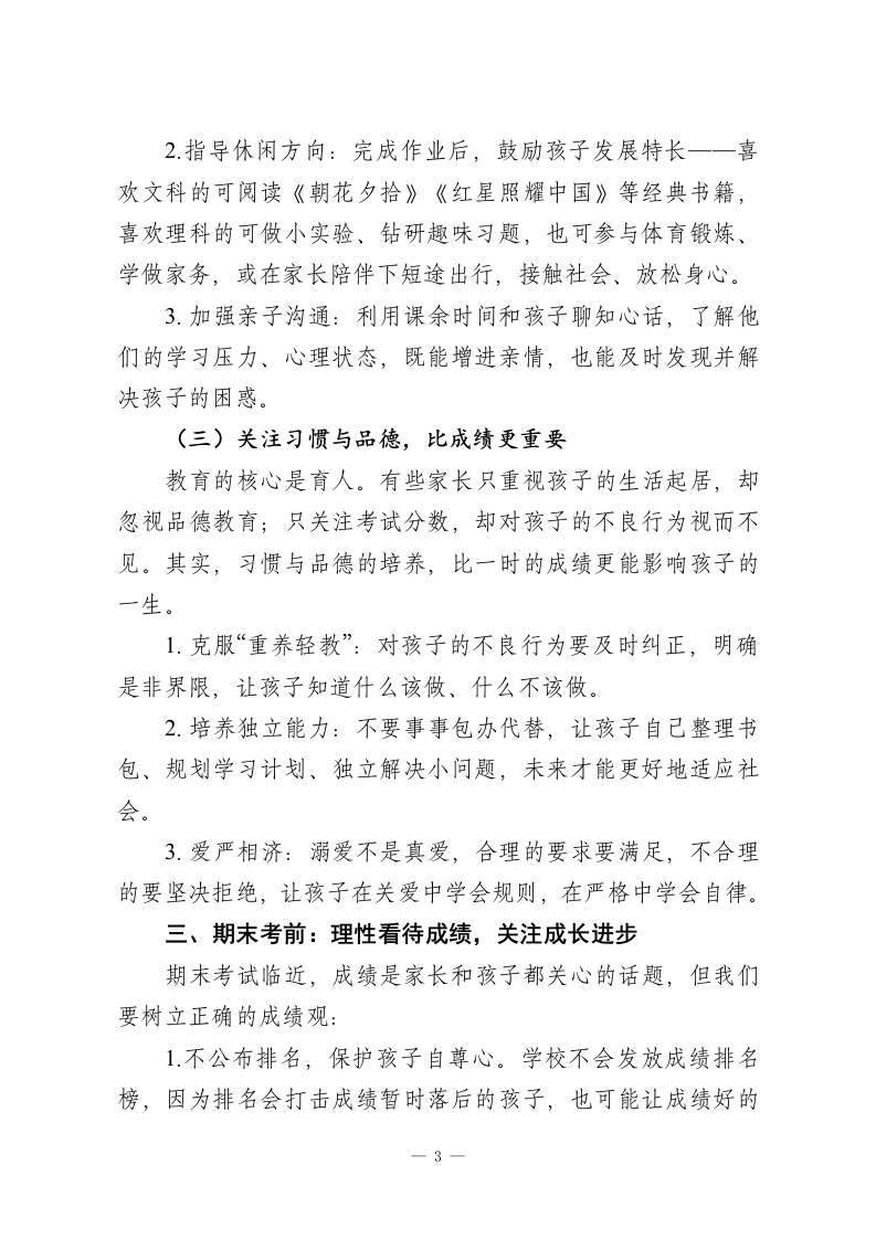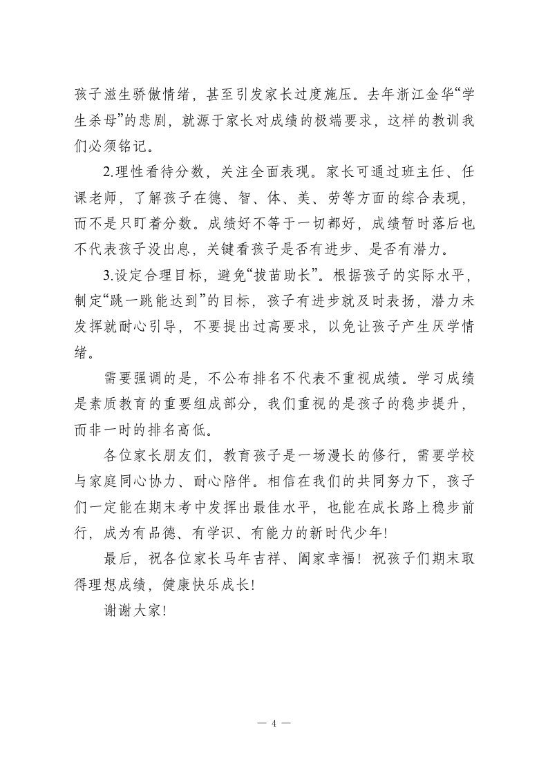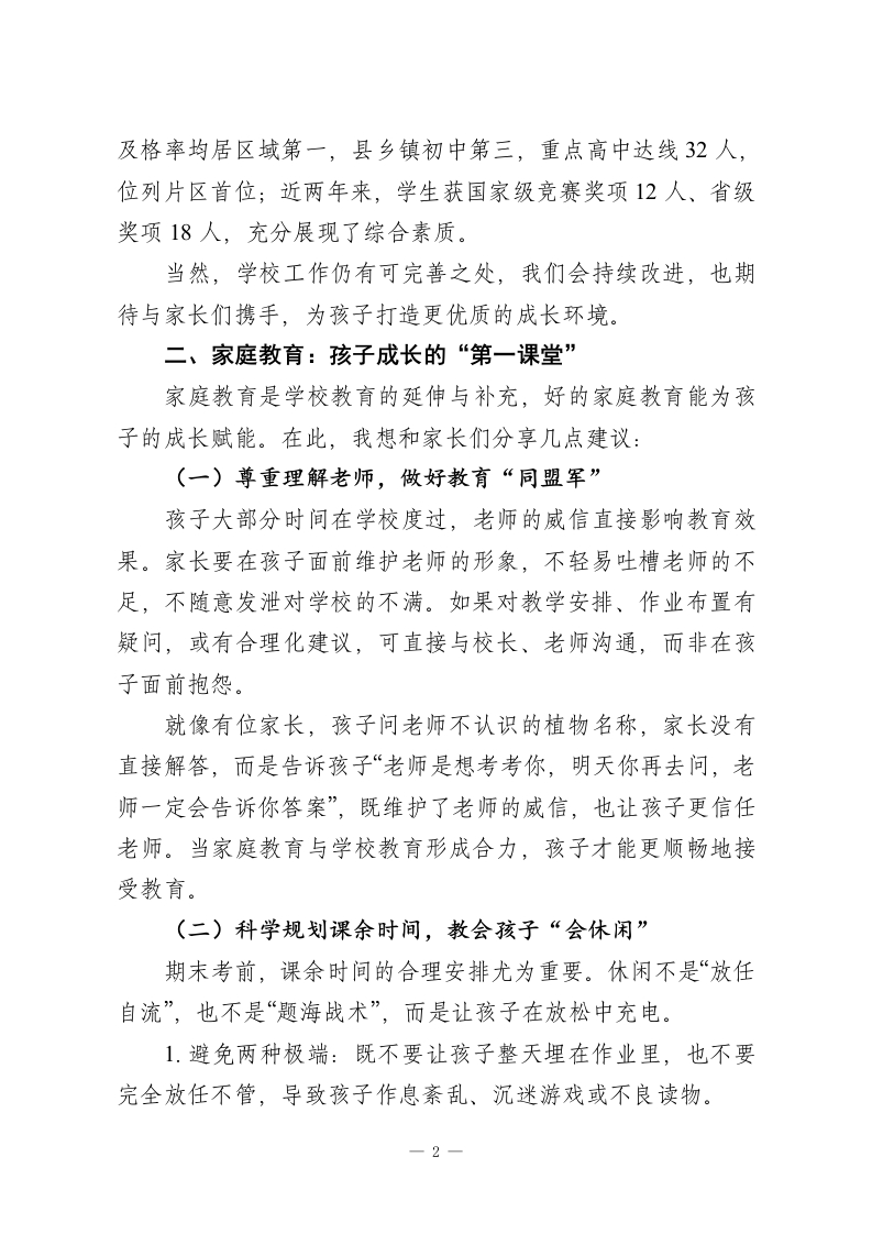 秋季学期末考试前家长会校长发言:重视家庭教育,理性看待成绩各位家长朋友们:大家好!今天,我们因同一个目标相聚在这里一一为了让孩子们成为家庭的骄傲、学校的栋梁、社会的好公民。首先,我代表学校全体师生,向一直以来支持学校工作的各位家长,致以衷心的感谢和诚挚的敬意!今天我主要和大家交流两方面内容:一是汇报学校近期的发展与成果,二是重点探讨家庭教育的重要性,以及期末考前如何理性看待孩子的成绩与成长。一、学校工作汇报:凝心聚力,护航成长目前我校共有24个班级,82名教职员工,办学规模与办学质量同步提升。全体教师秉持“爱生如子”的初心,深耕教育教学:清晨6点便到校筹备早读,中午放弃休息为学生答疑,晚自修期间全程在岗辅导,直到晚上9点半才离校。这份敬业精神,是孩子们成长路上最坚实的保障。学校坚持精细化管理,校园环境整洁有序,课堂纪律井然,中午时段教室安静无喧哗,学生们都能专注学习。近年来,学校先后荣获“县常规管理示范初中”“市德育先进学校”“省实施教育现代化示范初中”等多项荣誉,连续十一年获评县质量优等学校。在学业与竞赛方面,学校成绩亮眼:去年中考各科优秀率、-1-