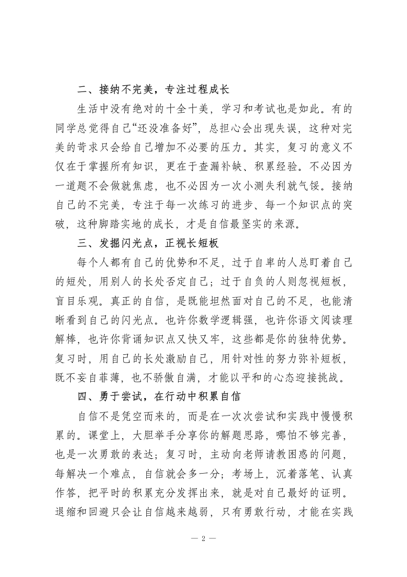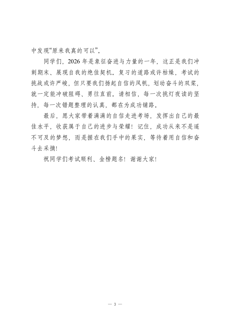 秋季学期末前校长期末考试动员讲话:扬起自信风帆,划动奋斗双桨,奔赴成功彼岸同学们:大家好!当清晨的第一缕阳光洒满校园,我们迎来了本学期的最后冲刺阶段一一下周,期未考试就要正式拉开帷幕。我知道,不少同学从上周起就已经制定了详细的复习计划,在书桌前默默耕耘、积蓄力量。今天,我不想过多谈论具体的复习方法,只想和大家聊聊支撑我们冲刺到底的核心力量一“自信心”。有这样一句充满力量的话:“自信是成功的第一秘诀。”它看似简单,却能在关键时刻为我们注入无穷动力。很多时候,阻碍我们前进的不是知识的难点,而是内心的自我怀疑。想要在考试中发挥出最佳水平,首先要筑牢自信的根基。在这里,我给大家分享四个建立自信的小方法:一、用积极语言,重塑自我认知“我不行“我太笨了“我肯定考不好”一这些负面话语就像无形的枷锁,会慢慢消磨我们的勇气。偶尔的谦虚不等于自我否定,长期的负面暗示只会让自卑生根发芽。从现在起,把否定句换成肯定句:“我能行”“我可以试试”“我已经掌握了很多知识,再坚持一下就能更棒”。正向的自我对话会带来积极的心理暗示,让我们在复习中更有底气,在考场上更从容。-1