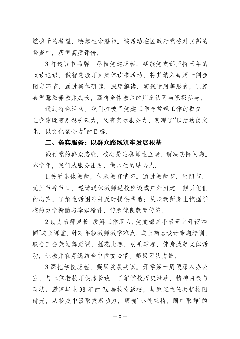 秋季学期末小学校长述职报告:巧思党建强根基,务实服务暖人心,笃行学习共成长尊敬的各位领导、同志们:大家好!本学期,对我而言是角色坚守与责任深耕的一年。作为Xx小学校长兼党支部书记,我始终以如履薄冰的敬畏之心、谦卑务实的工作态度,将党建工作与教育教学深度融合,以服务凝聚人心,以学习驱动成长,在传承学校近七十年办学底蕴的基础上,奋力推动学校高质量发展。现将本学年履职情况汇报如下,恳请批评指正。一、巧思党建:以特色活动激活文化生命力党建工作是学校发展的灵魂,我始终坚持以活动为载体,让党建文化扎根校园、浸润师生。1聚焦特殊群体,传递党建温情。结合情人节、元宵节等特殊节点,发起“爱心陪伴留守儿童”志愿服务活动。党员志愿者与留守儿童一起读绘本、做游戏、送祝福,用陪伴驱散孤独,让孩子们感受校园温暖,也让志愿者教师在奉献中重温教育初心与职业幸福。2.深化爱心结对,筑牢帮扶桥梁。组织25名党员志愿者与25名困境学生举行爱心结对仪式,通过每月一次的谈心解惑、游戏互动、入户走访等形式,建立朋友式沟通关系,用关爱点