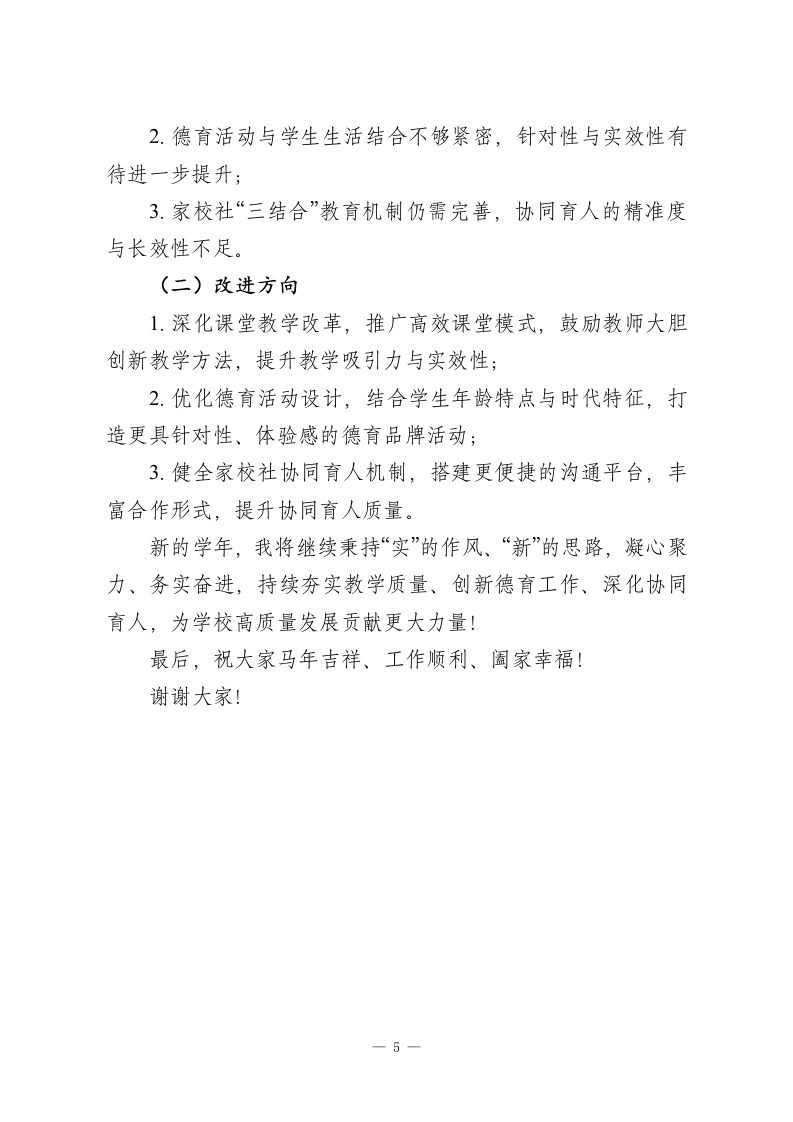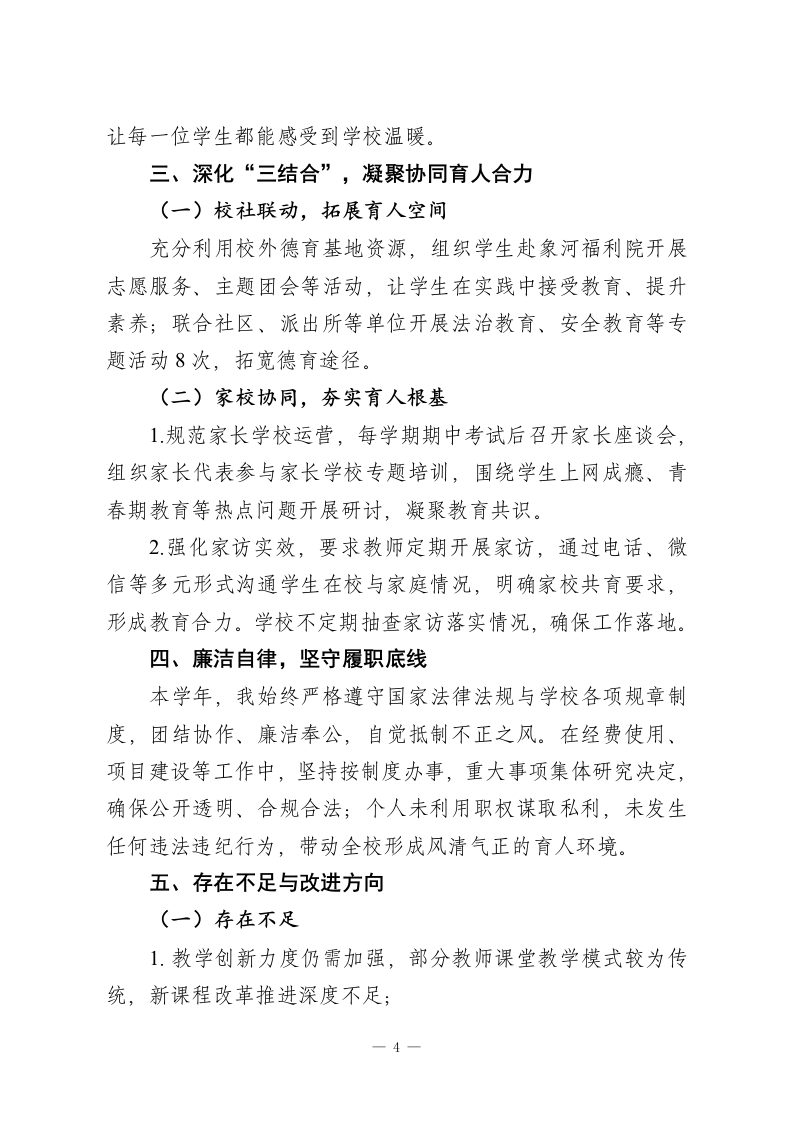 秋季学期末校长述职报告:立足“实”字抓教学,着眼“新”字育德育,深化“三结合”促发展尊敬的各位领导、同志们:大家好!本学期,在上级领导的正确指引、社会各界的大力支持及全体教职工的共同努力下,我始终秉持“立德树人”根本任务,立足一个“实”字狠抓常规教学,着眼一个“新”字深耕德育工作,深化“三结合”教育机制,稳步推进素质教育与新课程改革,圆满完成各项工作任务。现将本学年履职情况及廉洁自律表现汇报如下,恳请批评指正。一、立足“实”字,筑牢教学质量生命线(一)严抓常规管理,夯实教学基础严格落实《Xx市中小学教学常规管理办法》,健全“五项核心制度”:坚持集体备课制度、课堂常态化巡查制度、备批改周查制度、教情学情定期反馈制度、质量奖惩兑现制度,确保教学各环节有章可循、落地见效。规范考试管理,科学组织月考、期中期末等各类考试,注重考后质量分析,充分发挥考试的诊断、调控与激励作用,营造优良考风和进取学风。(二)深耕教研实效,助力教师成长1.优化集体备课模式,严格执行“四定”(定时间、定地点、定内容、定主备人)、“四课”(说课、议课、听课、评课)、“六
