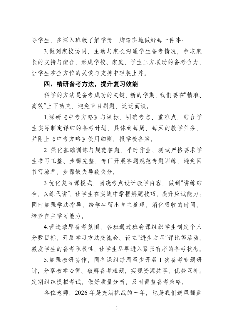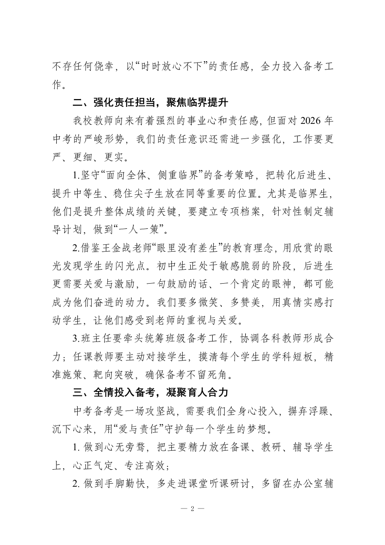 秋季学期末中考备考教师会议上校长讲话:正视挑战明方向,精研备考启新程各位领导、老师们:大家好!占用大家的休息时间召开本次中考备考会议,我深表歉意,但相信为了2026年中考的共同目标,大家能够理解这份迫切与责任。回顾秋季学期的期未考试与月考成绩,形势确实不容乐观,相信大家看到成绩汇总时,都和我一样深感压力沉重、责任重大。这段时间,我一直在反复思考:我们的备考方向是否精准?管理举措是否到位?教学方法是否高效?但每当看到大家忙碌的身影、感受到大家任劳任怨的敬业精神,我又充满了信心一有这样一支负责任、有担当的教师队伍,我们一定能顶住压力、扭转局面。今天,我想围绕“正视挑战、反思不足、精准发力”,和大家分享四点备考思路:一、筑牢忧患意识,锚定质量核心教学质量是学校的生命线,中考成绩更是关乎学生未来、学校声誉的关键。我们必须清醒认识到,当前我校在中考竞争中并无绝对优势,尖子生不够突出、中等生断层、后进生转化乏力等问题亟待解决。各位老师,赢得中考的辉煌,是我们教书育人的最大荣光,也是对家长期盼的最好回应。新的学期,我们要把“质量至上”的理念刻在心里、落在行动上,在备考质量上不找任何托辞、-1