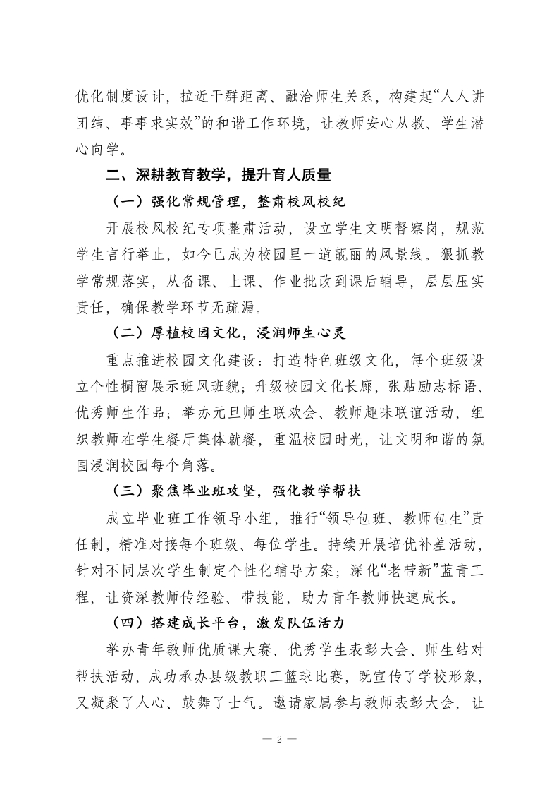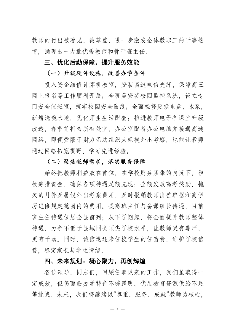 秋季学期校长代表全体班子成员做述职报告:尊重教师强根基,服务教师促发展,成就教师创辉煌尊敬的各位领导、同志们:大家好!我于20xx年11月任职校长,现代表学校领导班子,向大家作任职期述职报告。任职以来,班子成员始终秉持“尊重教师、服务教师、成就教师”的核心理念,团结协作、务实笃行,聚焦办学质量提升,全力推动学校各项工作迈上新台阶。现将主要工作情况汇报如下,请子批评指正。一、秉持先进理念,筑牢办学根基(一)坚守办学方向,凝聚班子合力班子成员始终团结一心、分工明确,坚持正确的教育方针,树立“以生为本、以师为要”的办学理念。全体校长以身作则,深入教学一线兼课,这在全县高中院校中独树一帜:Xx校长兼任高三英语课,xx校长兼任高一历史课,我本人承担高二两个班的教学任务。我们推行“每日三值班”制度,Xx校长负责早间值班,x校长负责晚间值班,我兼顾早晚值班,以实际行动带动全体教职工实干担当。(二)完善规章制度,营造和谐氛围修订完善签到制度、会议制度、值班制度等多项规章,兼顾管理规范性与人文关怀,让制度更接地气、更具温度。通过