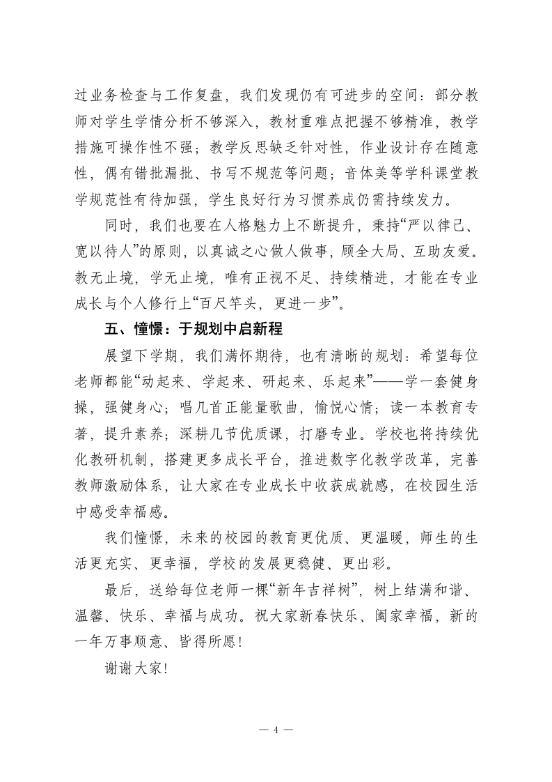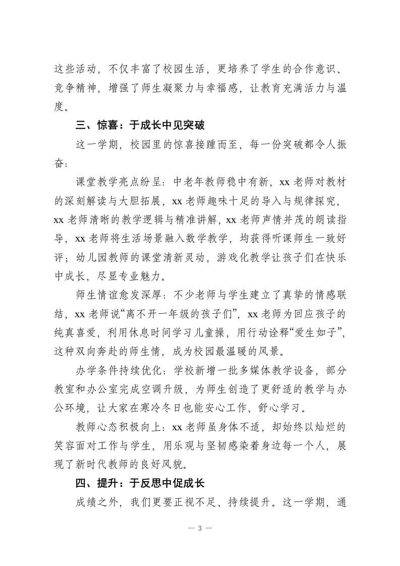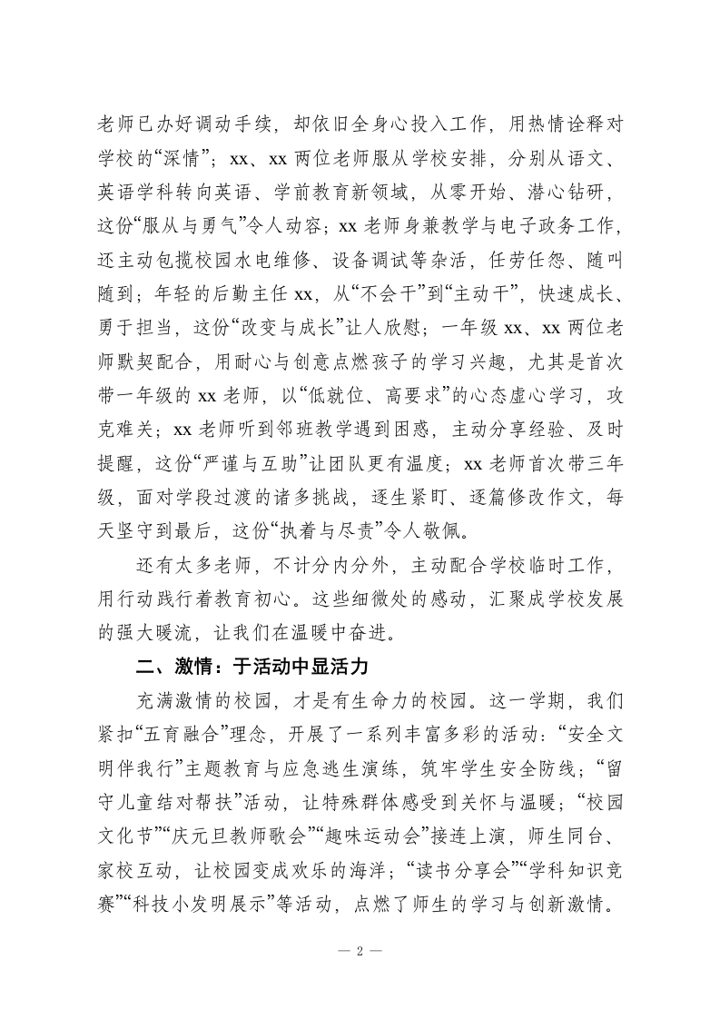 秋季学期校长年终总结讲话:五个关键词,绘写发展新续篇各位老师:大家好!时光匆匆,2025-2026学年秋季学期已圆满落幕。这个学期,虽没有银装素裹的冬日盛景,却有教育路上的一路繁花。在“十五五”规划深入推进的关键阶段,大家凝心聚力、并肩前行,让各项工作从容落地,也让校园处处洋溢着和谐、奋进的气息。今天,我想用“感动、激情、惊喜、提升、憧憬”五个关键词,与大家回顾过往、展望未来」一、感动:于细微处见初心教育的温暖,藏在每位老师的坚守与付出里。这一学期,太多瞬间让我动容:xx老师筹备校级公开课期间,家中突发急事,她强忍牵挂,为不影响学校教研安排,坚持按时授课,最终呈现了一堂生动精彩的优质课,这份“体谅与担当”令人感动;xx老师与家长沟通时遇突发分歧,主动承担责任,坦言“不能给学校添麻烦”,还始终保持“教到老学到老”的热忱,这份“责任与谦逊”让人敬佩;x老师作为资深教师,主动协助年轻搭班老师整队、送队,体育课上洪亮的口令尽显教育热情,这份“示范与帮扶”温暖人心;Xx、Xx两位年轻教师,主动承担厕所清扫等脏活累活,用行动诠释着“爱岗敬业”,而中教高级的Xx老师,始终保持工作热忱,毫无“船到码头车到站”的懈怠,这份“自觉与坚守”值得点赞;Xx1