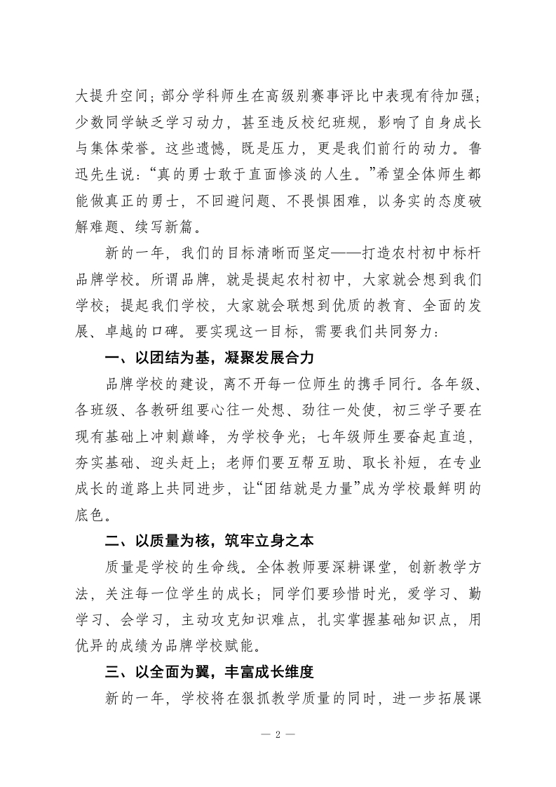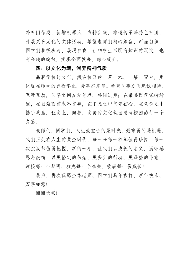 秋季学期校长元旦新年简短致辞:把握时光机遇,携手迈向新巅峰亲爱的同学们、各位老师:大家早上好!冬去春来,岁聿其莫,2025年在拼搏中落幕,2026年马年正携着希望向我们走来。在这辞旧迎新的特殊时刻,我谨代表学校,向全体同学致以最真挚的新年祝福,愿你们身体健康、学业精进、不负韶华;向奋战在教学一线的老师们、坚守在后勤岗位的工作人员们,送上最诚挚的问候,祝大家家庭幸福、工作顺心、万事胜意;更愿我们的学校在新的一年里,步履更坚、成绩更优、声誉更远!回首2025年,是学校在竞争中突围、在探索中奋进的一年。全校师生同心同德,在教育教学的赛道上收获了累累硕果:2025年中考实现历史性突破,创下近年最佳成绩;在各级教学常规检查中,我校各项指标全面提升、亮点突出;同学们在全市艺术节舞蹈、书画、三独比赛,以及诗歌朗诵、读书札记等赛事中捷报频传,充分展现了青春风采;老师们的专业成长意识持续增强,40余篇教育教学论文在国家、省、市级评比中获奖,12名教师获评各级各类先进个人。这些成绩,是每一位师生奋斗的见证,更是学校蓬勃发展的底气,让我们为自己的成长与进步倍感自豪!但成长之路从无坦途,我们也面临着诸多挑战:全校学生运动会在全市排名未达预期;七年级在市级质量检测中仍有较1