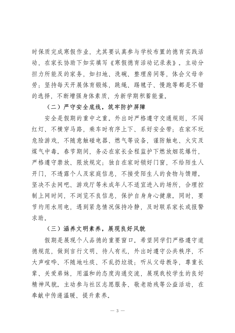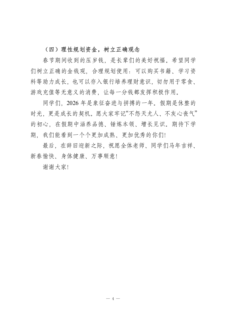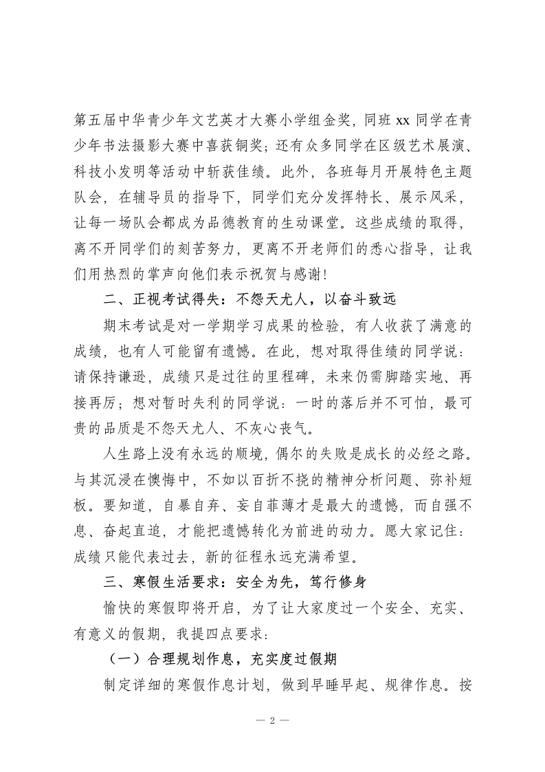 秋季学期休业式上德育副校长讲话:不怨过往砺初心,笃行实干启新程各位老师、同学们:大家好!今天,我们齐聚这里,为本学期画上圆满句号。回首这一学期,每一天都镌刻着我们的努力,每一刻都见证着我们的成长一一我们不仅在课堂上汲取知识养分,在活动中收获自信喜悦,更在潜移默化中涵养品德、规范言行。在此,我代表学校,向一学期来辛勤耕耘、无私奉献的班主任和全体学科教师,致以最衷心的感谢!向勤奋好学、锐意进取,在各方面取得进步的同学们,致以最真诚的祝贺!一、学期德育工作回顾:养品行,促成长本学期,学校以养成教育为核心,聚焦文明礼仪、爱校爱班、责任担当等主题,开展了系列德育活动,取得了显著成效。在纪律卫生流动红旗评比中,一批班级表现突出:纪律红旗获得者为一一班、二一班、三二班(并列第三);卫生红旗由五一班、四一班、三一班斩获。从结果来看,低年级同学在纪律养成上亮点突出,高年级同学在卫生维护上更为扎实,希望下学期各年级取长补短、全面提升。在特长培养与赛事比拼中,同学们大放异彩:学校田径队在区级运动会中奋勇争先,xx同学夺得100米项目第三名;Xx同学在市级“xx杯”作文竞赛中荣获二等奖;三一班Xx同学斩获1