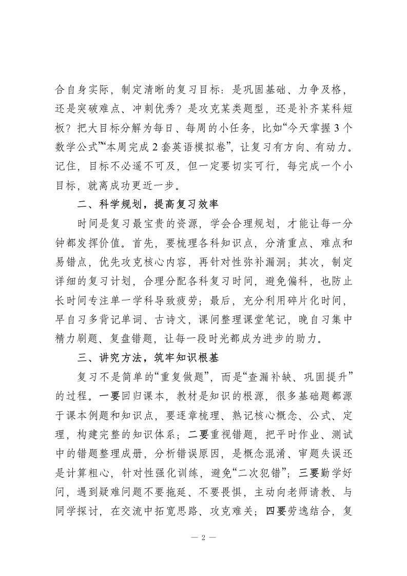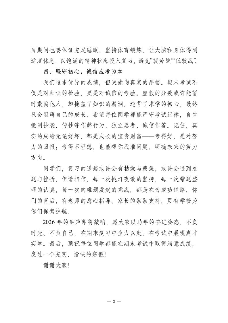 秋季学期学生期末复习动员大会校长讲话:以马年奋进之姿,赴期末攻坚之约亲爱的同学们:大家下午好!冬日的校园虽透着寒意,但同学们眼中的朝气与奋进的热情,让这个学期末充满了力量。转眼间,本学期已近尾声,距离期末考试仅剩最后一段时间。这是对一学期知识积累的全面检验,是对学习态度的直观反馈,更是你们展现自我、收获成长的重要契机。2026年是象征拼搏与奋进的一年,希望大家以龙马精神为动力,全力以赴投入期末复习,用汗水浇灌收获,用实力书写满意答卷!回顾这一学期,你们在课堂上专注思考、积极互动,在活动中绽放光彩、锤炼品格,在成长路上不断突破、稳步前行。有的同学攻克了曾经的薄弱学科,有的同学养成了自主学习的好习惯,有的同学在互助合作中收获了珍贵友谊。这些点滴进步,都值得被肯定、被铭记。但此刻,我们更要聚焦眼前的复习冲刺一一期未考的成绩不仅会载入你们的成长档案,更能帮你们清晰认识自我,为新学期的进步找准方向。想要在期未考中发挥出最佳水平,高效复习是关键。在此,我给大家提四点建议:一、明确目标,锚定冲刺方向没有目标的努力,就像无舵的航船。希望每位同学都能结1
