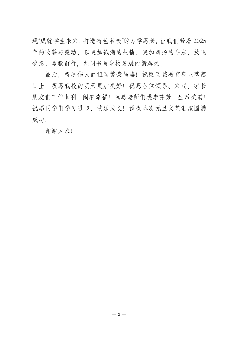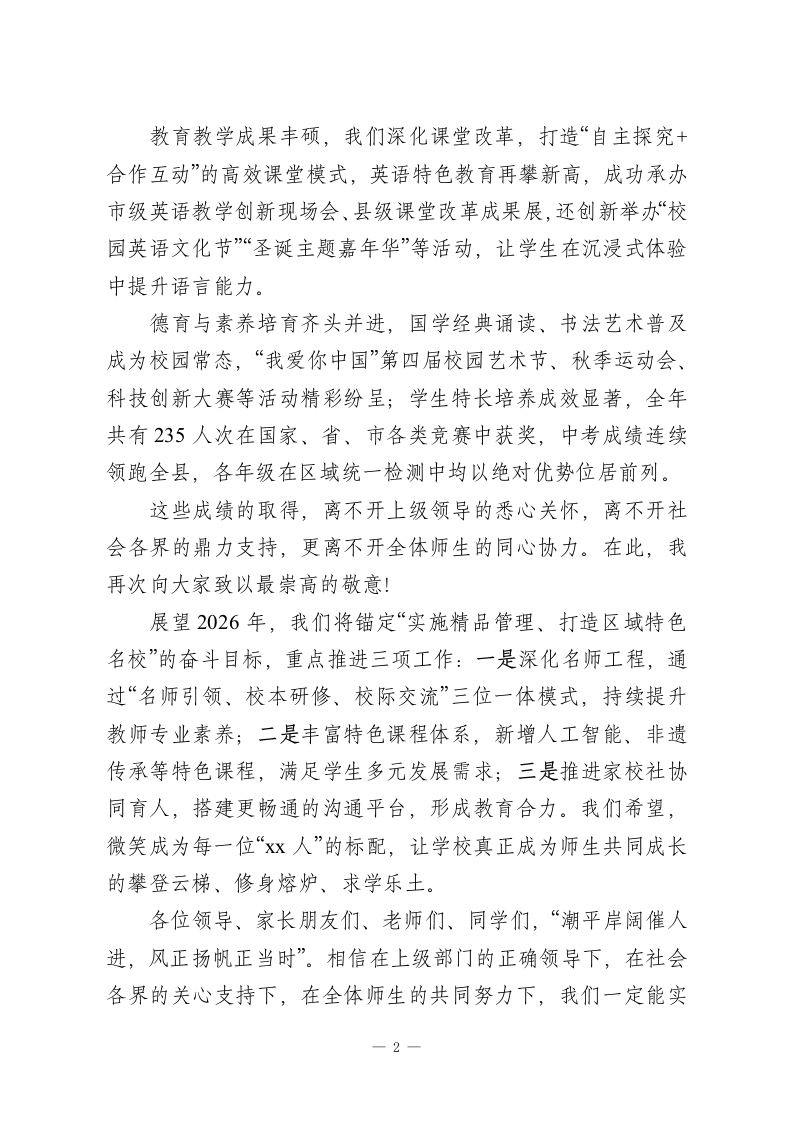 秋季学期学校元旦文艺汇演晚会上校长讲话:逐光而行育新苗,特色兴校启新程尊敬的各位领导、各位来宾、家长朋友们,亲爱的老师们、同学们大家晚上好!金蛇辞旧岁,瑞雪迎新春。在这辞旧迎新的美好时刻,我们欢聚一堂,共同见证2025年的圆满落幕,满怀憧憬迎接2026年的到来。首先,我谨代表学校党支部、校委会,向长期关心支持学校发展的各级领导、社会各界朋友,致以最热烈的欢迎和衷心的感谢!向辛勤耕耘、无私奉献的全体教职工,致以最诚挚的问候!向朝气蓬勃、逐梦成长的同学们,致以最美好的节日祝福!祝大家新年快乐、万事顺意!即将过去的2025年,是学校“十五五”规划开局的关键之年,更是我们以特色为翼、实现高质量发展的跨越之年。这一年,我们始终坚守“五育融合、特色赋能、成就每一位学生”的办学理念,秉持“小班化教学、个性化培养、高质量发展”的办学方向,在改革中破局,在实干中奋进,书写了学校发展的崭新篇章。办学条件持续升级,学校三期扩建工程顺利竣工并投入使用,新增3个智慧教室、2个特色功能馆和1个室内体育馆,教学设施达到区域领先水平;生源质量稳步提升,小学部实现四轨标准化招生,全校在校学生数突破1800人,社会认可度持续提高。