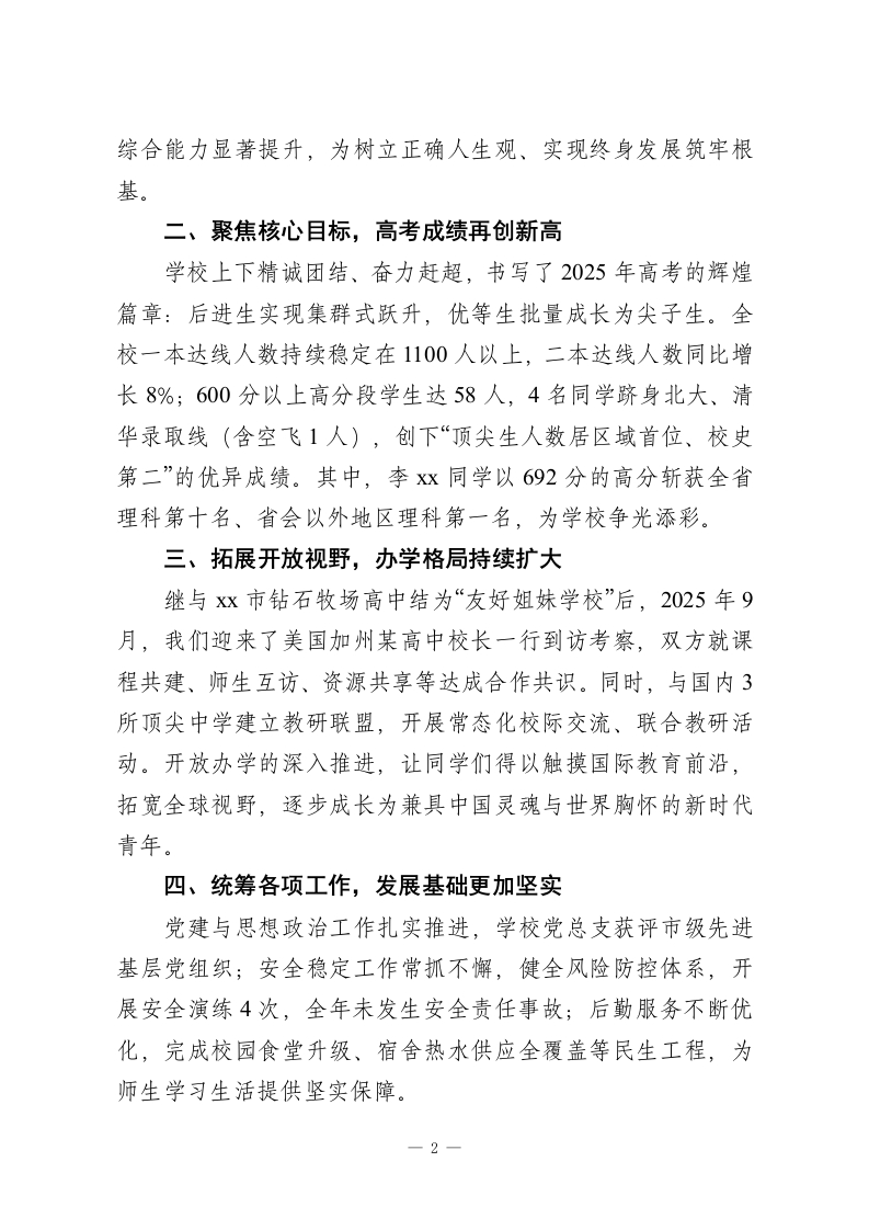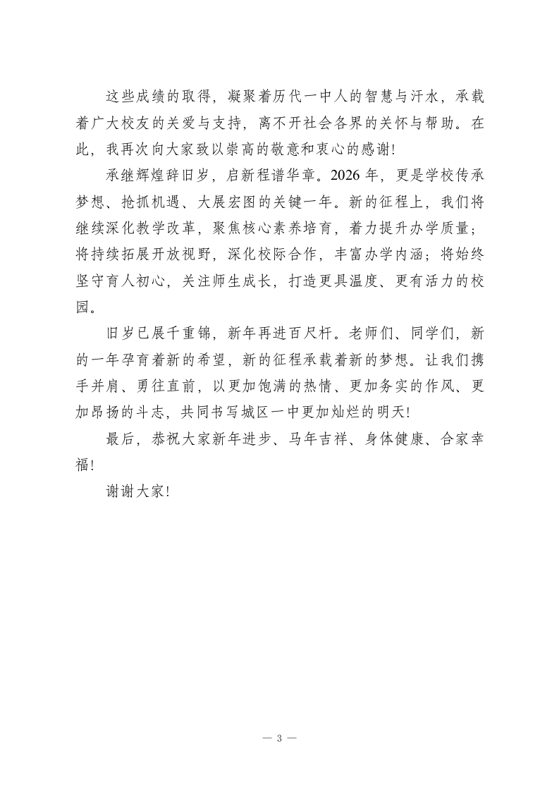 秋季学期元旦全体师生大会校长讲话:承辉煌辞旧岁,启新程谱华章亲爱的老师们、同学们:大家好!岁聿云暮,新元肇启。在这辞旧迎新的美好时刻,我谨代表校委会、党总支,向兢兢业业、甘于奉献、勇于开拓的全体教职员工,向朝气蓬勃、勤奋笃学、锐意进取的同学们,致以最诚挚的问候和新年的祝福!向长期以来关心、支持学校事业发展的社会各界人士,表达最衷心的感谢!六十余载沧桑砥砺,一甲子薪火相传。今年,城区一中迎来了建校60周年的重要里程碑。六十年来,学校与国家发展同频共振,与地方教育事业同向而行,积淀了深厚的文化底蕴,形成了鲜明的办学特色和坚实的发展优势。一代代一中人秉持初心、务实进取,培养出无数学术精英、治国栋梁、行业翘楚,为引领区域教育发展、培育时代新人作出了重要贡献。尤其在2025年,全校师生团结一心、奋力拼搏,学校各项工作亮点纷呈、硕果累累:一、深化内涵建设,教学改革提质增效我们坚守“解放思想、还权学生、回归本真、提升效能”的核心原则,持续深化课堂教学改革。将成熟的自主学习模式延伸至学生管理与评价全流程,大力推行自主管理、自主评价机制,让学生走上台前、展示风采。通过成立学生自主管理委员会、开展班级自治实践等活动,学生的主人翁意识、责任感和1