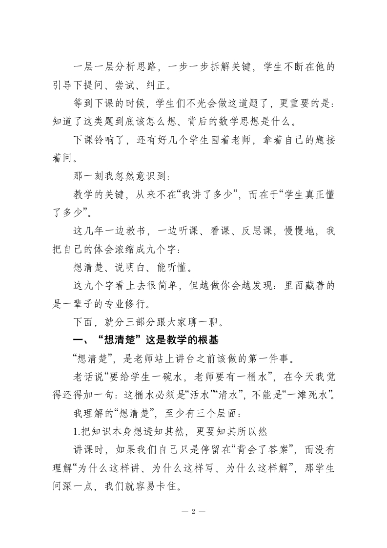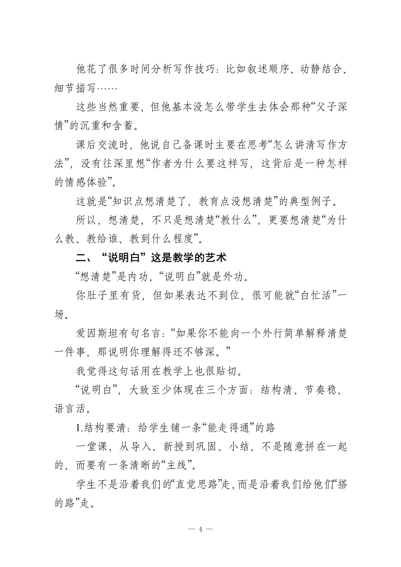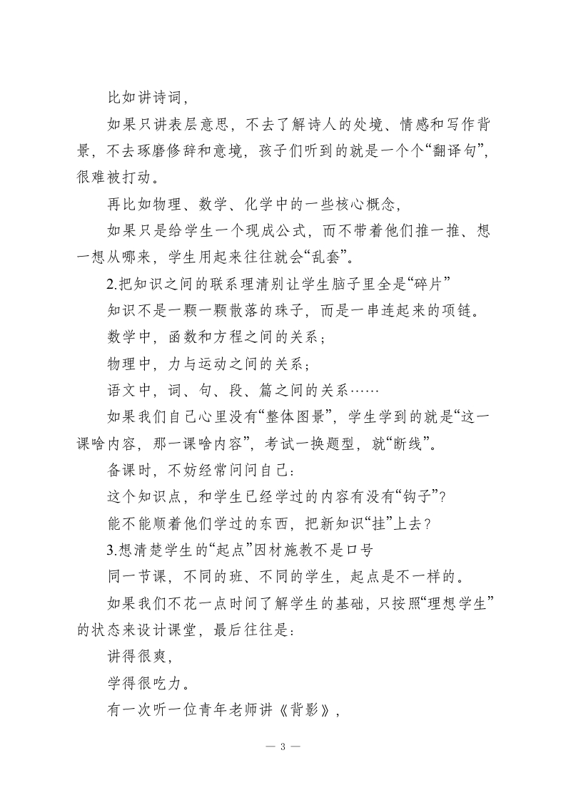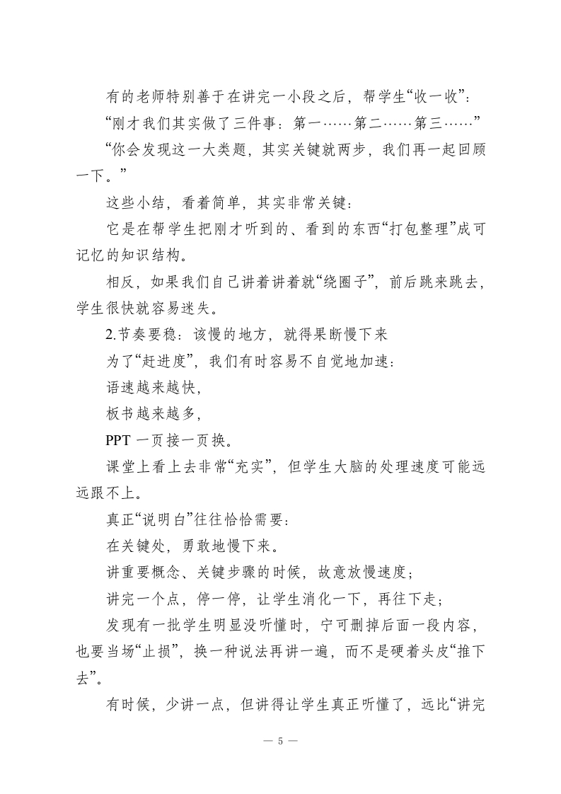 提升课堂教学质量,校长讲话:满堂灌了20年!恨不得掰开揉碎喂给学生!各位老师:大家好。韩愈说过:“师者,所以传道受业解惑也。”这句话我们太熟悉了,几乎人人都会背。可是在今天这个信息爆炸、节奏飞快的教育环境下,真正做到“传道授业解惑”并不容易。课时有限、任务繁重、要求越来越高,我们怎么在一节又一节有限的课堂中,把课上“实”、上“准”、上“到学生心里去”?这成了摆在我们每个人面前的一个现实问题。我自己刚刚站上讲台那会儿,其实也跟很多年轻老师一样特别怕“讲不完”。总觉得这也重要,那也不能漏,一节课恨不得从头讲到尾。课堂上我口干舌燥,自我感觉“输出满满”,下课一看学生的眼神,基本是“满脸问号”。有一次一个学生课后跟我说:“老师,你讲得太快了,我们根本跟不上。”这一句话真的是当头一棒,让我开始认真反思:我这么卖力地讲,真的有用吗?问题到底出在哪儿?后来,我开始“偷师学艺”,抓住每一次教研的机会往老教师的课堂里钻。有一节数学课,我到现在都记得特别清楚:那位老师整整一堂课,就讲了一道题。看起来内容“不多”,但他是怎么讲的呢?1