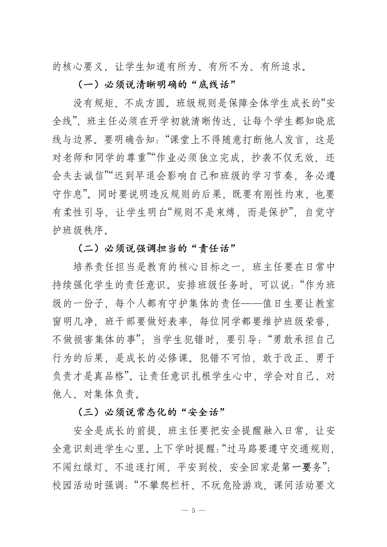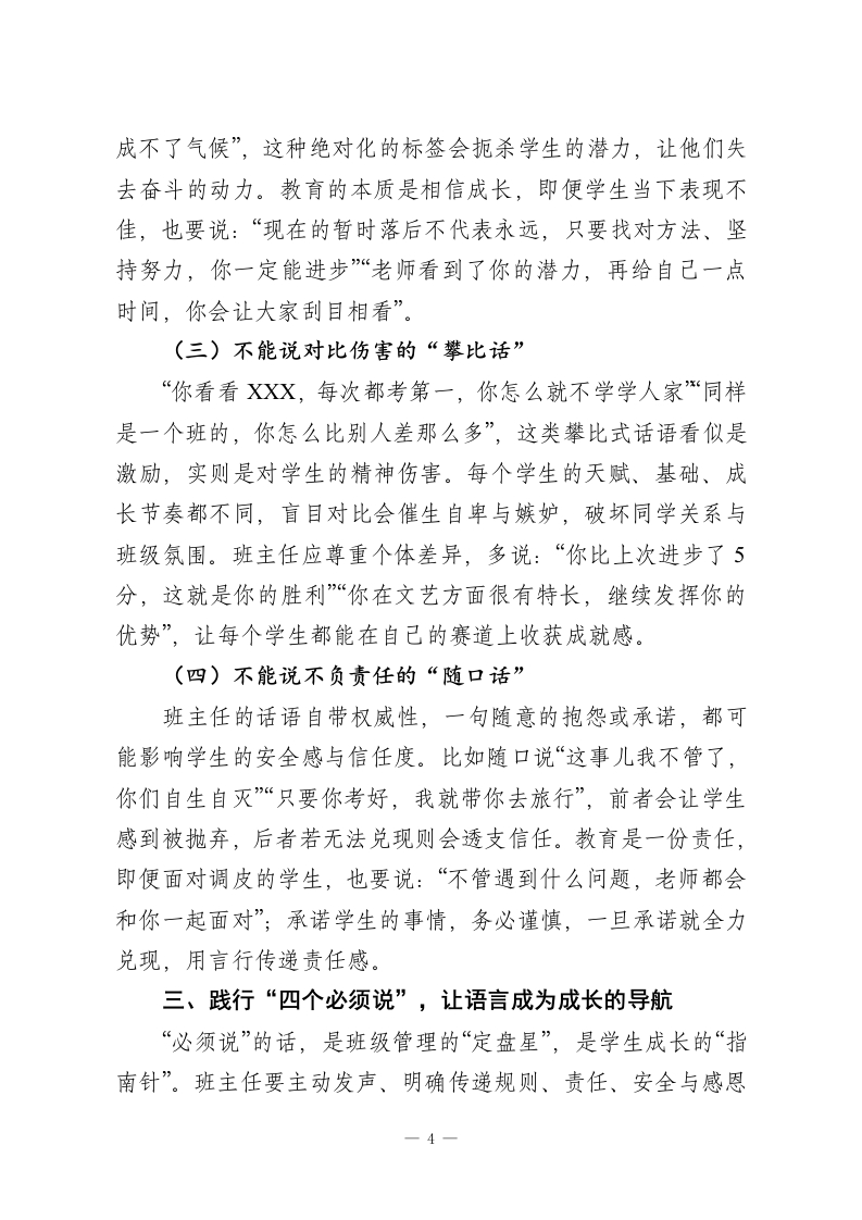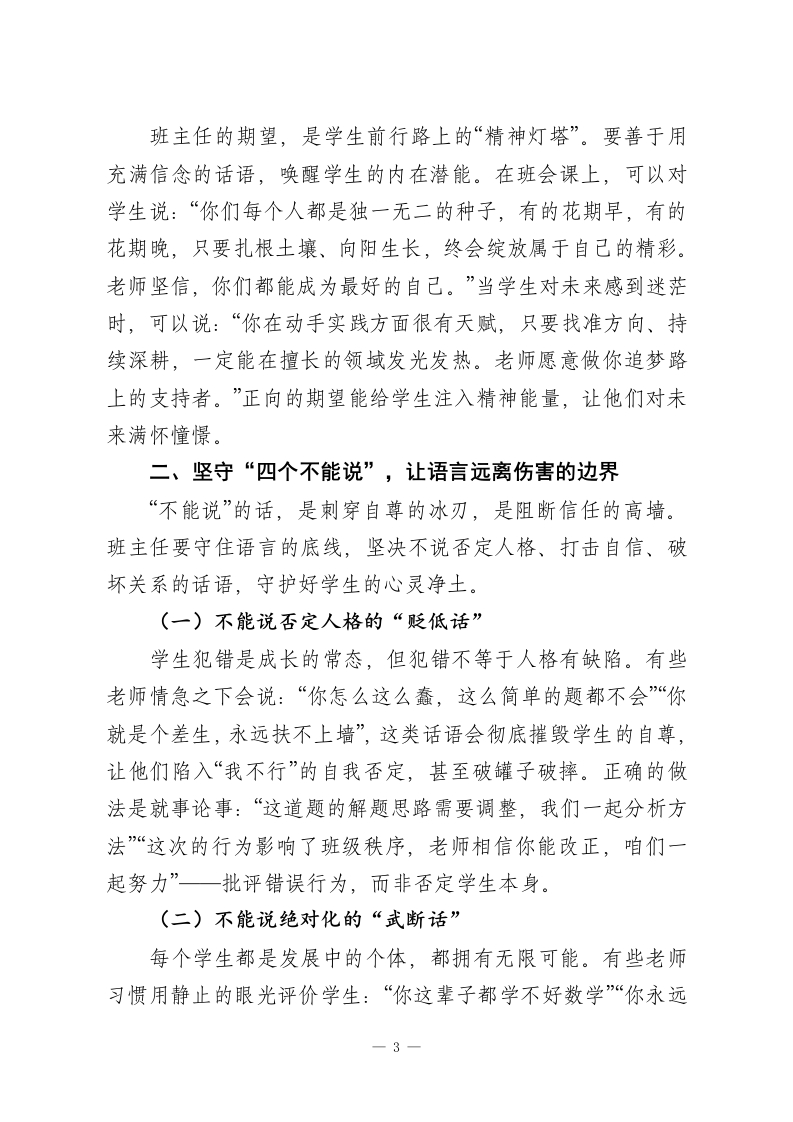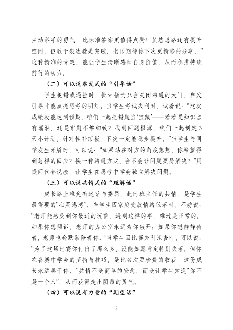 校长在班主任会上发言:四个可以说、四个不能说、四个必须说各位班主任老师:大家下午好!今天我们齐聚一堂,聚焦班级管理中最质朴也最具力量的课题一一语言的育人艺术。班主任是学生成长路上的精神摆渡人,我们的每一句话,都可能成为照亮学生心灵的微光,或是不经意刺痛成长的荆棘。教育家苏霍姆林斯基曾深刻指出:“教育的本质是心灵唤醒心灵,而教师的语言,正是唤醒的钥匙。”同样的教育意图,不同的语言表达,往往会收获截然不同的育人效果。今天,我想结合一线实践与大家探讨“四个可以说、四个不能说、四个必须说”,愿我们以言为炬,用语言的温度与力量,护航学生成长之路。一、善用“四个可以说”,让语言成为成长的养分“可以说”的话,是滋润心灵的春雨,是点燃自信的火种。班主任要让语言成为连接师生情感的纽带、引导学生前行的阶梯,多说有温度、有智慧、有力量的话语。(一)可以说具象化的“肯定话”每个学生都渴望被看见,尤其是那些藏在细节里的努力。笼统的“你真棒”远不如具体的肯定更有穿透力。当学生作业书写进步时,不妨说:“你最近的作业一笔一划都透着认真,连标点符号都格外规范,看得出来你每天都在悄悄下功夫,这种坚持太可贵了!”当学生课堂发言不够完美时,可以说:“今天你1