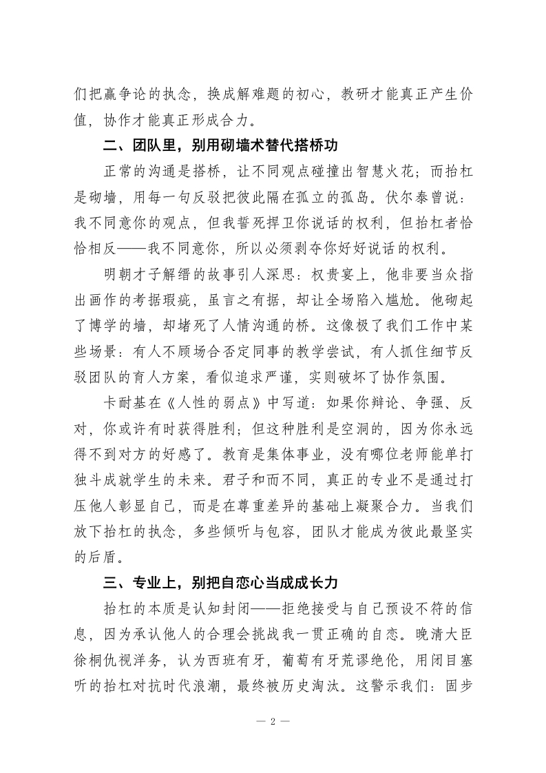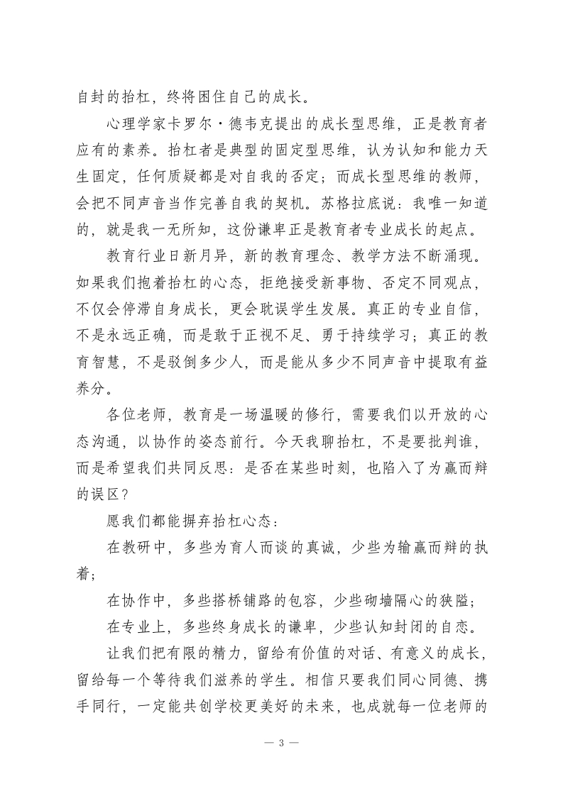 校长在教师大会上讲话:抬杠,没有好处!各位老师:大家上午好!今天借着全体教师大会的机会,想和大家谈一个看似日常却影响深远的话题一一沟通与协作中的“抬杠”现象。教育是一场需要同心协力的修行,我们每天既要与同事探讨教研、共谋育人良策,也要与学生沟通心灵、引导成长方向。而“抬杠”这种行为,就像协作路上的绊脚石,既消耗彼此精力,也可能影响育人实效。今天,我想和大家一起看清它的本质,更要共同规避它的影响。一、教育中,别让输赢心替代育人志和爱抬杠的人沟通,恰似对着墙壁打乒乓球一一我们传递的专业思考、育人建议,往往会被原封不动甚至带着抵触情绪反弹回来。他们不在乎逻辑是否通顺,不在乎事实是否准确,更不在乎教育实效如何,只执着于把你怼回去的口头胜利。这种为辩而辩的心态,在教育场景中并不少见:教研活动上,有人不为优化教学方案,只为证明自己的观点更高明;讨论学生问题时,有人不聚焦解决办法,只为反驳他人的建议。就像《世说新语》中记载的孙盛与殷浩,为论《易》理争到饭凉四次、险些动手,最终却与真理渐行渐远。教育工作从来没有输赢局,只有育人责。叔本华说:辩论的唯一目的是胜利,而不是真理,但我们的使命不是在口舌之争中占据上风,而是在专业探讨中凝聚共识、惠及学生。当我1