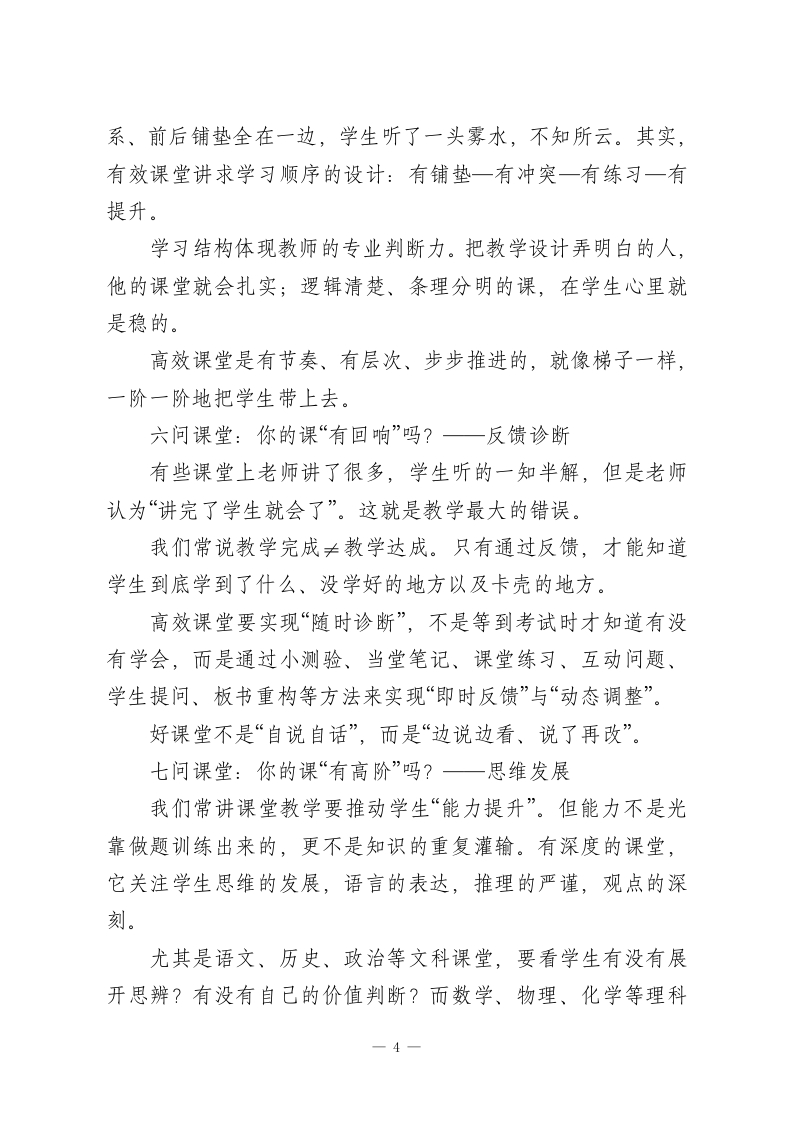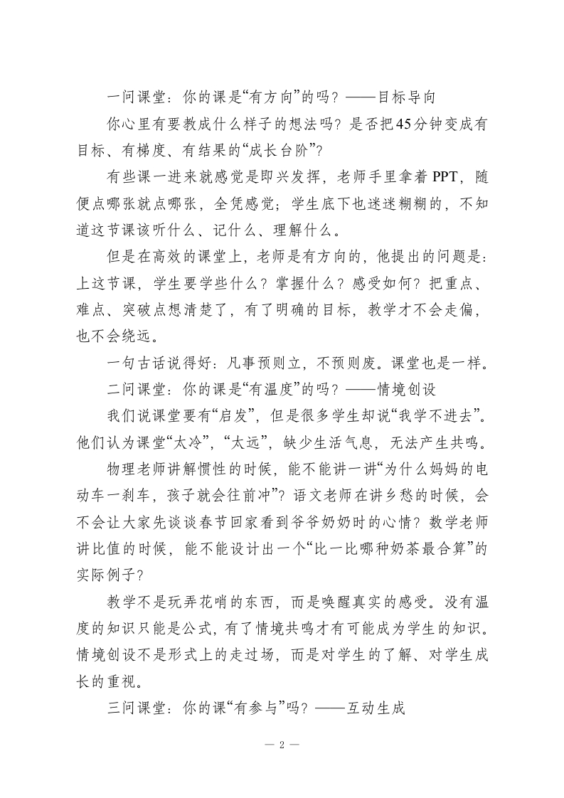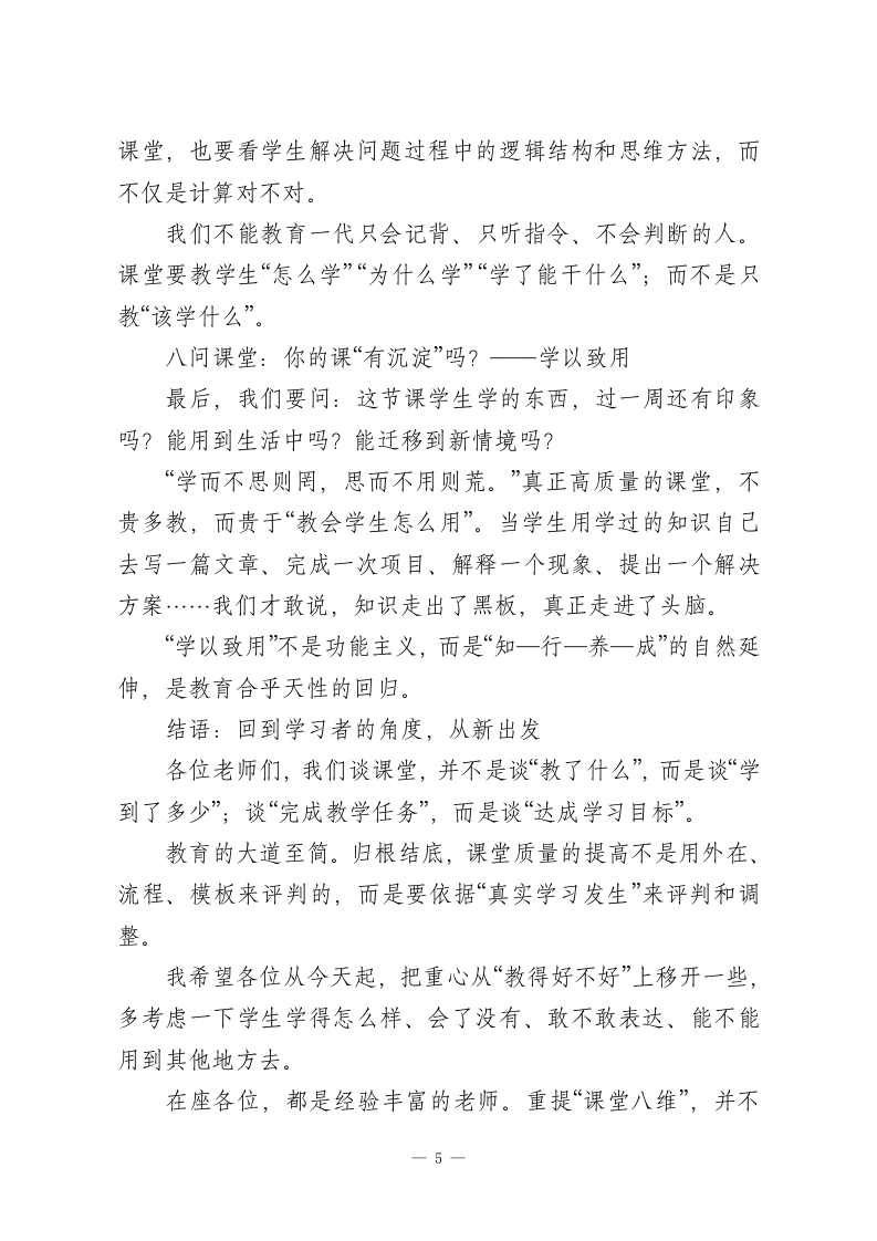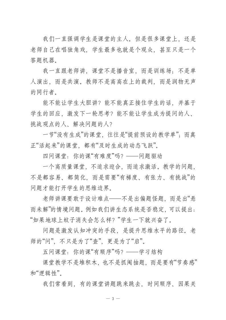 校长在课堂教学质量提升工作会上的讲话:一堂课到底该怎么上?这8个维度,给课堂质量精准“体检”!各位老师:大家好!今天召开这次教学质量诊断和课堂教学工作推进会,大家聚在一起,目的都是一样的:一句话一把课上好说起来很简单,“把课上好”这四个字几乎成了每个老师嘴边的目标。但是真正做起来,每个老师心里都明白,一堂课上得好不好,并不是PPT做得好不好看,也不是教案写得整不整齐;归根到底,是学生愿不愿意听,能不能理解,有没有收获。在今天教学评估“指挥棒”越来越多元的情况下,在“双减”背景下,我们比以往任何时候都要明白一个道理:课堂是立校之本、育人之基。学校想要提高教学质量,最根本的还是要从堂堂课、节节课上入手。不能做流量型的“炸场课”,也不能沉迷于粉饰式的“作业本美化”,而要实实在在地提高“课堂含金量”今天不讲套话,也不用政策口号,我就想和大家把提高课堂质量的八个关键维度掰开揉碎、接地气地再聊一聊。不是新概念也不是虚思维,而是一线老师每天都会遇到的“八个课堂面孔”。下面我会用一种轻松直白的八问课堂方式把这八个维度讲清楚,希望对大家有所启示。1