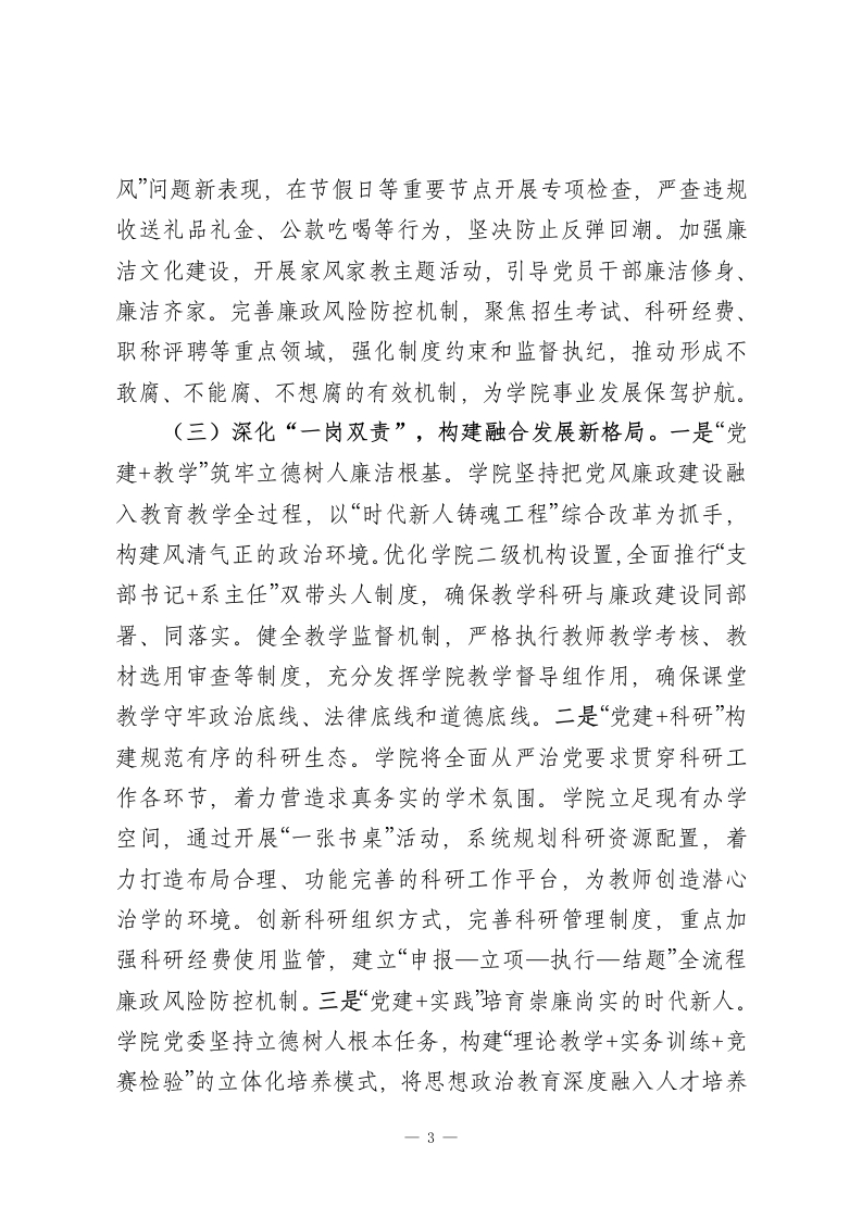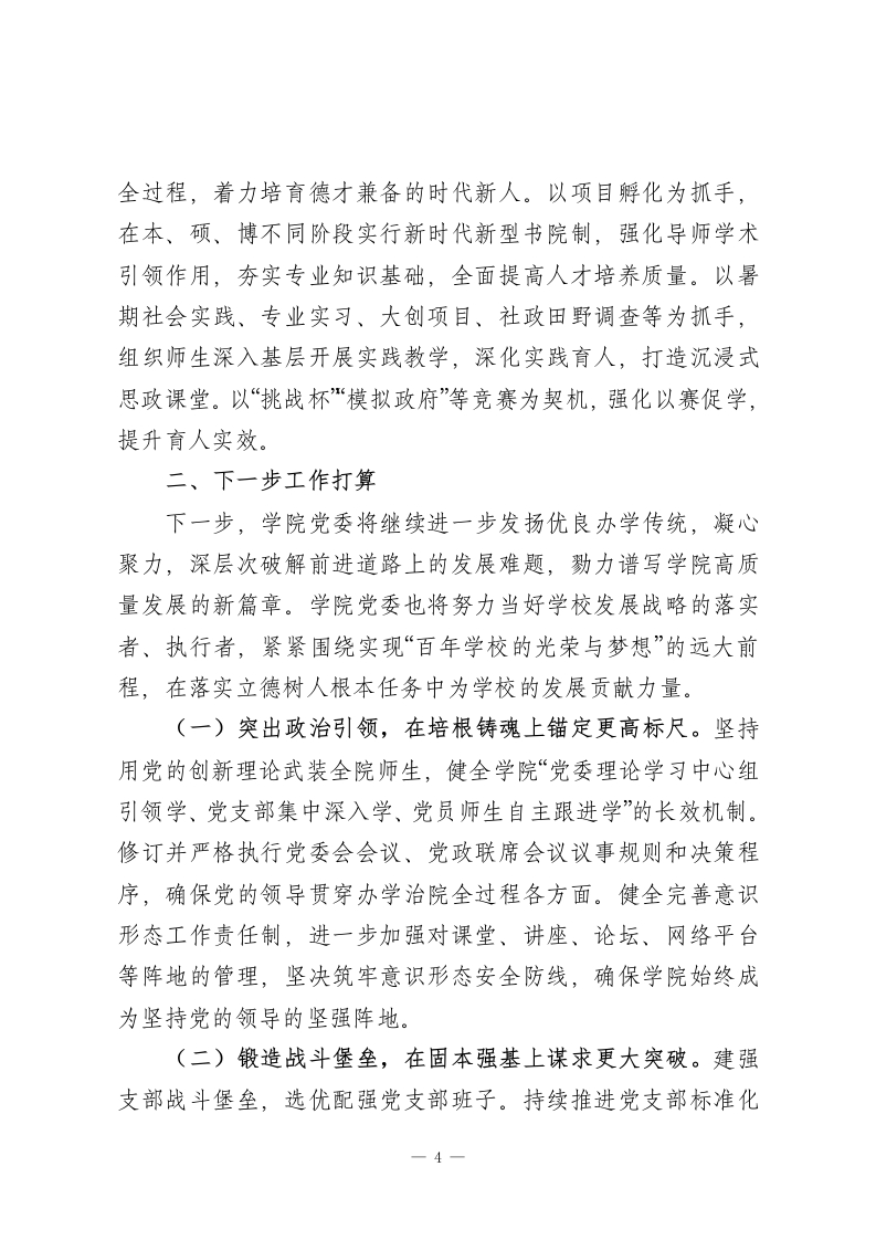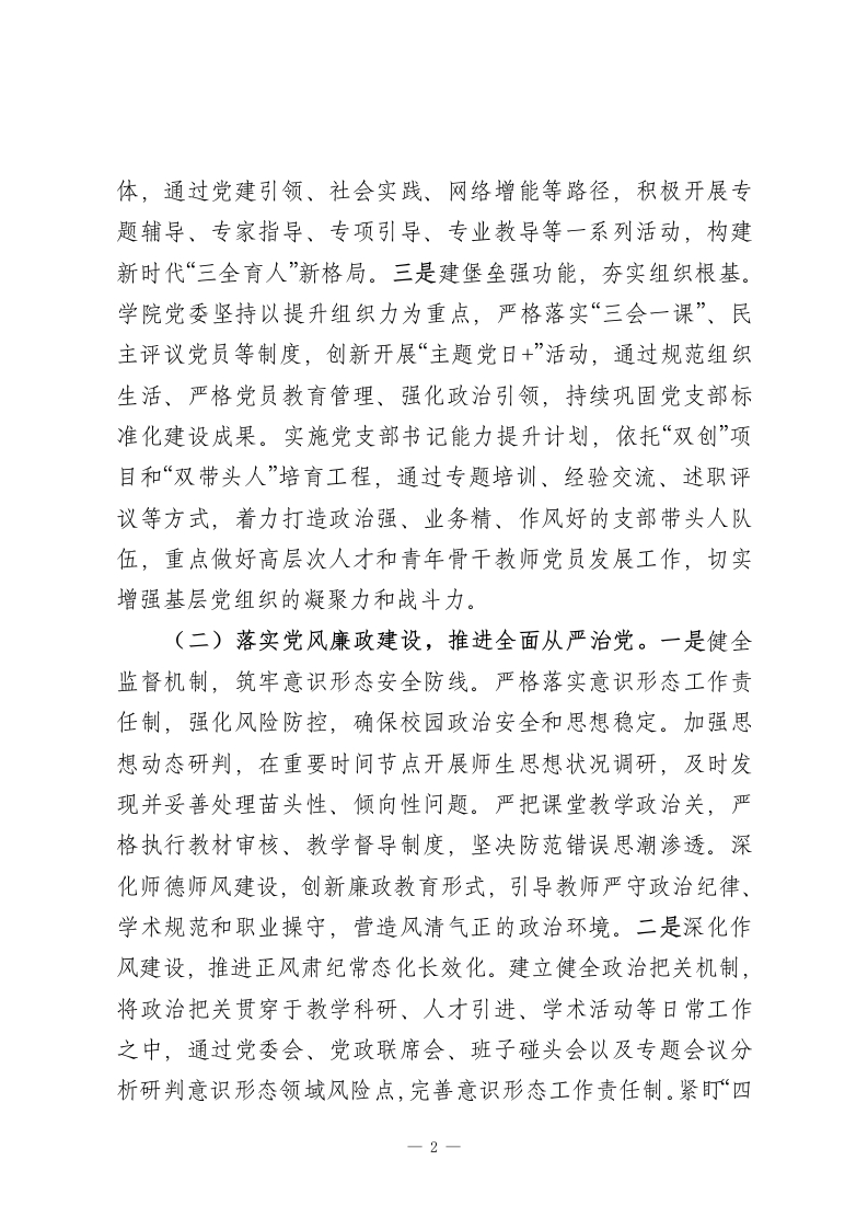 学校党委2025年抓基层党建工作述职报告2025年,学院党委坚持以习近平新时代中国特色社会主义思想为指导,深入学习贯彻党的二十大及二十届三中、四中全会精神,以“抓党建促发展”为工作理念,聚焦“双一流”建设,围绕“教学兴院、科研强院、实践助院”的发展目标,构建“学理论强思想聚主责谋发展”工作格局,通过“党建+”工作模式推动党建工作与事业发展深度融合,扎实推进学院各项事业高质量发展。一、主要工作情况(一)聚焦思想政治建设,履行党建主体责任。一是聚主责明方向,强化政治建设。以习近平新时代中国特色社会主义思想为指导,全面贯彻党的二十大和二十届历次全会精神,以政治建设为统领,坚持把政治建设摆在首位,严格落实理论学习“第一议题”制度,深刻领悟“两个确立”的决定性意义,增强“四个意识”、坚定“四个自信”、做到“两个维护”,在理论学习上多谋划,在“学懂弄通做实”上下功夫,在理论实践结合上落实处,在促进学院高质量上见成效。二是强党性提站位,筑牢思想根基。结合师德师风建设和时代新人铸魂工程,学院党委充分发挥中国特色社会主义教育的育人优势,将思想政治工作根植于学科体系、教学体系、教材体系、管理体系、网络体系建设中,依托党校、团校、青年大学习、形势与政策课、启航工程等载1