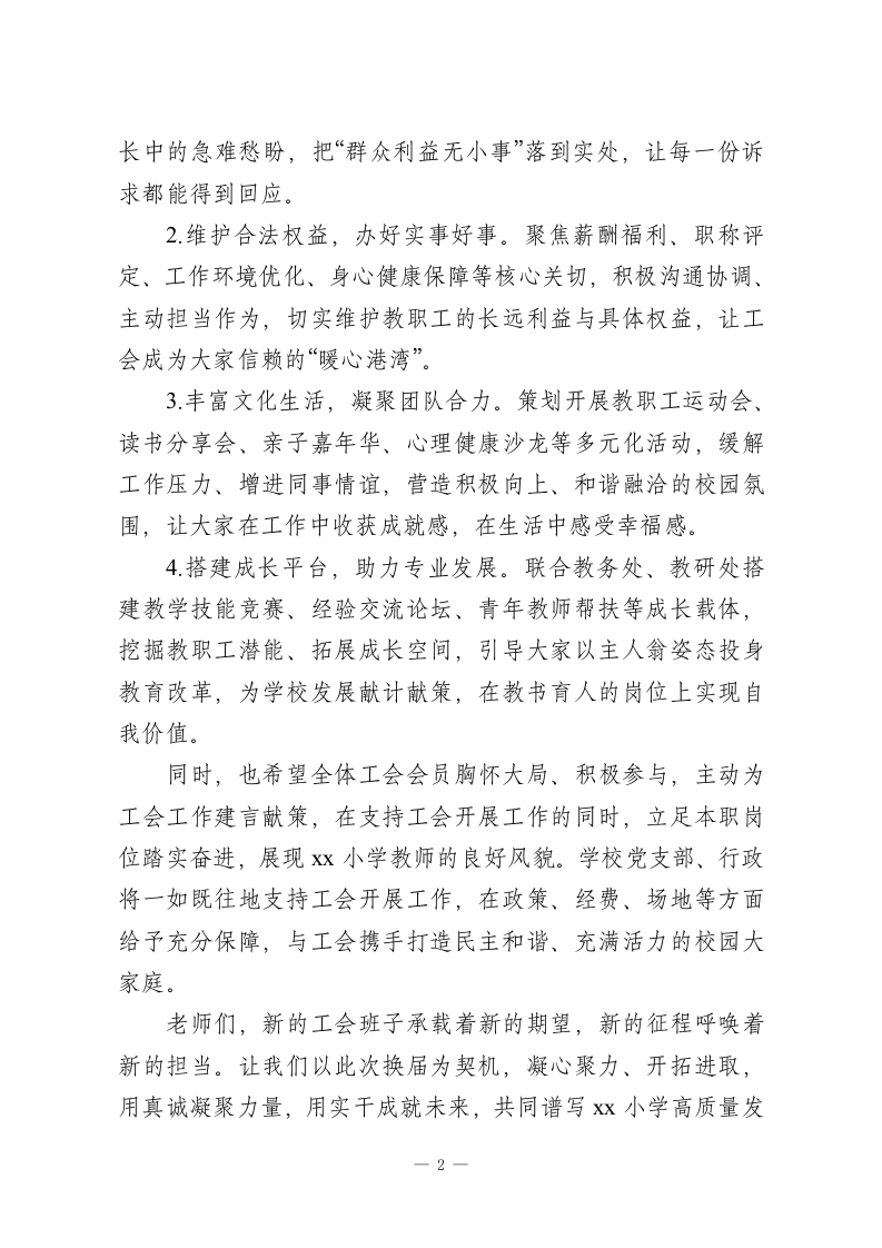 学校工会换届选举大会校长讲话:聚力服务暖人心,共筑校园新未来各位老师、各位会员:大家上午好!今天,我们欢聚一堂,共同见证Xx小学第七届工会换届选举大会的隆重召开!这是全校教职工政治生活中的一件大事,更是学校“十五五”规划推进关键期,凝聚人心、共促发展的重要举措。在此,我代表学校党支部、行政,向大会的顺利召开致以最热烈的祝贺!向全体工会会员致以诚挚的问候!工会作为党联系教职工的桥梁纽带,是教职工利益的忠实代表,其组织建设直接关系到校园的和谐稳定与教职工的幸福指数。为确保此次换届选举工作规范有序,学校专门成立筹备小组,在镇教育工会的精心指导下,多次召开专题会议磋商细节,通过“自下而上推荐+民主协商”的方式确定候选人名单,全程严格遵循《工会法》规定,充分发扬民主、尊重民意,力求将大会开成一次凝聚共识、务实奋进、团结向上的盛会。当前,学校正处在高质量发展的关键阶段,“十五五”规划的各项任务需要全体教职工凝心聚力、并肩攻坚。新当选的工会委员会,肩负着全体会员的信任与重托,希望你们牢记工会宗旨,锚定学校中心工作,以服务教职工为核心,切实履行好建设、参与、教育、维权的职能:1.筑牢服务初心,倾听职工心声。建立“线上意见直达通道+线下代表接待日”双轨机制,主动关心教职工在工作、生活、成1
