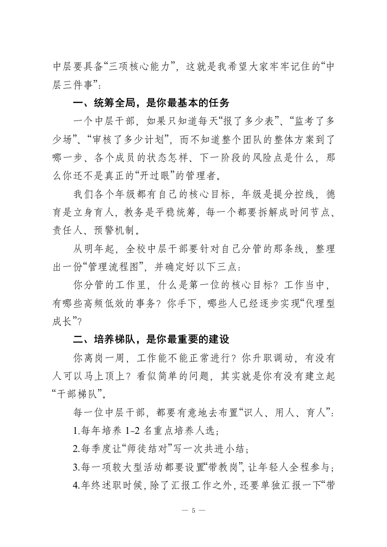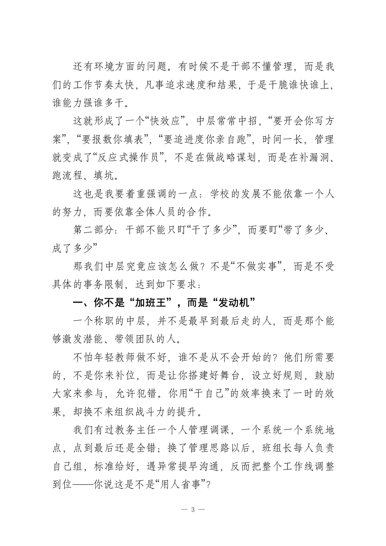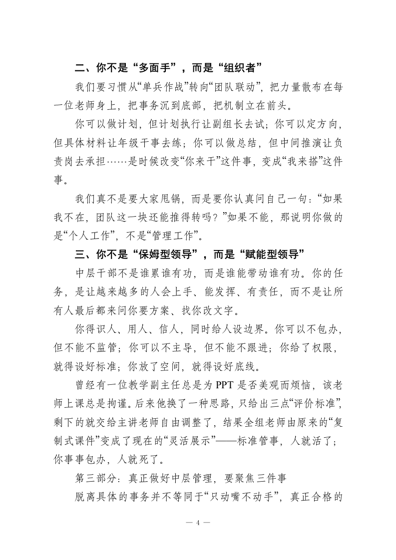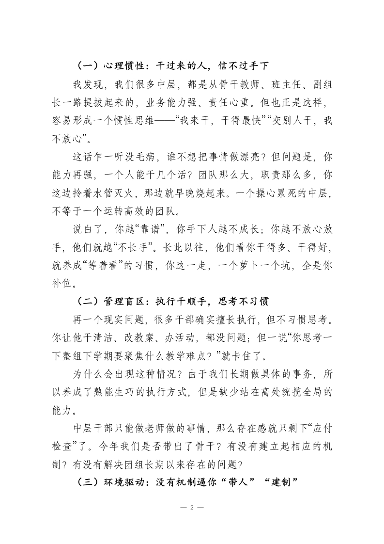 学校行政中层班子会上,校长讲话:从“忙碌感”到“成效感”,走出低效勤奋,带团队干成事!各位行政中层同仁:大家下午好!今天这场会,我想认真地、坦率地,跟大家聊一聊我们中层管理的“常见病”和“解决办法”。这些年,我越来越觉得,我们学校不少中层骨干,确确实实是好同志:责任心强、能吃苦耐劳、早来晚走、事必躬亲,累得焦头烂额,自己都快成“多面手”“全能型”了。但问题来了:你忙是你在忙,结果却不是团队在产出。有经验的领导都知道,管理岗位最大的误区,就是陷进去了,出不来了。埋头苦干有干劲,但如果一直“手把手”“亲历亲为”,忽略了统筹协调、激发团队,那早晚精力被掏空,团队也被“管废”。有位一线校长说得好,中层干部最怕的状态,不是偷懒摆烂,而是“低效的勤奋、瞎忙的充实”。听起来像句笑话,但现实中还真不少干部陷在里面,浑身汗,全是白出。所以今天,我想和大家换个角度,不讲职责、不讲规章,专门讲一件事:怎么从忙中脱身,把自己从事务的泥潭里拔出来,真正做到带团队干成事。第一部分:我们为什么会陷进“具体事”,出不来?1