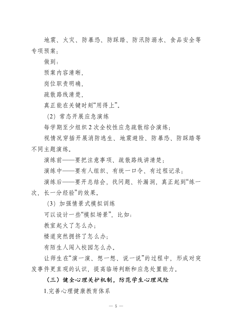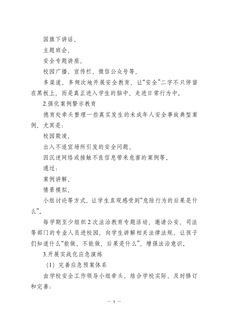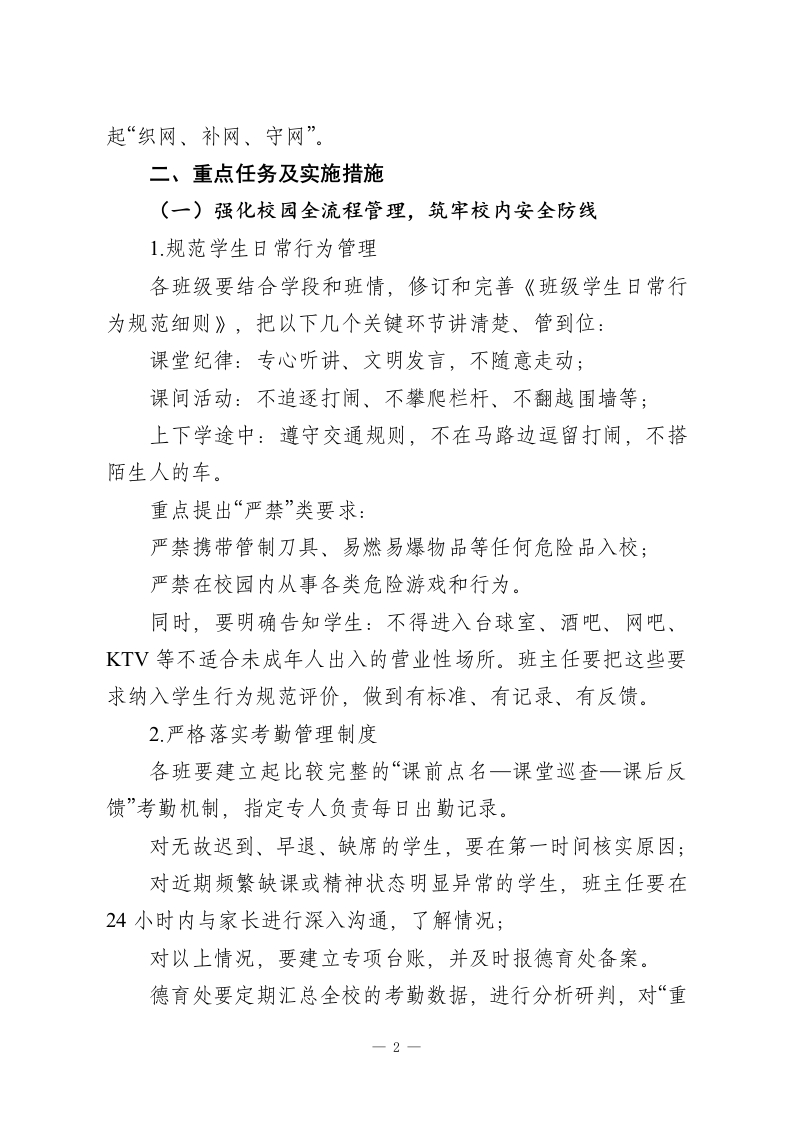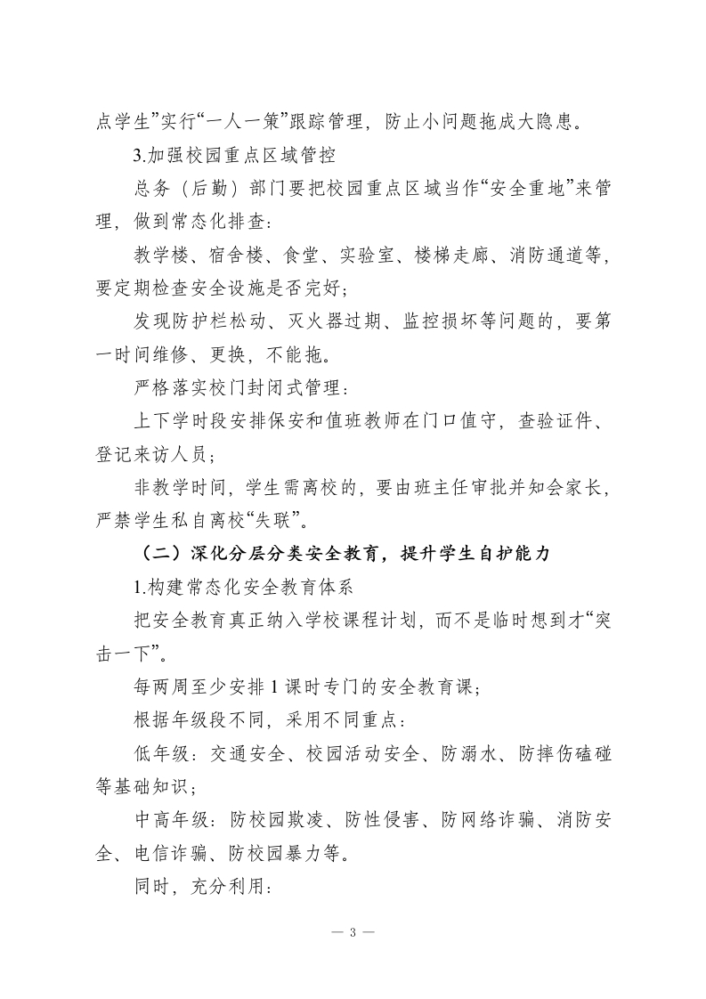 学校加强校园管理与安全教育工作实施方案为深入贯彻落实国家关于未成年人保护和校园安全工作的一系列指示精神,真正把“安全”这根弦绷紧、拉直,切实筑牢校园安全防线,保障未成年学生身心健康与生命安全,营造平安、和谐、有序的育人环境,结合我校实际和当前校园安全工作面临的新形势、新要求,特制定本实施方案。本方案适用于全校所有年级、班级及全体教职工,请大家结合岗位职责认真执行,做到知其然,更要知其所以然。一、总体要求坚持以…为统领,牢固树立“安全第一、预防为主、综合治理”的理念,把学生生命安全和身心健康始终放在最显著的位置。围绕“压实责任、健全制度、强化教育、协同联动”这四个关键点,通过:压实校园安全工作责任链条,完善学校安全管理制度体系,把安全教育做深做实,搭建家校社协同联动机制,全面排查并整治校园及周边的各类安全隐患,精准防控不同类型的安全风险,逐步构建起“全链条、全方位、全覆盖”的校园安全管理体系,为学生全面健康成长保驾护航。一句话概括:安全工作不是哪一个部门的事,而是全校一—1