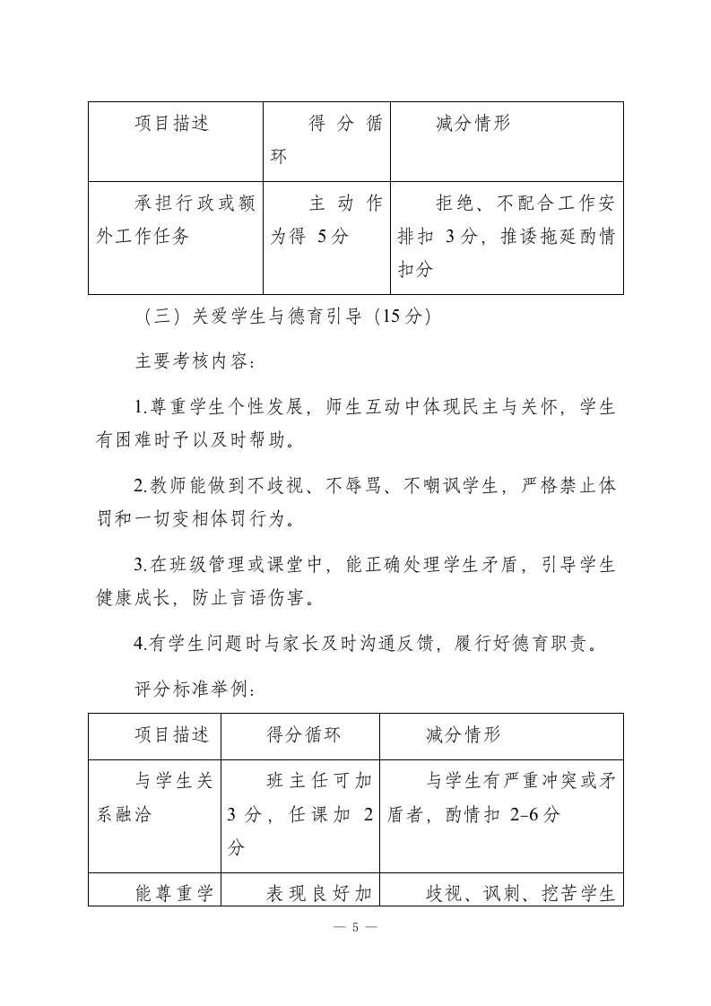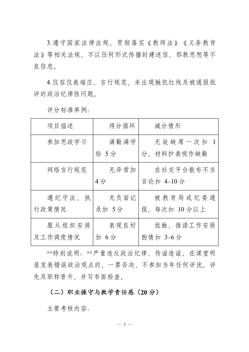 学校师德师风考核制度(2025.12修订)一、指导思想为全面贯彻落实党的教育方针,进一步加强教师队伍思想政治建设和职业道德建设,着力解决教师队伍中存在的师德师风问题,强化教书育人职责意识,切实提高教师思想政治素质和职业道德水平,建设一支师德高尚、作风严谨、业务过硬的教师队伍,根据《中华人民共和国教师法》《义务教育法》《未成年人保护法》《中小学教师职业道德规范》《新时代中小学教师职业行为十项准则》和Xx市教育局相关文件精神,结合我校教育教学和教师队伍实际,特制订本考核制度。二、考核原则1.坚持导向性。始终把师德摆在教师队伍建设的首位,强化为人师表意识,坚持育人为本、德育为先。2.坚持多元评价。注重教师日常行为记录与平时表现,做到自评他评结合、过程结果并重,扩大公众参与度。3.坚持量化与定性结合。既注重德育表现的可量化数据,又注重对教师思想、作风、态度的综合分析研判。4.坚持奖优罚劣原则。真考、真评、敢于碰硬,对表现优秀教师予以奖励表扬,对师德失范者严肃处理,绝不姑息。一1
