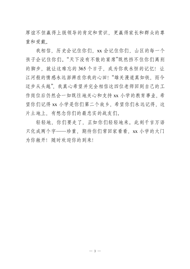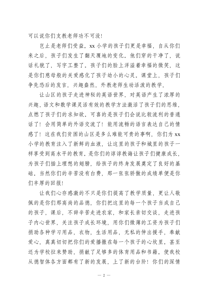 在欢送支教老师会上,校长讲话,感谢你们为山区教育提供支持作为接受支教学校的代表,我的内心充满了感谢,充满了敬意,也充满了感动!因为教委高瞻远瞩,从义务教育均衡发展的角度着手,采用支教的方式,为山区教育提供了优质的人才支援,也为山区教育的发展提供了强有力的智力支持。我谨代表接受支教学校的全体干部教师和同学,向各位领导表示衷心的感谢,谢谢你们对山区教育的关心和支持!尊敬的..首先请允许我代表x小学全体师生,对你们一年来的辛勤劳动表示衷心的感谢,对这次义教和支教交流活动的圆满成功表示热烈的祝贺!。回顾一年的光阴。那些点点滴滴,犹如电影般浮现脑海,令我心潮澎湃,百感交集。此刻,任何语言都变得苍白,因为没有文字能确切表达我们心中的恋恋不舍,以及那份离别的失落?忘不了和你们共同工作的日日夜夜,一一当你们认真钻研教材,甚至备课到深夜的时候我们知道了什么叫敬业,当你们穿梭于各年级听课的时候,我们懂得了什么叫学习,当你们在教研会上发表见解的时候,我们知道了什么叫坦诚,当你们上示范课的时候,我知道了什么叫高水准。这样的365个日日夜夜,让我们x小学的全体老师受益匪浅,在你们潜移默化的感染下。老师们的教育观念在不断更新,教学水平在不断提高,1