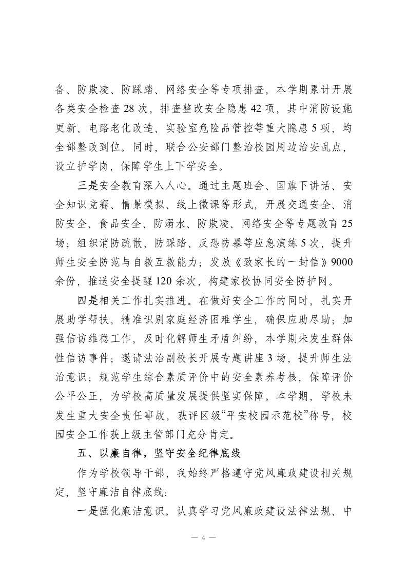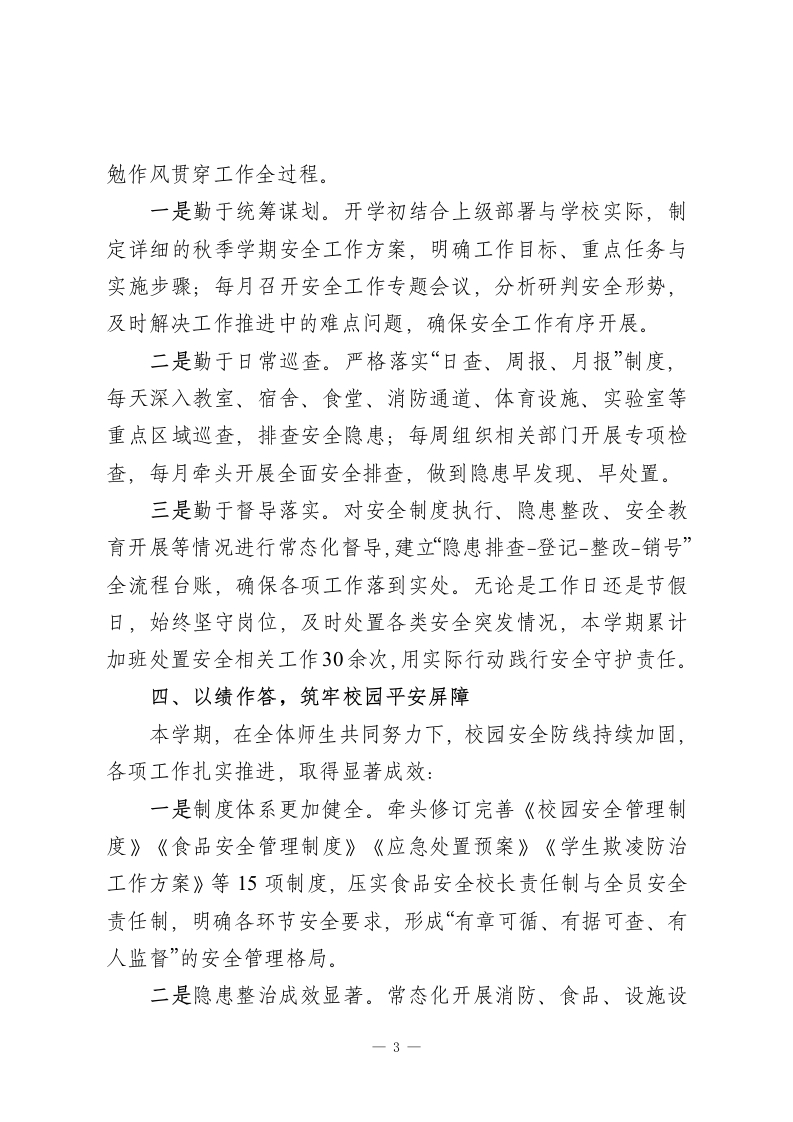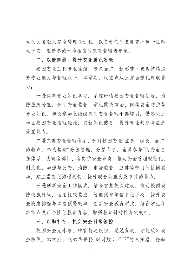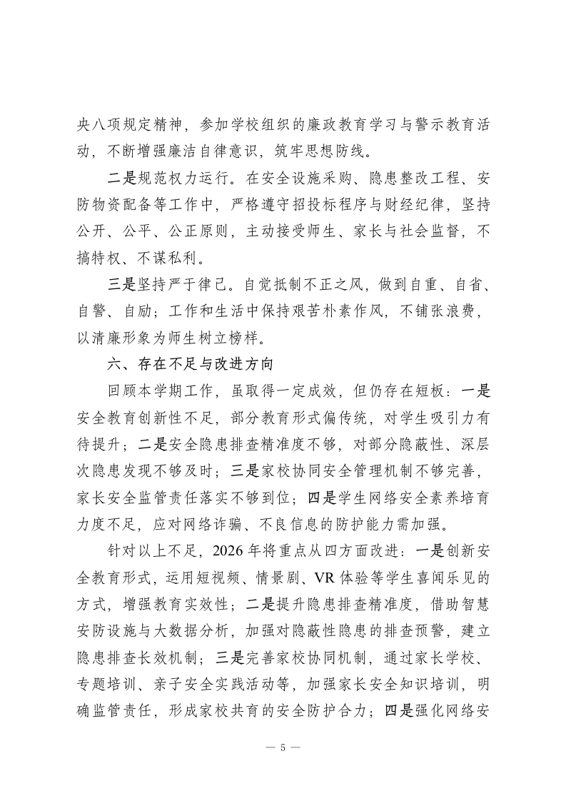 2025-2026学年秋季学期安全副校长工作报告尊敬的各位领导、老师们:本学期,在上级教育主管部门的正确领导下,在学校领导班子的团结协作与全体教职工的大力支持下,我始终坚守“安全第一、预防为主、综合治理”的核心理念,以守护师生生命安全、筑牢校园平安防线为根本职责,认真履行安全副校长岗位职责,统筹推进校园安全及相关领域工作。现将本学期履职情况从“德、能、勤、绩、廉”五个维度作详细汇报,请予评议。一、以德立身,锚定安全育人初心作为分管安全工作的副校长,我深知校园安全是关乎万千家庭幸福的民生工程,更是教育高质量发展的前提保障,必须以强烈的责任担当和高尚的道德情操履职尽责。我深入学习党的创新理论、国家教育安全工作重要指示精神及教育强国建设战略部署,不断增强政治判断力、政治领悟力、政治执行力。始终牢记“为党育人、为国育才”的初心使命,将校园安全稳定工作融入学校发展大局,确保各项工作始终沿着正确政治方向推进。工作中,坚持以身作则、率先垂范,秉持“严于律己、团结协作”的作风,主动配合校长开展工作,补位不缺位、到位不越位。面对复杂安全问题,坚持公平公正、实事求是,广泛听取意见建议,凝聚工作合力。同时,注重自身道德修养,将对学1
