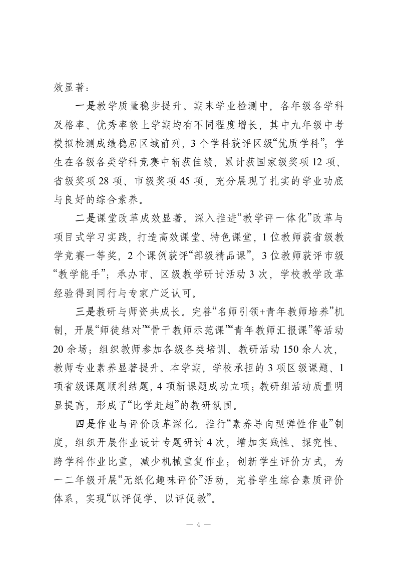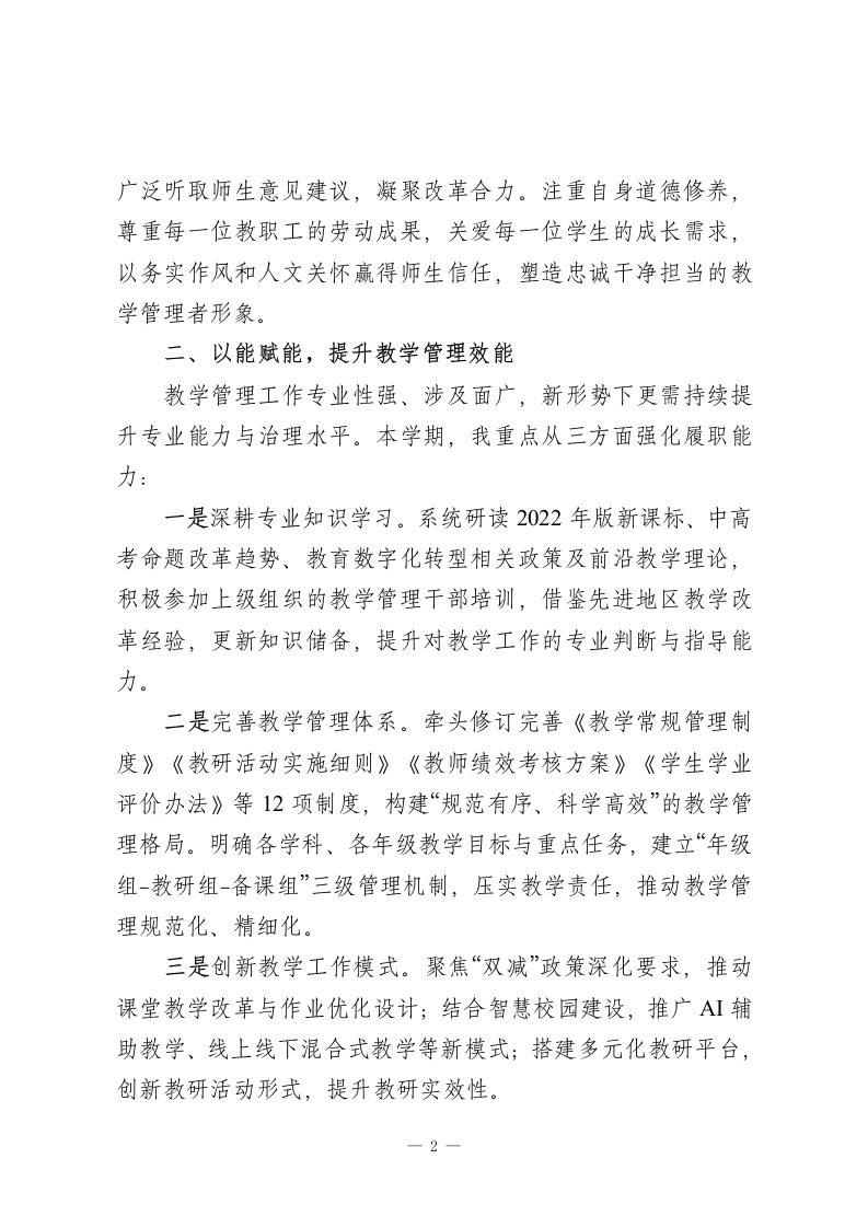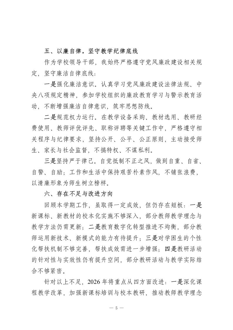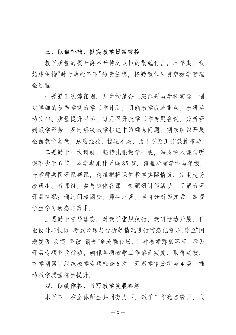 2025-2026学年秋季学期教学副校长工作述职报告尊敬的各位领导、老师们:本学期已近尾声,2026年新春将至。本学期,在上级教育主管部门的正确指导与学校领导班子的团结协作下,在全体教职工的凝心聚力、务实奋进下,我始终秉持“以生为本、质量为核、创新为翼”的教学理念,认真履行教学副校长岗位职责,统筹推进教学管理、教研改革、师资建设、质量提升等重点工作。现将本学期履职情况从“德、能、勤、绩、廉”五个维度作详细汇报,请予评议。一、以德立身,坚守教学育人初心作为教学副校长,我深知教学是学校的中心工作,关乎学生成长与学校发展,必须以高尚的师德修养和强烈的责任担当履职尽责。我深入学习党的二十大精神、习近平总书记关于教育的重要论述及《教育强国建设规划纲要》要求,不断增强政治判断力、政治领悟力、政治执行力。始终牢记“为党育人、为国育才”的初心使命,将“立德树人”根本任务贯穿教学全过程,确保教学工作始终沿着正确政治方向推进。工作中,坚持以身作则、率先垂范,秉持“严于律己、团结协作”的作风,主动配合校长开展工作,补位不缺位、到位不越位。面对教学改革中的难点问题,坚持实事求是、公平公正,1