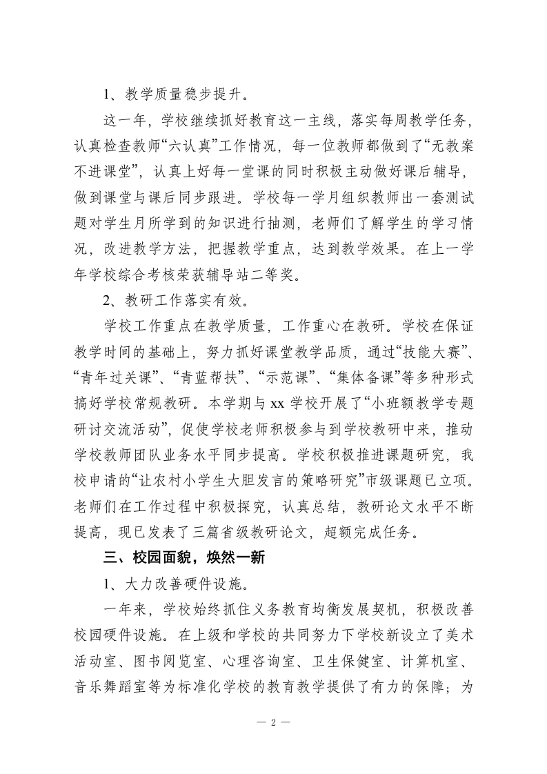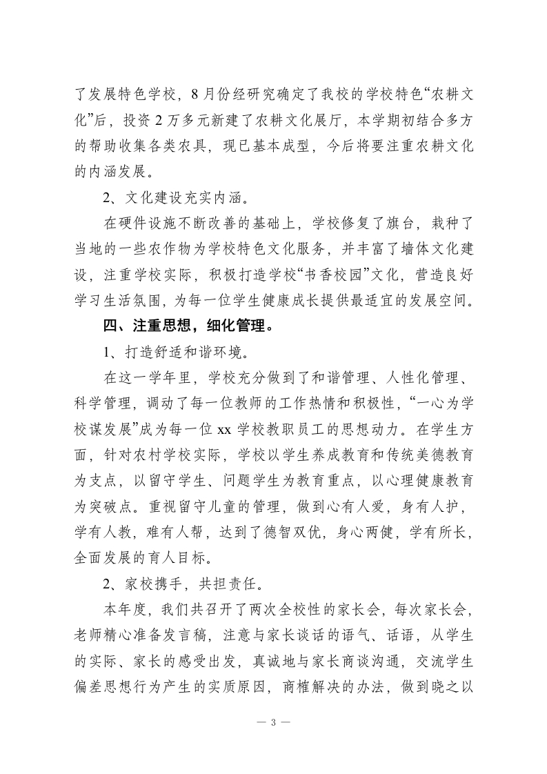 2025年度农村学校工作总结2025年悄然结束了,在这一年里,我校始终坚持以德育为核心,以教学为中心,努力提高教学质量,推进素质教育。学校呈现出教师敬业爱岗,潜心教研,学生勤奋学习,奋发进取,校园书声琅琅,和谐绿色的崭新局面。一、抓好队伍,共同提高1、领导班子团结协作。我们班子成员在工作中分工明确,各司其职,相互沟通,相互信任,和谐相处。本年度班子成员自觉开展学习,从学习中找“差距”,从“差距”中寻发展,加强自我管理,以身作则。强化责任意识、大局意识、管理意识、服务意识、团结意识。在工作面前,我们默默奉献,常常加班加点,牺牲休息时间,毫无怨言;在荣誉面前我们心怀同志,谦让大家。2、教师队伍加强学习。在社会日益发展的今天,知识更新很快,作为知识的传播者,必须加强学习,树立终身学习的理念,挤时间,抽时间学习提高自身综合素质。一年来,根据市教育局年初安排的“质量提升年”活动,结合学校实际开展了一系列的业务学习,不断更新教师的知识观念,努力使自己的教育教学理念走在前列,更好地服务于教育教学工作,同时通过我校承办的“新教师过关课”、“课堂技能大赛”、参加各级教研、国培等多种形式,为老师们提供多种学习途径,拓宽教师视野,提高教师自身素质。二、狠抓常规,效果显著1