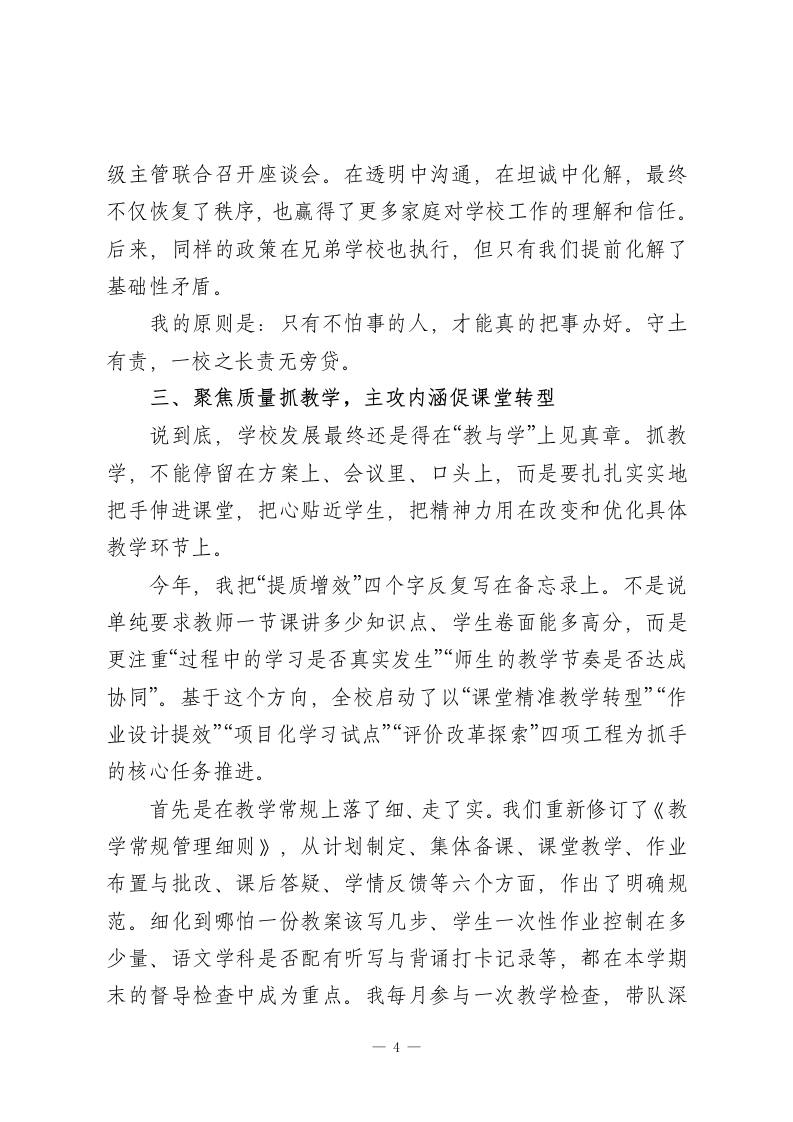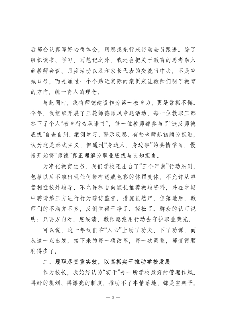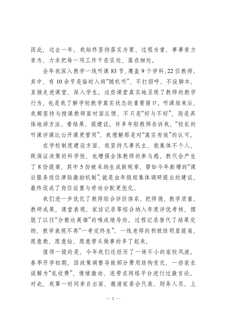 2025年度校长个人述职报告:不靠掌声改教育,靠的是每一次扎实落地!各位领导、各位老师:时间总是在忙碌和追赶中悄然溜走。转眼间,2025年已经画上了句号。这一年,说轻松,那是骗人;说简单,也不现实。我们是在不断地迎接挑战中走过来的,也是在大家的共同努力下稳步前进的。作为学校校长,责任重大,坚守沉静。过去一年里,我以“勤政务实、依法办学、改革创新、情系师生”为工作基本姿态,尽自己最大的努力去履行好自己的每一项职责、守住每一方阵地,努力使学校向着有品质、有温度的发展之路不断前进。今年的工作重点,我将从四个方面的实际情况出发,进行总结和反思,希望各位领导、老师提出批评和建议。一、坚定立场守初心,以思想引领凝聚教育力量在教育这项事业里,“人”的因素始终排在第一位。作为学校管理者,我清楚地认识到:办学的方向要明确,队伍的思想要统一。过去一年里,我把思想建设放在第一位,坚持不等不靠,主动提高政治素养和加强理论学习,把理论当作工作的“清醒剂”、“导航仪”。每周我都会带领班子成员进行集中学习,逐条诵读文件精神,逐句领会教育政策,特别是在学习贯彻新时期基础教育改革要求上,我坚持做到“先学一步、多领悟一点”,每次学习之1