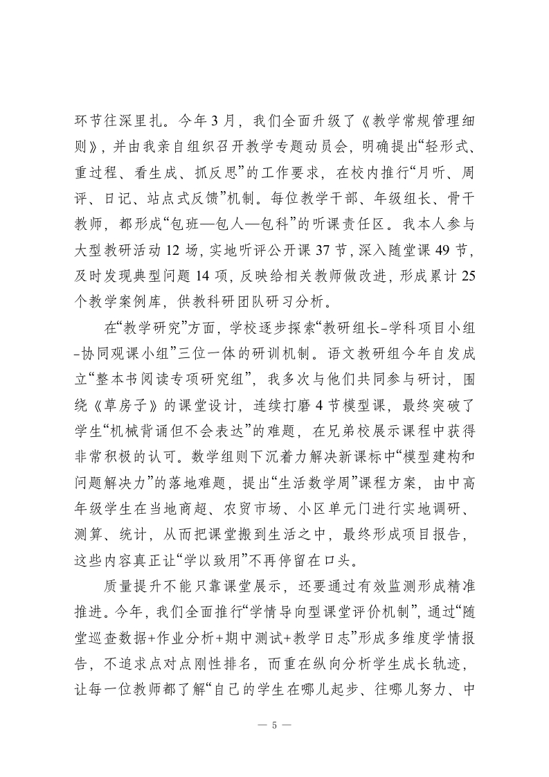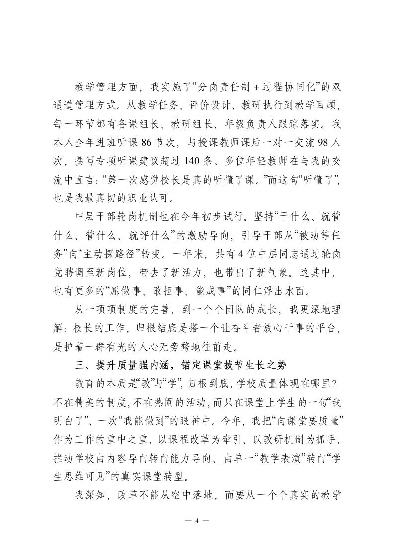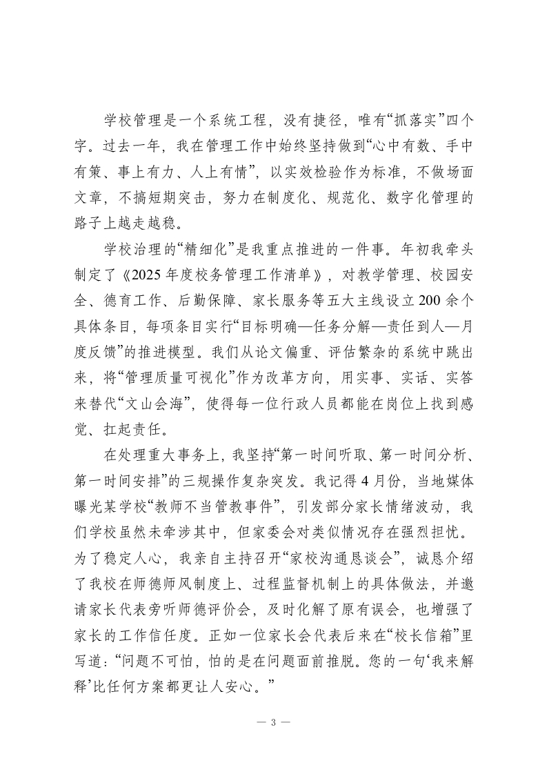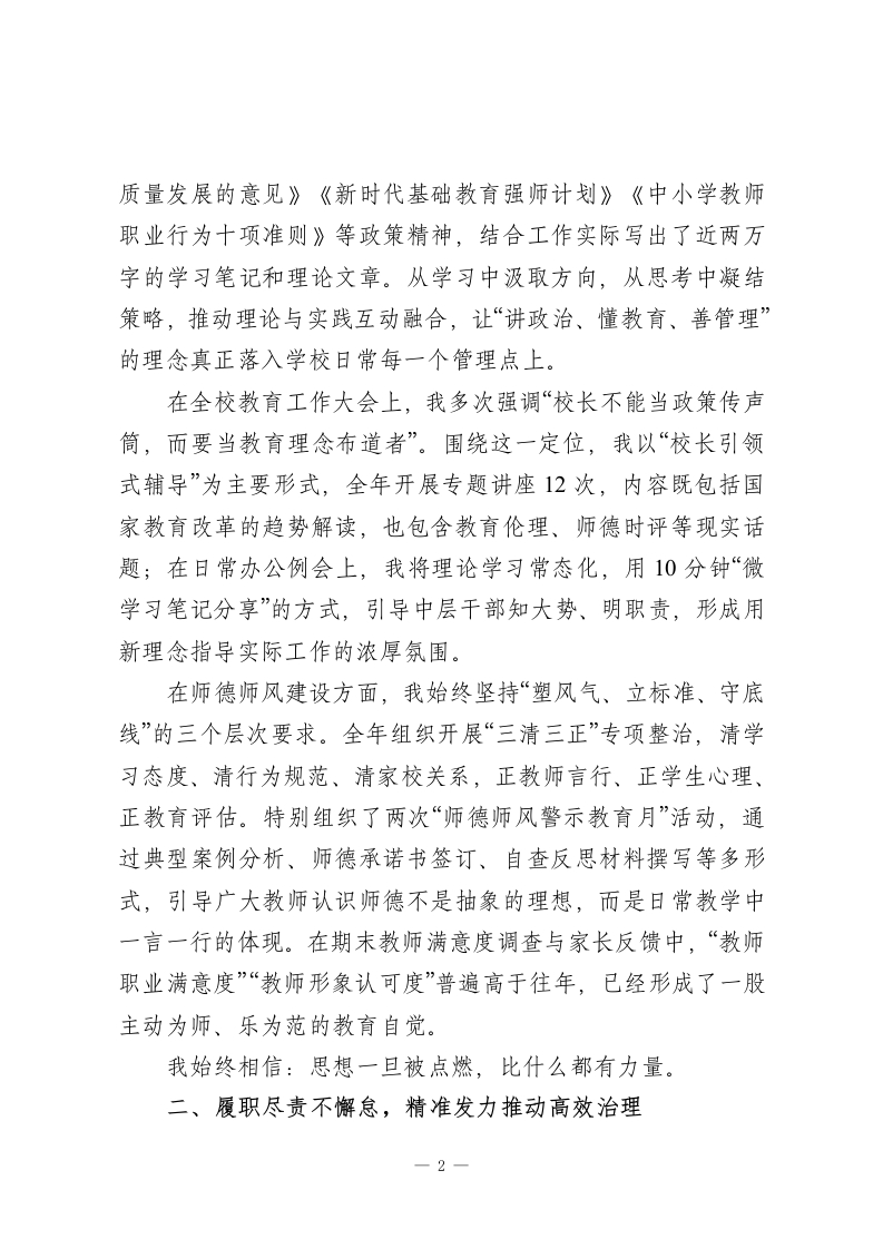 2025年校长个人述职报告:教育这条路,看起来走得慢,其实都算数!尊敬的各位领导、亲爱的同仁:风雨兼程中,我们又走过了一年。2025年是稳重且有意义的一年。这一年,教育政策继续深入实施,“双减”进入到深水区,新的课程方案以及综合素质评价试点开始铺开,社会各界对于学校教育质量的关注也越来越大。在这样一个进退维谷的时间点上,我校一直都没有停滞不前、墨守成规。在上级党委政府及教育主管部门的正确领导下,在全校教职员工的共同努力下,我们默默耕耘,踏实前行,用脚踏实地的行动来争取“稳中求进”,同时用敢于碰硬的精神来谋求创新突破。作为学校的主要负责人,我深知“其身正,不令而行;其身不正,虽令不从”的道理。所以在过去的一年里,我紧紧围绕立德树人的根本任务,以师生为中心,以质量为准绳,以改革为动力,砥砺前行,苦干实干。本人2025年度的履职情况如下,望予评议。一、加强理论学习,筑牢立德树人的思想根基校长不是“指挥台”,而是全校教育方向的“定盘星”。只有用理论来武装自己的头脑,用信念来指引自己的方向,才能在教育纷繁复杂的现实面前不偏航、不懈怠。过去一年里,我把加强理论学习、提高思想境界放在很重要的位置上,坚持每周阅读教育类党政文件,重点学习了《教育部关于加快基础教育高-1