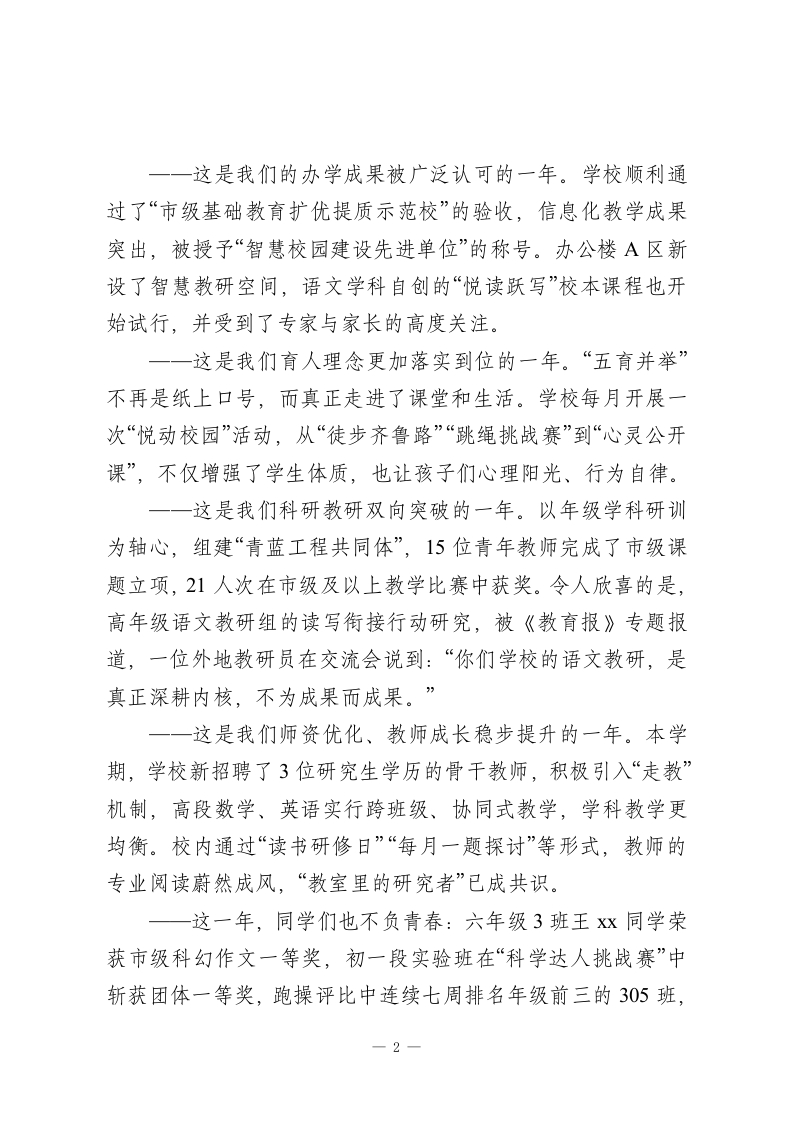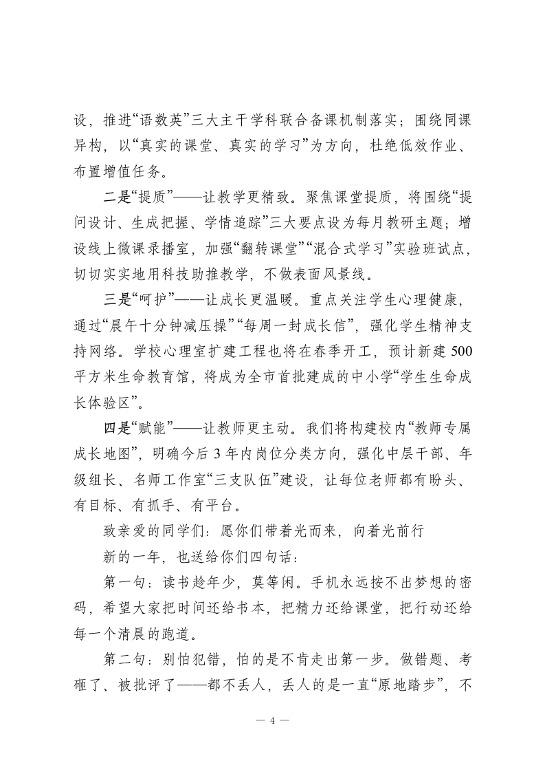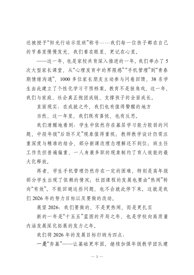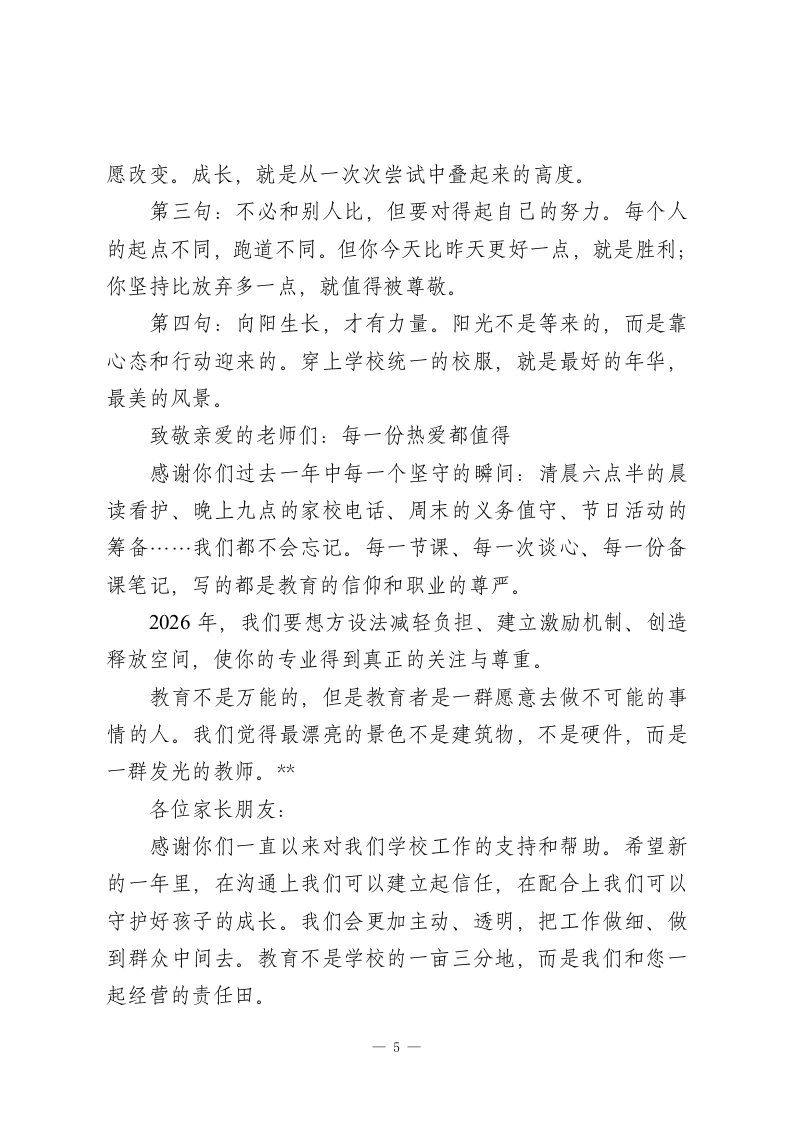 2026年元旦校长精彩致辞:不是更热闹,而是更扎实一一校长用这篇致辞,把教育的分寸讲透了!亲爱的老师们、同学们,尊敬的家长朋友们,以及一直关心支持我们学校发展的社会各界朋友们:骏马送祥辞旧岁,春风逐梦迎新年。值此2026年元旦之际,在书香氤氲、生机犹存的冬日清晨,我代表学校向辛勤耕耘、无私奉献的全体教职工致以诚挚的谢意和新年祝福,向奋发向上、勇敢追梦的同学们致以诚挚的鼓励,同时也向风雨同舟、陪伴孩子成长的家长们,以及一直给予学校温暖支持的社会各界朋友表示最诚挚的感谢!旧岁已展千重锦,新年更进百尺竿。2025年对于全体师生来说,是奋斗的一年,是努力的一年。这既是国家“十四五”规划收官、迈向“十五五”谋篇布局的重要节点;也是我校高质量发展步伐更加坚定、校园面貌不断改善的一年。这一年我们用四个字来概括就是:稳健前进。没有轰轰烈烈的喧嚣,但是每走一步都踏踏实实;没有追风赶潮的浮躁,但是时时刻刻都体现出坚持不懈的精神。回望2025:我们在默默努力,也在悄然闪光这一年,全校师生齐心协力,共同前进,有很多值得回忆与记念的时刻: