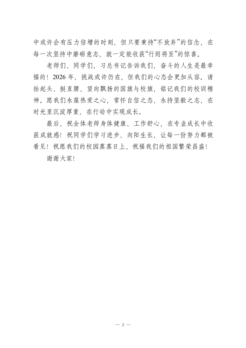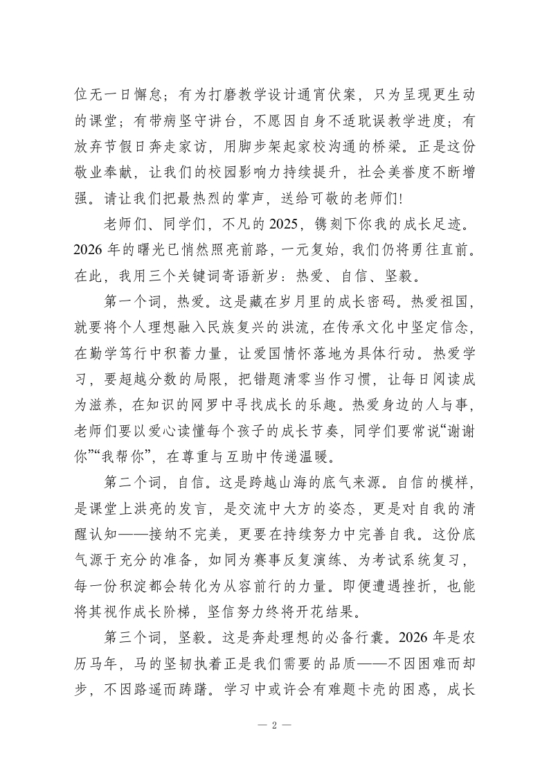 2026年元旦校长致辞:向未来,我们勇往直前尊敬的老师们、亲爱的同学们:大家好!灵蛇辞旧岁,骏马踏春来。我们满载2025年的收获,迎来美好的2026年。2025年,是中国创新驱动发展的高光之年。这一年,我国全球创新指数首次跻身前十,“深圳-香港-广州”创新集群跃居世界榜首;江门中微子实验斩获国际领先成果,“祖冲之三号”超导量子计算机刷新水准,具身智能机器人从实验室走向生活场景。从6G技术试验突破到民用涡轴发动机取证,每一项突破都凝聚着奋斗者的汗水,彰显了中国创新的澎湃动能与大国担当。2025年,是我们校园笃行成长的一年。这一年,同学们在时光里沉淀蜕变:低年级的同学养成了规整有序的生活与学习习惯,高年级的同学在课业挑战中愈发从容坚定。体育节上的奔跑、科技节中的探索、读书节的沉思、艺术节的绽放…各类活动里,你们从沉默寡言到主动分享,从迷茫忐忑到眼神明亮,用点滴进步书写着成长答卷。这一年,老师们以教育家精神诠释着育人初心。在教育部“铸魂强师”行动引领下,大家深耕课堂提质效,精研教研促创新,将人工智能技术融入智慧教学,在数字化赋能中提升专业能力。我们见证着许多动人瞬间:有跨越城郭早出晚归,全年坚守岗1