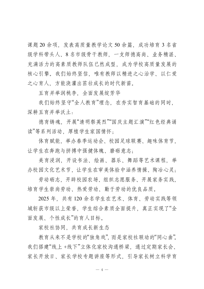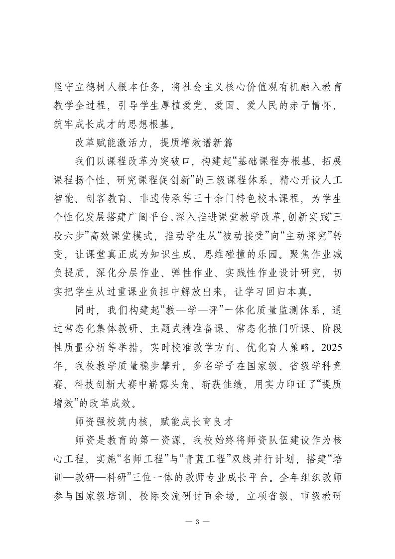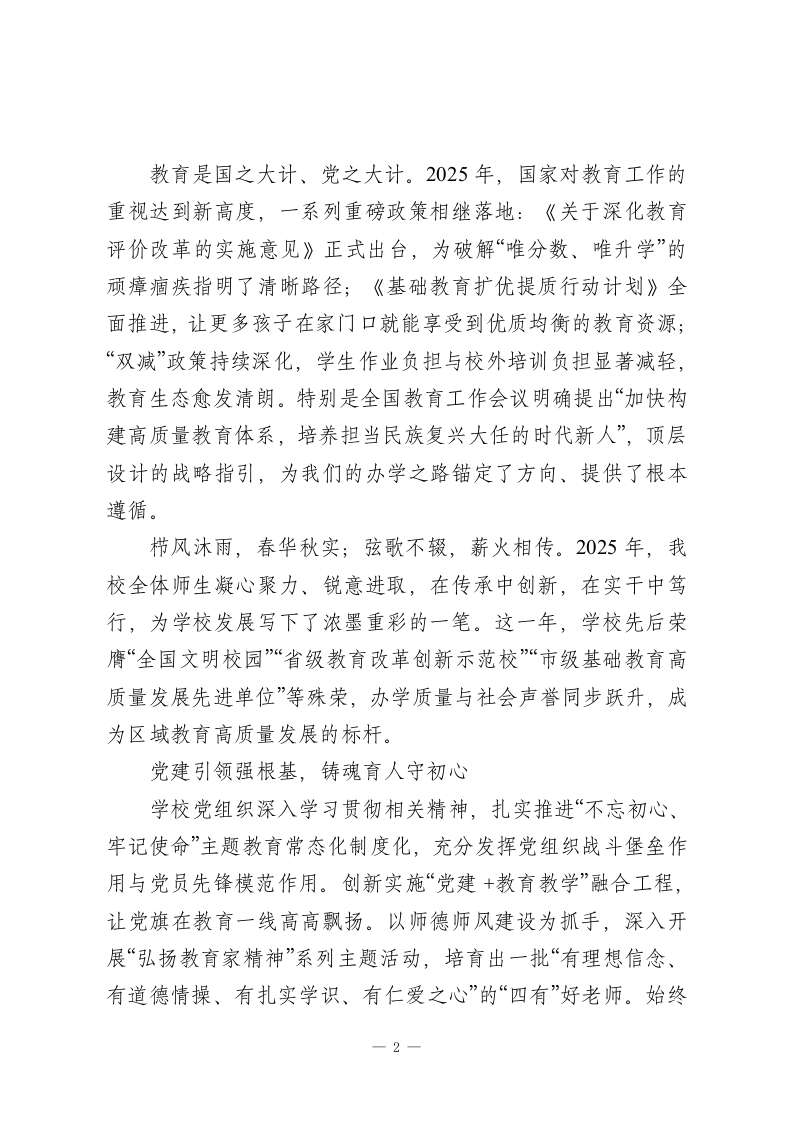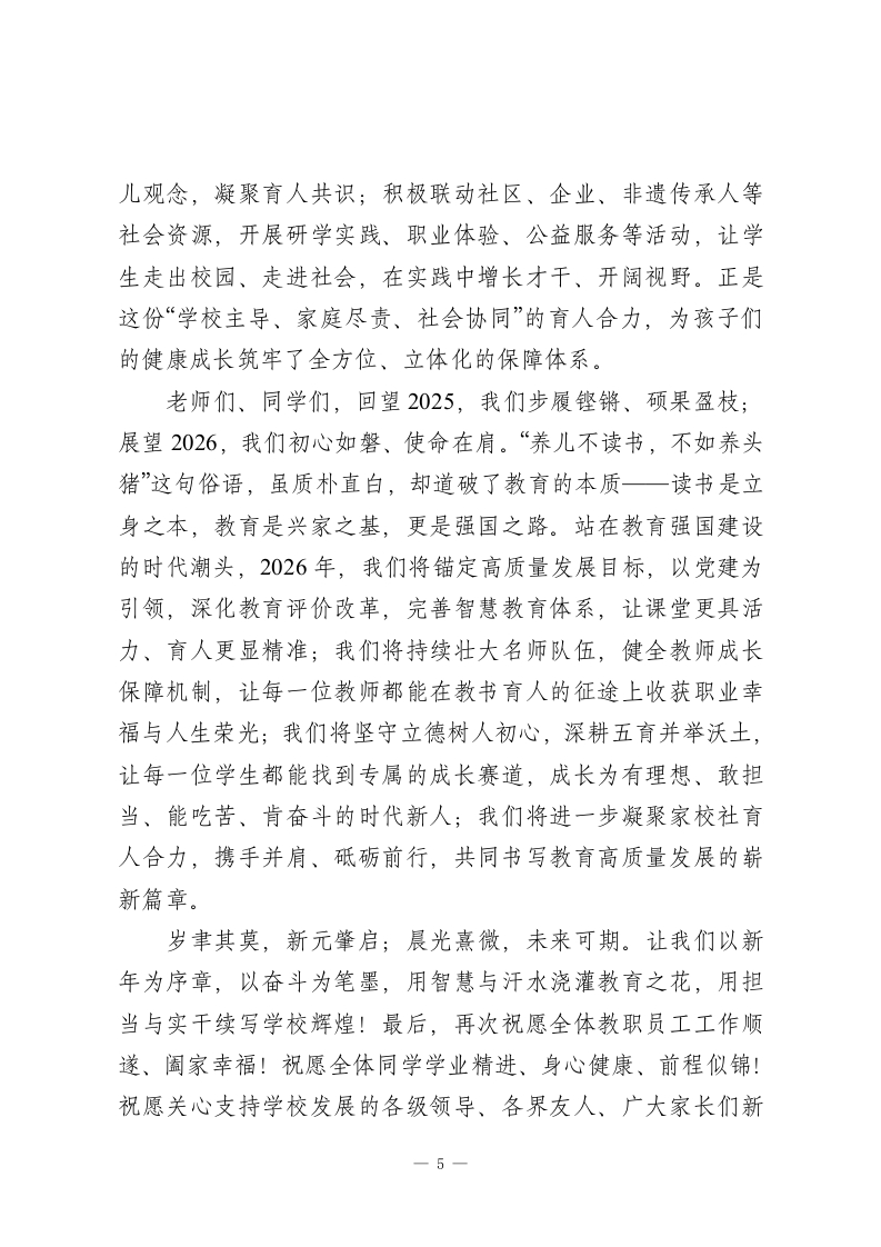 2026年元旦校长致辞:养儿不读书,不如养头猪亲爱的老师、同学们:岁序更迭启新篇,时光荏苒又一载。当新年的第一缕晨光洒满菁菁校园,驱散冬日寒意、照亮前行征途,我们挥别了砥砺奋进、硕果盈枝的2025年,迎来了满怀憧憬、大有可为的2026年。值此辞旧迎新、继往开来的美好时刻,我谨代表学校党组织领导班子,向辛勤耕耘在教育一线、默默奉献的全体教职员工,致以最诚挚的问候与最崇高的敬意!向笃学善思、追求卓越的莘莘学子,送上最殷切的期许与最美好的祝福!向长期关心支持学校发展的各级领导、各界友人及广大家长朋友们,表达最衷心的感谢与最诚挚的祝愿!回望2025年,我们与伟大祖国同频共振、同向而行。这一年,是全面贯彻相关精神的开局之年,是推进教育强国建设的关键之年,更是“十四五”规划圆满收官、“十五五”规划谋篇布局的承上启下之年。放眼华夏大地,高质量发展的热潮澎湃涌动:嫦娥七号成功探月,实现人类首次月球南极原位探测,续写了中华民族的飞天梦想;国产大飞机C929振翅首飞,标志着我国民用航空工业实现从“跟跑”到“并跑”再到部分“领跑”的历史性跨越;时速600公里磁悬浮高速铁路商业运营,让“贴地飞行”的愿景照进现实。祖国的辉煌成就,既彰显了中国智慧与中国力量,更为我们办好人民满意的教育注入了不竭动力与坚定信心。1