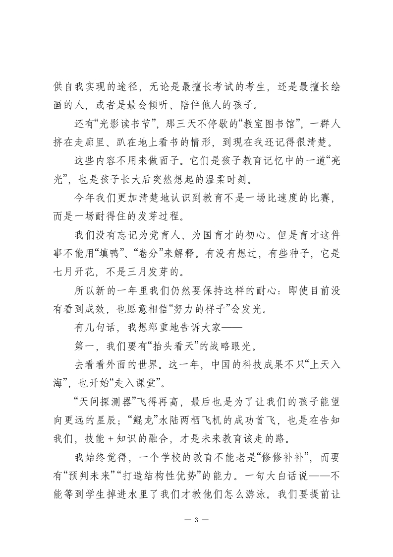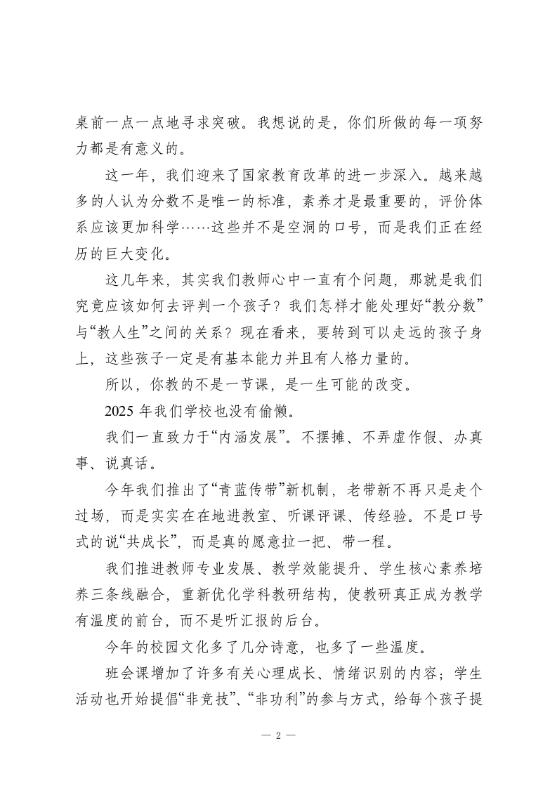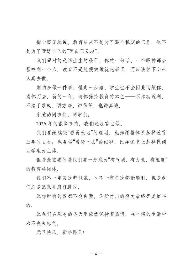 2026元旦校长精彩致辞:不是教了一节课,而是改变了一生的可能一一校长这篇元旦致辞刷屏了!时间总是悄无声息地向前流逝。窗外的树枝已经光秃了,空气中多了股清冷的味道,但是校园里的每一个角落里,仍然透着忙碌和踏实的气息。就在这样一个冬日的清晨,我们即将翻开2026年的第一页。在辞旧迎新的温馨时刻,我代表学校向一年来咬牙坚持、默默奉献的各位老师道一声新年好,也祝你过得好;向沉心静气、踏实成长的各位同学说一声加油!你比你想象中还要棒;向一直支持学校、理解教育的家长们表示最真挚的谢意,是你们的信任让我们有前行的底气;也向一直陪伴教育、关心学校的各界同仁道一声感谢。一年过去了,我们都不容易,也都很了不起。这一年,我们仍在讲台上守着那三尺之地,也在生活当中悄悄地背着压力与疲惫一路前行。很多老师已经记不清为多少个学生操过心,为多少份试卷改到深夜了;也有多少人累得嗓子沙哑了,仍然坚持上一节课“不能输”的课。也许没有人能完全体会到你们的辛苦,但是一我知道。这一年,我们的孩子有人考出了人生第一个A+,有人在低谷中默默奋斗;有人在球场上挥汗如雨,有人在实验室或者书1
