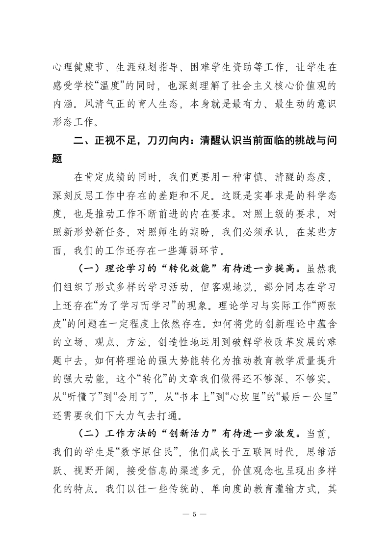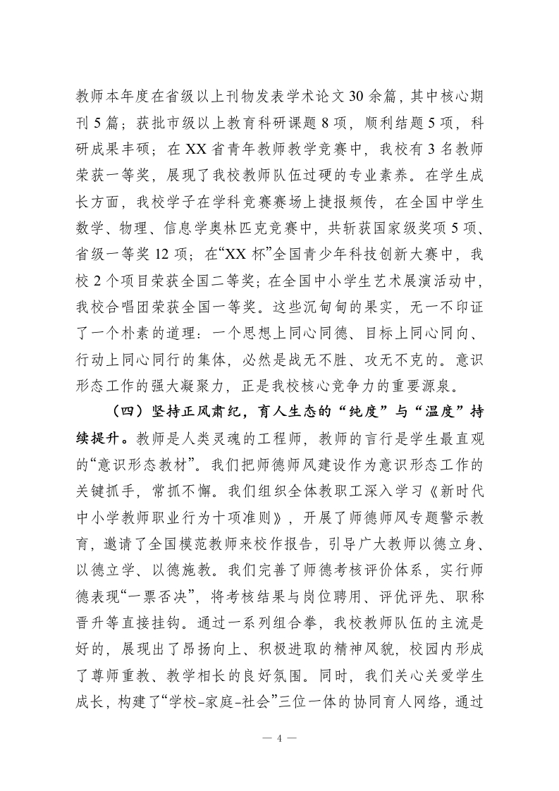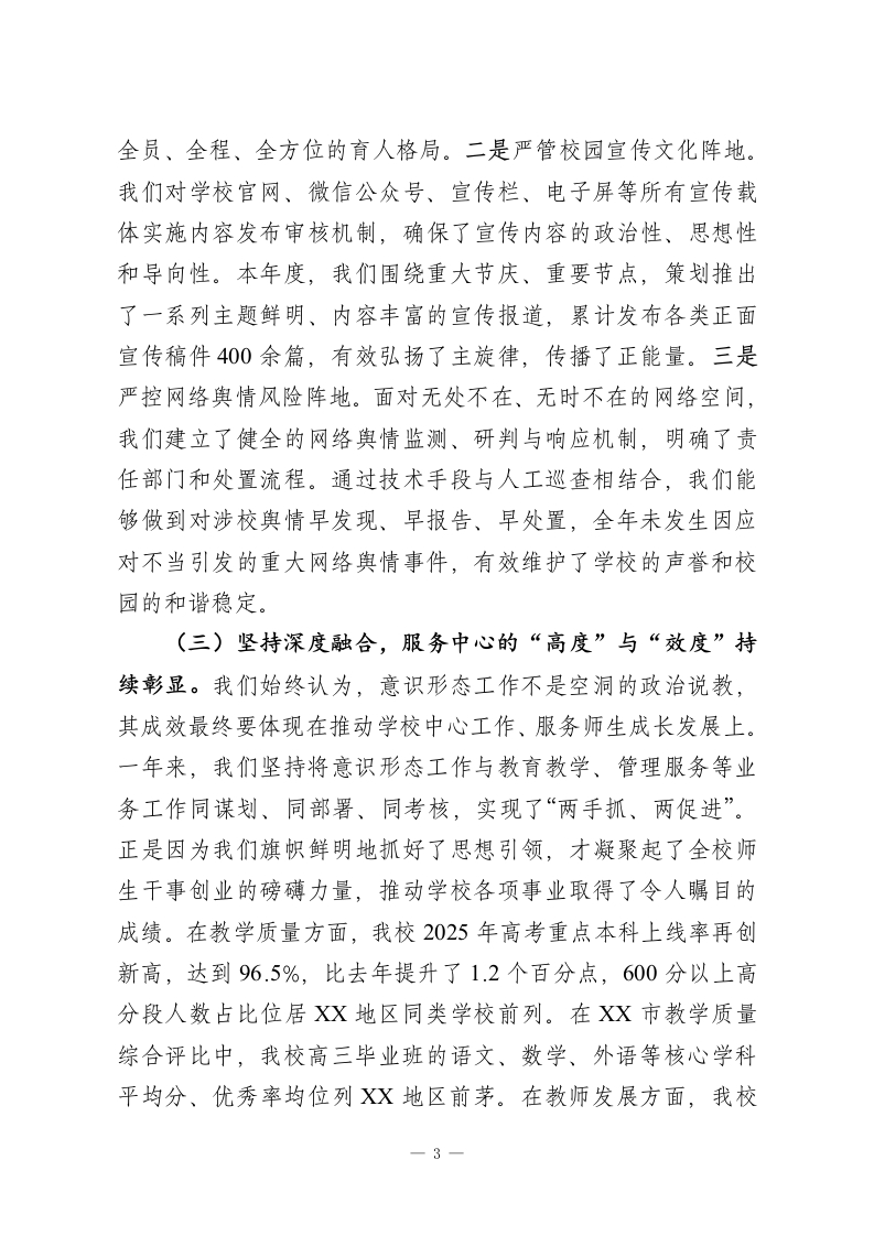 XX中学党委意识形态工作总结会上的讲话同志们:今天,我们在这里召开2025年度学校党委意识形态工作总结会,主要任务是深入学习贯彻上级关于意识形态工作的重要指示精神,全面总结我们过去一年的工作,深刻分析当前面临的形势与挑战,并对下一阶段的重点任务进行研究和部署。这次会议,既是一次回顾盘点、总结经验的“复盘会”,更是一次认清形势、明确方向、凝聚共识的“动员会”。刚才,我们共同学习了上级最新的文件精神,各分管领导和部门也汇报了相关情况,讲得都很好,很全面,我完全同意。下面,我结合学校的整体工作,再讲三点意见。一、守正创新,凝心聚力:2025年意识形态工作回顾与总结意识形态工作是党的一项极端重要的工作,关乎旗帜、关乎道路、关乎国家政治安全。对学校而言,意识形态工作就是我们立德树人的“生命线”,是我们为党育人、为国育才的“方向盘”和“压舱石”。回首2025年,我们身处百年未有之大变局加速演进、思想文化领域交流交融交锋日趋复杂的时代背景下,学校党委始终坚持以新时代中国特色社会主义思想为指导,将意识形态工作摆在战略高度,牢牢掌握工作的领导权、管理权、话语权,为学校各项事业的高质量发展提供了坚强的思想保证和强大的精神动力。总的来看,我们的工作呈现出“基础扎实、1