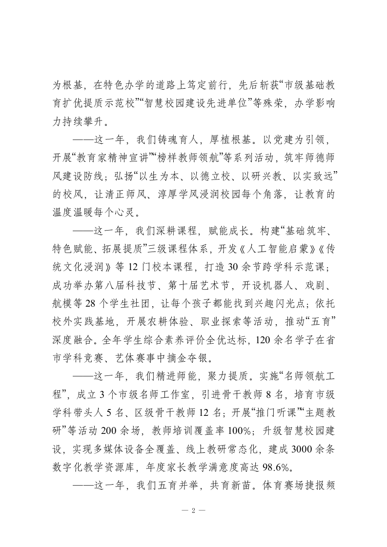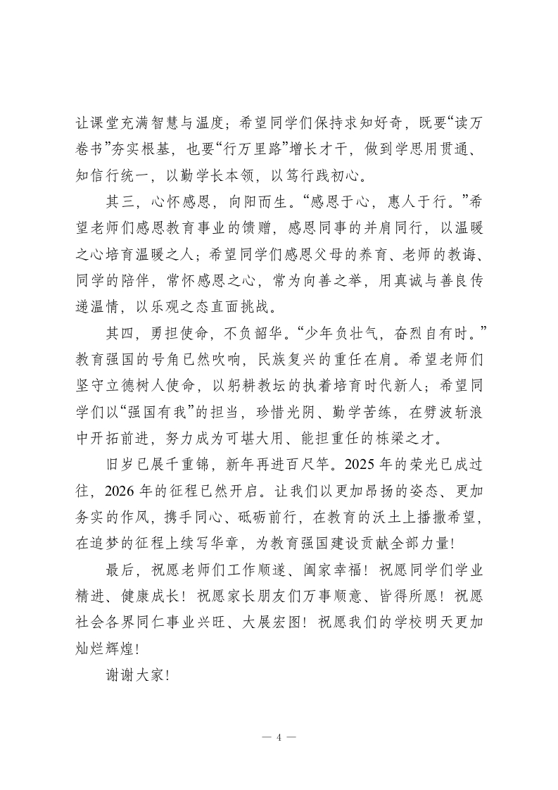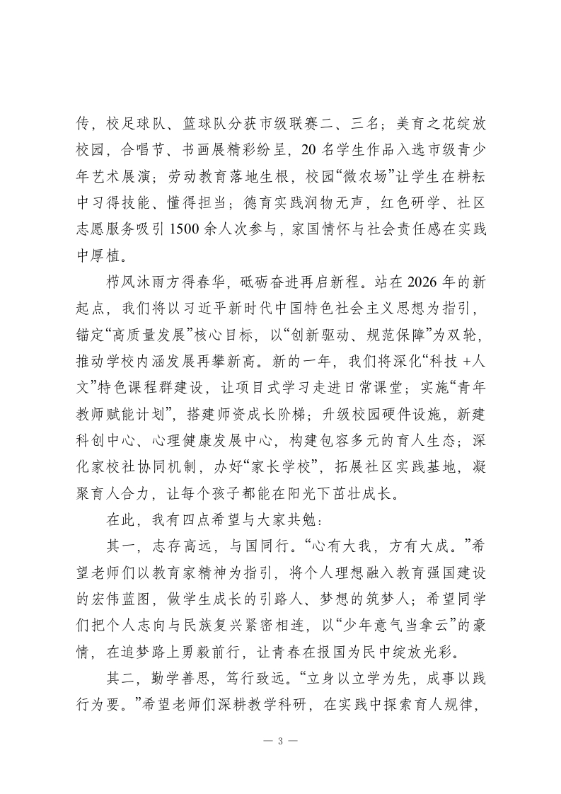 大格局!2026年元旦校长精彩致辞!亲爱的老师们、同学们,尊敬的家长朋友们、社会各界同仁们:冬阳沐校,岁序更新。当第一缕晨光唤醒校园的草木,我们挥别攻坚克难的2025年,满怀热忱拥抱生机盎然的2026年。值此辞旧迎新的美好时刻,我谨代表学校,向躬耕教坛、润物无声的全体教职员工致以最诚挚的敬意!向逐梦韶华、笃学不怠的全体学子送上最殷切的祝福!向倾心护航、鼎力支持的家长朋友们致以最衷心的感谢!向长期关心、助力教育事业发展的社会各界同仁表示最崇高的问候!时光为卷,奋斗作笔。2025年,是教育强国建设蹄疾步稳的关键之年,是“十四五”规划圆满收官的收官之年,更是衔接“十五五”蓝图的承前启后之年。这一年,党的二十届五中全会为新时代教育发展锚定航向,抗日战争胜利80周年的纪念热潮让爱国主义精神在校园深深扎根;这一年,中国科技强国的征程壮阔前行一一“天问二号”探星逐月,开启小行星采样返回的星际新篇;C919大飞机驰骋蓝天、AG600“鲲龙”振翅启航,大国重器书写长空传奇;“九天”无人机首飞成功,新质战斗力尽显硬核实力。时代浪潮中,教育改革向深而行。国家以“破立并举”之势深化教育综合改革,推动考试评价从“分数导向”向“素养导向”的深刻转型,让教育回归“立德树人”的本源。紧随时代步伐,我校始终坚守“为党育人、为国育才”的初心使命,以“五育并举”1