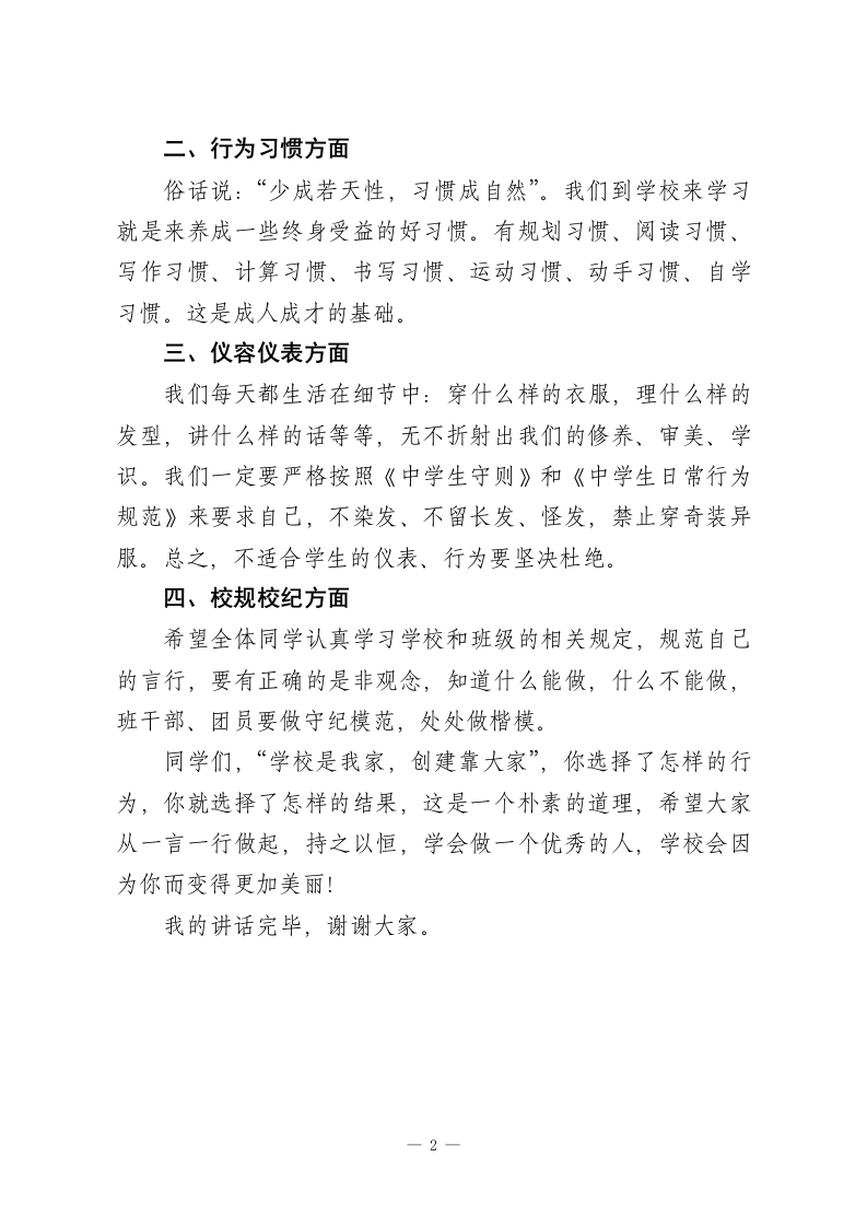 副校长春季新学期开学就德育工作向同学们提了5点要求各位老师、各位同学:大家上午好!据学校调查了解,同学们的寒假生活都安排得丰富多彩。大部分同学在完成学科作业的同时,能完成寒假德育劳动作业。你们帮父母做家务活,每天坚持阳光运动,独立采购年货,整理布置自己的房间,看有益的课外书,能做到这些,这个假期就是有意义的。恭喜你们又长了一岁,祝贺你们变得更加独立自主,更加懂事自律!寒假已经结束,新的学期,是新的开始,带来新的挑战,也孕育新的希望。同学们,我想问问你,新学期你有什么新目标新计划吗?你有勇气挑战自己挑战新学期吗?你准备好了吗?在此,就学校德育工作,我向同学们提一些要求:一、卫生安全方面卫生是文明的标志,当你离开教室顺手关上电灯时,当你弯腰拣起校园内的纸屑时,当你不再乱抛杂物时,当你遵守了日常行为规范的时候,人性中最美丽的花朵就会在我们的校园里绽放。上楼下楼、早操、课间活动、上学放学都要把安全放在第一位,要学会负责,不仅对社会负责、家庭负责,更要学会对自己负责。一1