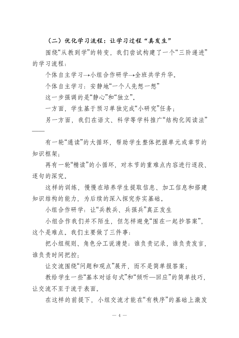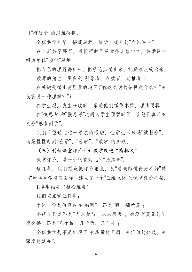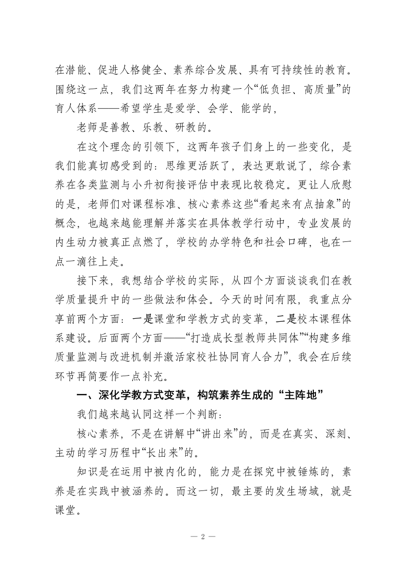 每天3000米“傻跑”,成绩反而全区第一?教学质量工作会校长分享尊敬的各位领导、各位教育同仁:大家好!今天有机会在全区教学质量工作会议上,与各位同行做一点交流,我个人既感到荣幸,也感到压力。我们学校这几年在教学质量方面取得了一点点进步,离不开教育局的坚强领导、教师进修学校的专业引领,更离不开各兄弟学校长期以来的经验启迪和真诚相助。在这里,先向大家表示衷心的感谢。我们心里很清楚:教育质量的提升,绝不是一朝一夕的“短跑冲刺”,也绝不是一所学校可以“单打独斗”完成的事。它需要理念上的久久为功,需要行动上的持续聚焦,更需要系统之间、学校之间的联动与协同。面对“培养什么人、怎样培养人、为谁培养人”这一根本命题,新时代课程标准已经给出了明确回答一一要培养有理想、有本领、有担当的时代新人。这就提醒我们,不能再把教育简单理解为“知识堆砌”和“分数竞争”,而要站在学生终身发展、主动适应未来社会的高度,重新审视我们的课程、课堂和育人方式。基于这样的思考,我们学校确立了一个相对清晰的核心育人理念:“以生为本,个性赋能,全面发展”。我们更愿意把高质量教育,理解为一种能激活每个生命内-1