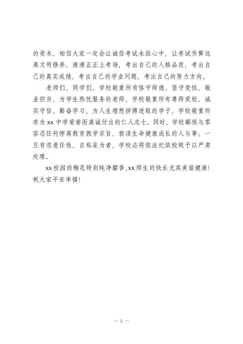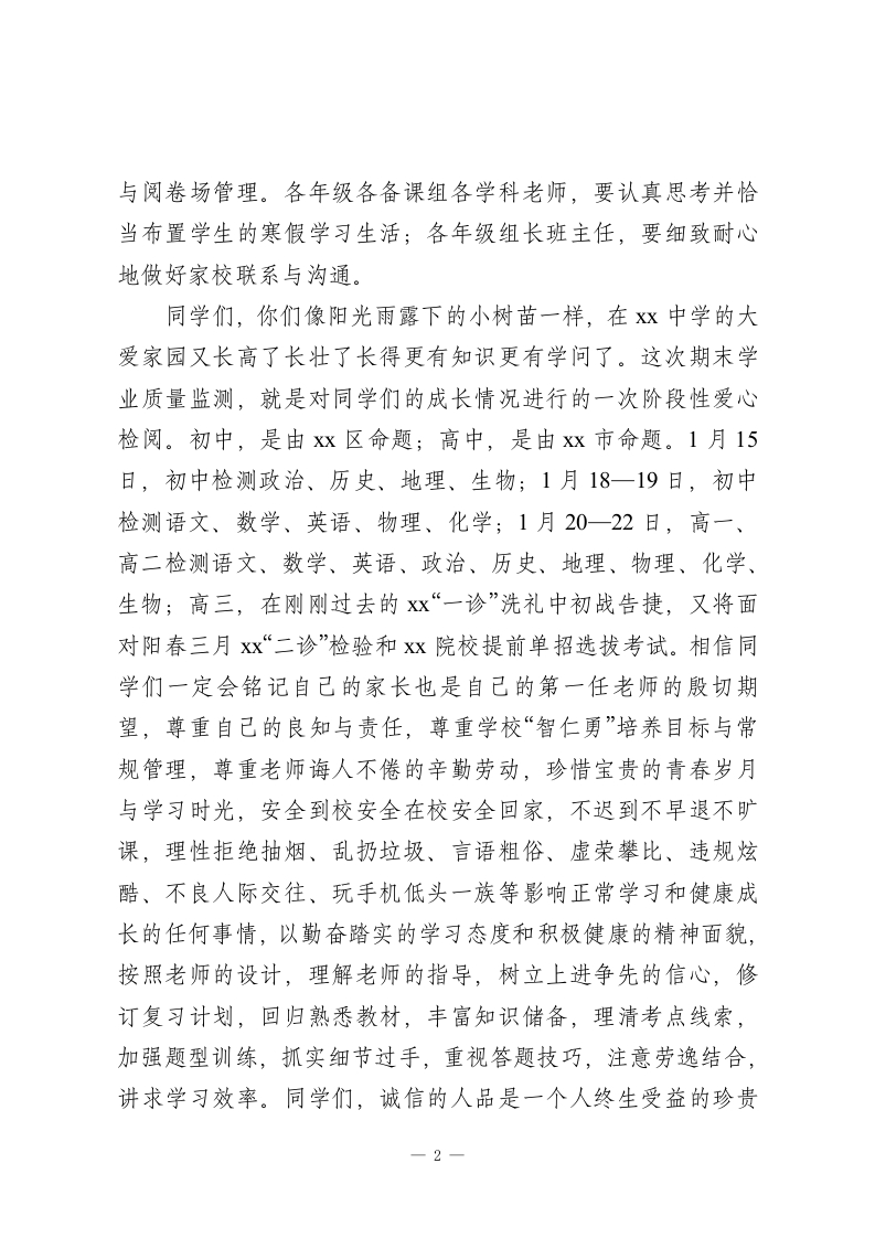 期末考试之前,校长讲话:考出自己的人格品质,考出自己的真实成绩,考出自己的学业问题,考出自己的努力方向尊敬的老师们、亲爱的同学们:大家好!20xx年已过去整整10天。从今天开始,我们Xx中学本学期就正式进入期未复习和考试阶段了,直到1月26日结束。在这寒假前仅有的两周时间里,我们老师怎么做最好,我们同学又怎样做才算好,为此,学校谨提以下希望和要求:老师们,真情关心学生,身教重于言教,像爱护子女弟妹一样善待学生,根据市、区、校关于期未学业质量监测的通知精神,结合我们学生的实际情况,充分发挥备课组的团队智慧,充分发挥班级管理的个性化功能;以教材为本,有序设计复习课教案;针对性强地少讲精讲,把较多的时间安排给学生动笔读教材读资料读学习笔记读平时积累的自己的考试卷,把较多的时间放手给学生去完成老师精心设计布置的习题,把较多的时间留给老师自己去指导督促检查学生对知识对问题过手过关的情况。这期间,老师们务必加强对学生的日常行为规范的严格要求与管理,加强对学生文明习惯、社会公德、诚信应考和安全健康的教育与提醒。而且,老师们要自觉遵守Xx中学《考试工作规程》,严格履行监考职责,认真完成阅卷任务,监考时严守监考员纪律,阅卷时严守阅卷规则,诚恳接受学生评议1