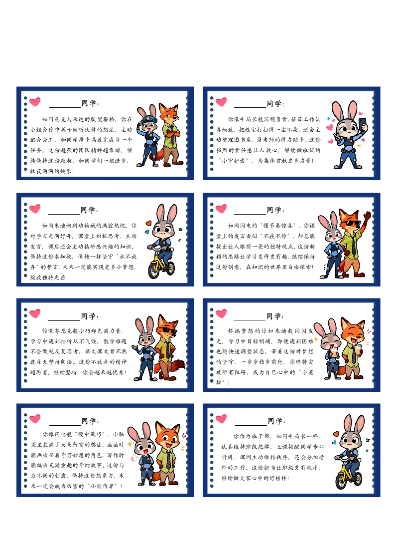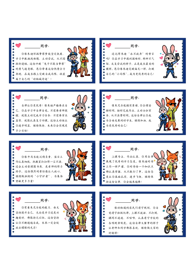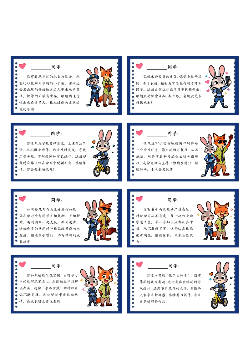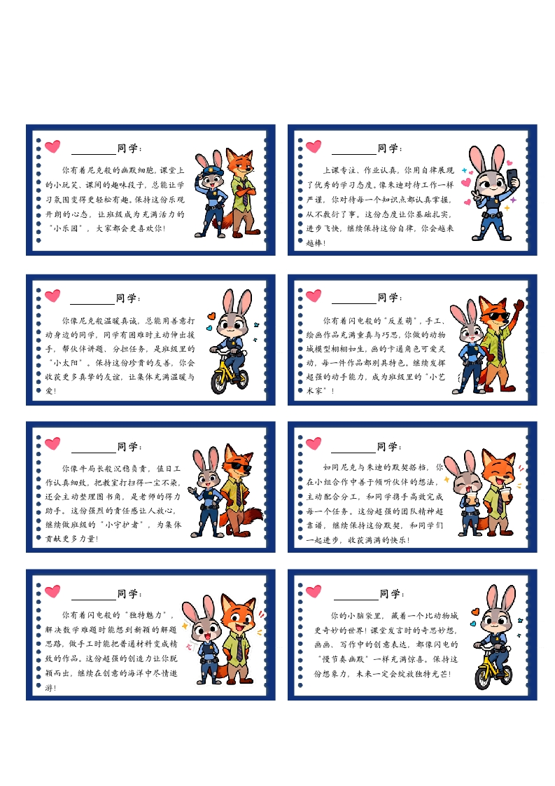 同学:同学●●●你像米迪怀揣警察梦般坚定执着:上课专注、作业认真,你用自律展现学习中敢挑战难题、主动会试。从不因了优秀的学习态度。像米迪对待工作一样●●挫折退缩。这份冲破“兔子不能当警察●严谨,你对待每一个知识点都认真掌握。●。的身气超亮眼,愿你带着这份热情全力●从不最衍了事。这份态度让你基础扎实。奔跑,在成长路上突破自我局限,收花●。进步飞快。继续保持这份自律,你会越来●属于自己的·动物城奇迹”!●越棒!●同学:●同学:●你像尼克般温暖真诚。总能用善意打你有着闪电般的“反差萌”,手工、●动身边的同学,同学有因难时主动伸出援绘画作品充满童真与巧思。你做的动物●手,帮伙件讲随、分担任务,是班级里的●城模型相相如生,画的卡通角色可爱灵●·小太阳”。保持这份珍贵的友善。你会。动,每一件作品都别具特色。继续发挥。收花更多真挚的友谊,让集体充满温暖与超强的动手能力。成为班级里的“小艺爱!●●术家!同学::同学:你像牛局长般沉稳负责,值日工如同尼克与来迪的默契搭档你●作认真细致,把教宝打扫得一尘不染在小组合作中善于倾听伙件的慈法,●●还会主动整理图书角,是老师的得力●主动配合分工,和同学携手高放完成●助手。这份强烈的真任感让人放心每一个任务。这份超强的团队精神超。继续做班级的“小守护者”,为集体●靠谱,继续保持这份默契,和同学们●贡献更多力量!●一起进步,收茂满满的快乐!●同学:同学::●你有着闪电般的“独特燃力”。解决数学难题时能想到新额的解题:你的小脑袋里。藏着一个比动物城更奇妙的世界!课堂发言时的奇思炒想,●思路,做手工时能把普通材料变成精画画、写作中的创恋表达,都像闪电的●致的作品。这份超强的创造力让你脱“慢节奏幽默”一样充满惊喜。保持这●颖而出,继续在创意的海洋中尽情逃份想象力,未来一定会绽放独特光芒」●游