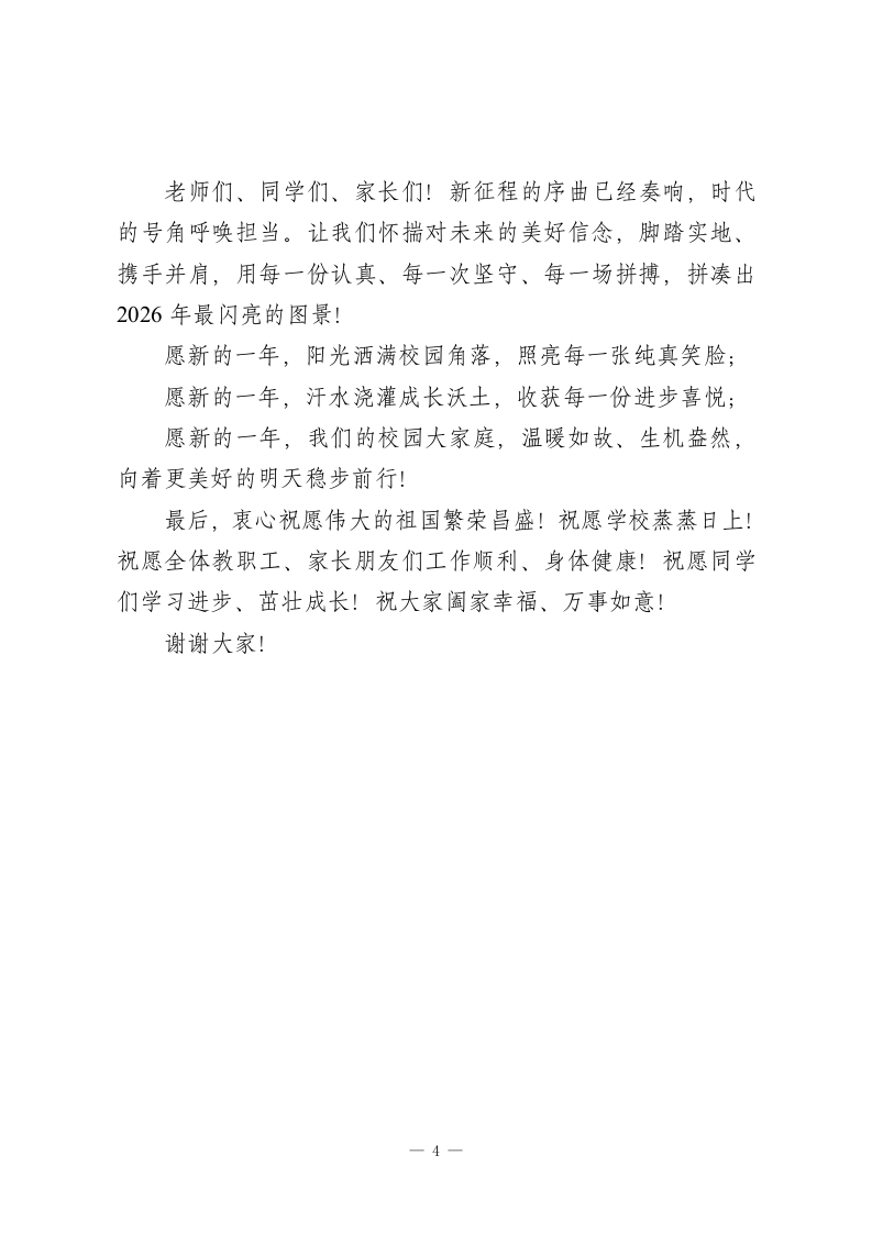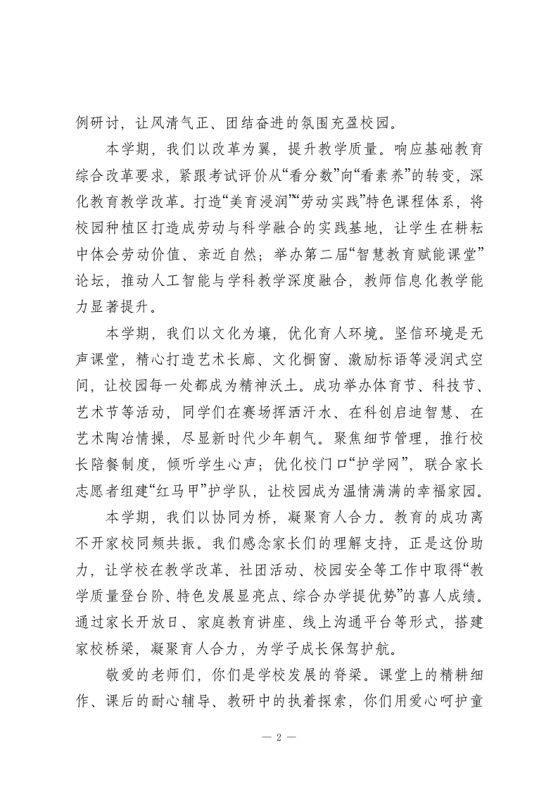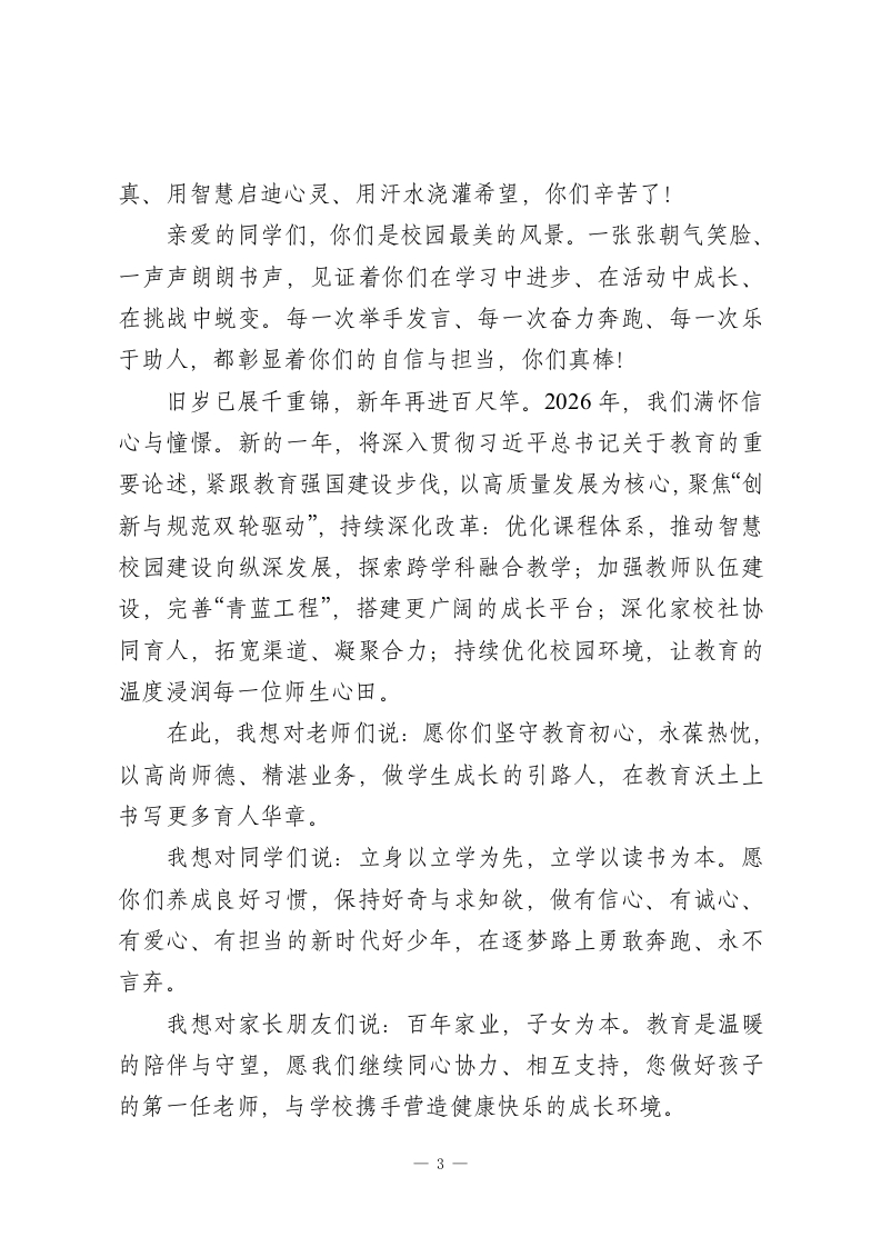 秋季学期暨元旦校长致辞:以马年之暖,赴育人之约尊敬的各位领导、家长朋友们,亲爱的老师们、同学们,社会各界的朋友们:大家新年好!律回春晖渐,万象始更新。当冬日的暖阳铺满校园,当2026年的钟声即将敲响,我们怀着感恩与憧憬,迎接充满希望的新一年。值此辞旧迎新之际,我谨代表学校领导班子,向辛勤耕耘的全体教职工致以诚挚问候与衷心感谢!向逐梦前行的学子们送上纯真祝福与殷切期盼!向信任支持学校的家长朋友们致以崇高敬意!向关心助推教育事业的各级领导与社会同仁表达深深感恩!时光不语,岁月留痕。本学期,是教育强国建设向纵深推进的关键阶段,也是我校深耕内涵、品质跃升的奋进期。我们始终牢记“为党育人、为国育才”的使命,紧跟教育改革步伐,以“五育并举”为抓手,在特色办学路上步履铿锵、硕果盈枝。本学期,我们以党建为魂,筑牢育人根基。把党的政治建设摆在首位,深化师德师风建设,开展以中央八项规定精神为核心的纪律学习教育,引导教职工明规矩、知敬畏、守底线。依托智慧党建平台,学习党的最新理论与教育方针,以“教育家精神铸魂强师行动”涵养师风,以“榜样教师分享会”点亮初心。推动党建与教学深度融合,与兄弟学校开展多轮联合教研、课1