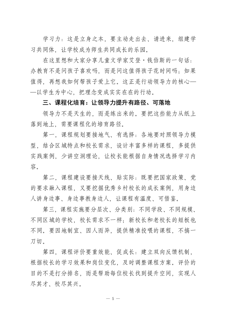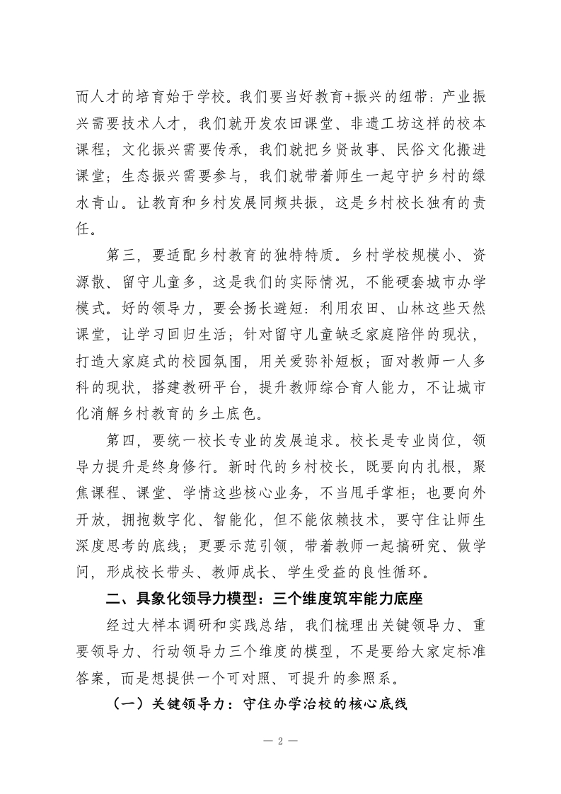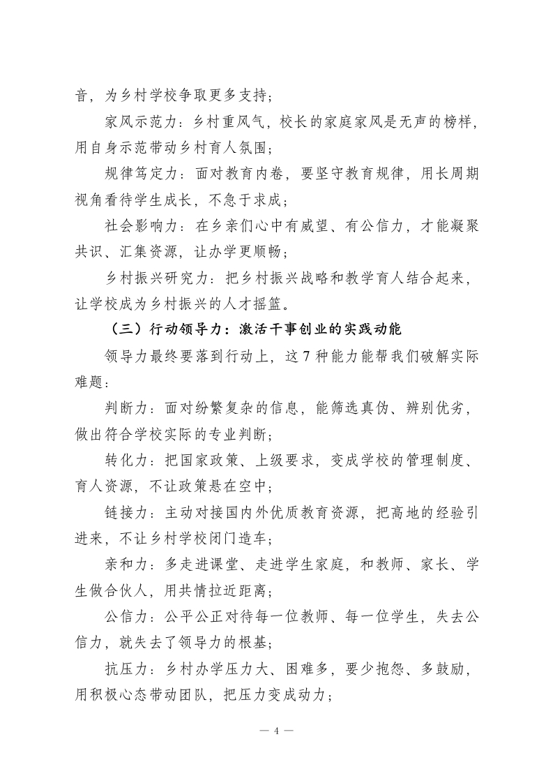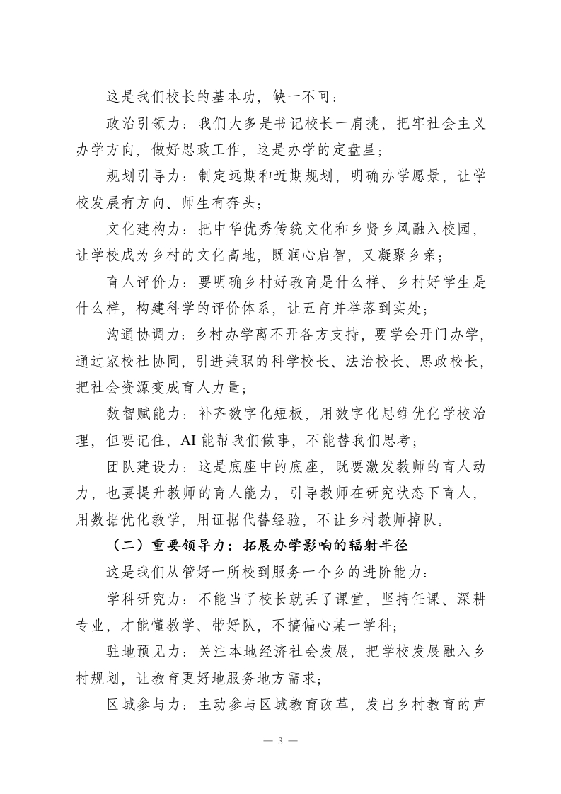 校长论坛上发言:乡村校长如何建构领导力各位校长同仁、各位教育界的朋友们:大家上午好!今天能和各位深耕乡村教育一线的“领头雁”齐聚一堂,共同探讨“乡村校长如何建构领导力”这个核心命题,我内心满是共鸣与期待。乡村教育是教育强国的基石,是乡村振兴的灵魂,而我们乡村校长,正是这块基石的守护者、这份灵魂的塑造者。正如俗语所言:“乡村兴必先学校兴,学校兴必先校长强”,但在实际办学中,很多校长都会有这样的困惑:领导力到底是什么?该从哪里发力?今天,我想结合政策要求、实践探索和调研数据,和大家分享三点思考。一、新时代乡村校长领导力,要找准四个契合点我们的领导力,不是城市校长的翻版,也不是抽象的理论概念,而是要扎根乡村土壤、回应时代需求的真本事。第一,要契合教育强国的战略要求。《教育强国建设规划纲要》明确提出推动义务教育优质均衡发展和城乡一体化,这对我们来说,既是任务也是机遇。乡村学校是优质均衡的主战场,我们校长要把领导力用在优化资源配置和缩小城乡差距上一一让乡村孩子能享受到和城里孩子一样的优质课程,让每个孩子的受教育权都得到坚实保障,这就是我们对教育强国最实在的贡献」第二,要呼应乡村振兴的现实需求。乡村振兴缺不了人才,一1
