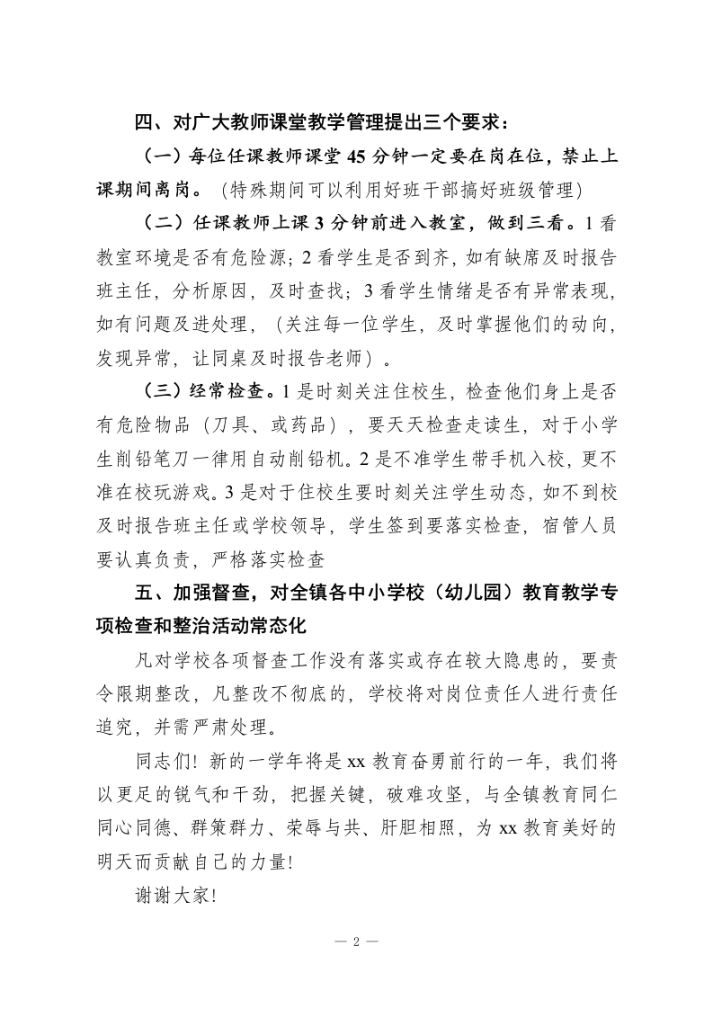 校长在新学期教育教学工作会议上讲话,并对下一步工作提出了5点要求各位校长,大家上午好!为了贯彻落实xx县20xx-20xx学年教育教学工作会议精神,进一步明确形势和任务,安排部署新学期重点工作,进一步统一思想,坚定信心,振奋精神,抢抓机遇,务实拼搏,努力推动我镇教育事业持续、健康、快速、均衡发展。为此,我们召开了“xx中心学校教育教学管理工作会议”,其目的就是要对全镇教育教学工作进行再动员、再强调、再部署和再要求。希望大家认真领会,坚决贯彻落实,确保我镇教育教学工作在来年能够谋求新跨越,坚决达到预期的奋斗目标!在此,我对下一步工作提出几点要求:一、“六化”纪律要求常态化、德育教育经常化、安全工作责任化、教育质量目标化、领导工作制度化、环境卫生要优化。二、“六个到位”各项制度制定要到位、各项工作落实要到位、分管工作责任细化要到位、工作布置督查要到位、发现问题处理解决要到位、新入职教师培训要到位。三、“六个一”一是教育广大教师遵纪守法第一,各校安全教育第一,和睦团结协作第一,关爱学生第一,遵老爱幼第一,质量建设第。一1