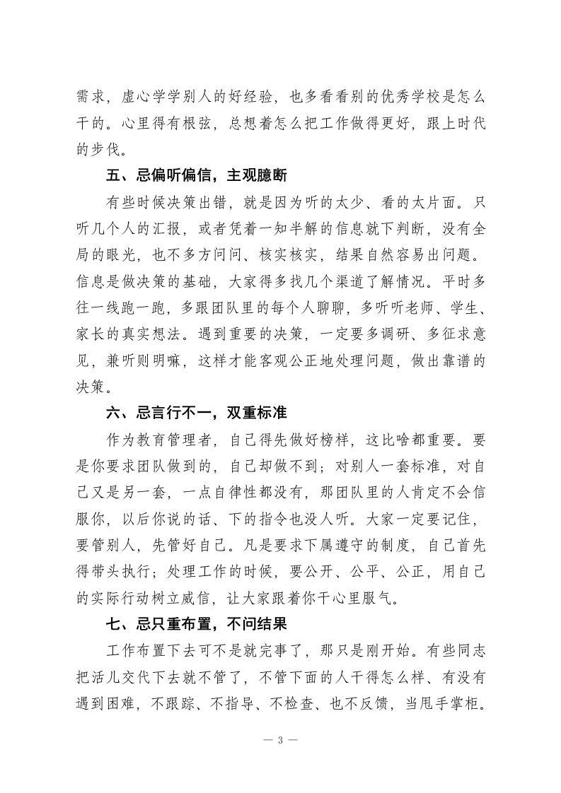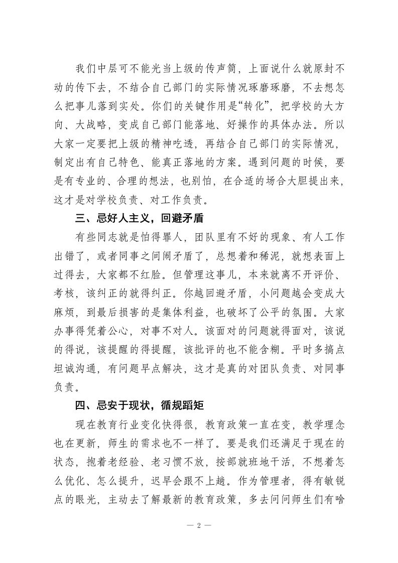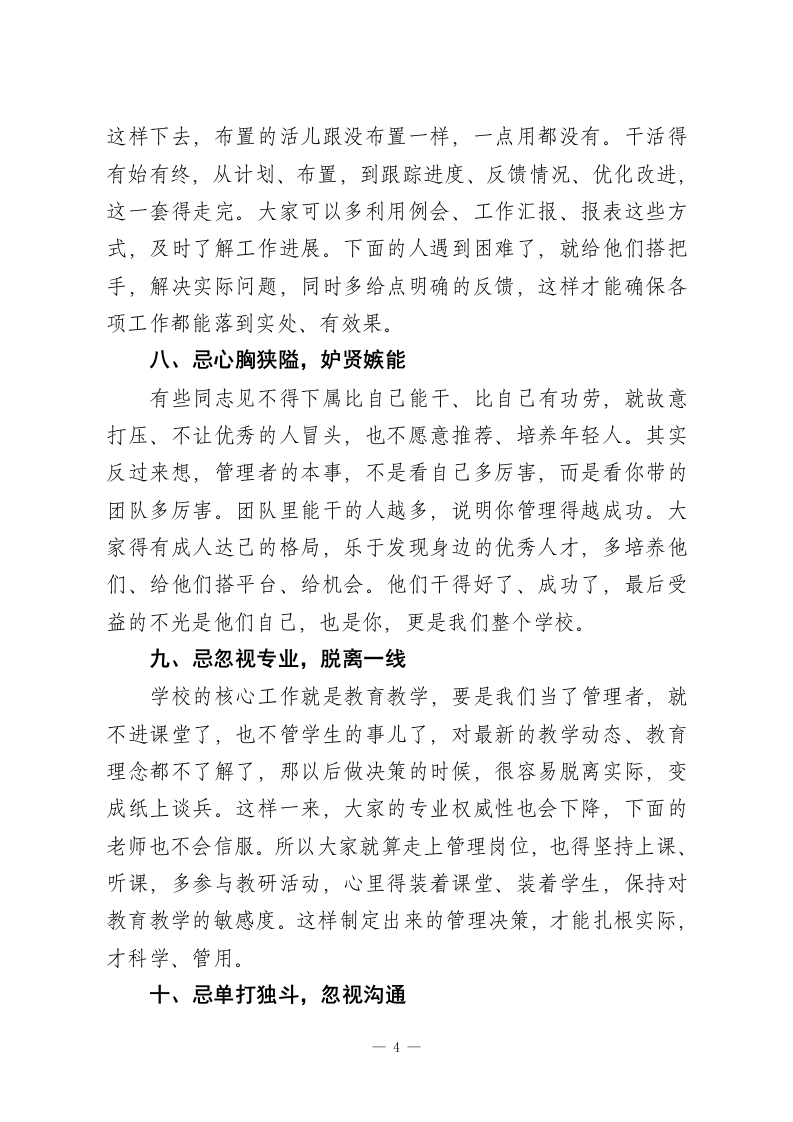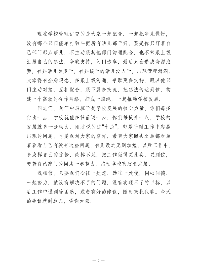 校长在中层班子会上讲话:工作“十忌”,一起把学校事儿干扎实各位中层干部同志们:大家好!今天开这个班子会,没别的复杂事儿,就是想跟大家谈中层干部履职的事儿。我们中层是学校的腰杆子,上连着校领导班子,下连着师生员工,你们的活儿干得怎么样,直接影响学校各项工作能不能落地,校园氛围好不好。今天我不绕弯子,就结合平时观察到的实际情况,跟大家说说“管理干部工作十忌”,既是提个醒,也是我们互相共勉,大家听完多琢磨、多对照,有则改之无则加勉。一、忌角色错位,事必躬亲有些同志当上管理者了,还老把自己当业务尖子、超级老师,啥活儿都自己揽,事事亲力亲为。结果呢?自已忙得脚不沾地,累得够呛,手下的人反而不知道该干啥,也得不到锻炼,成长特别慢。这里我得跟大家说清楚:当了管理者,核心不是自已把事儿做好,而是带着团队把事儿办成。你们得从天天埋头干具体活儿的状态,转变成多想办法、多统筹指挥的角色,得学会放手,相信自己的团队。分工要明确,平时多盯着过程、看看结果就行,不用揪着每个小细节不放。省下来的时间,多想想部门以后怎么发展,工作怎么创新,这才是我们中层该干的正经事儿。二、忌唯命是从,缺乏主见一1