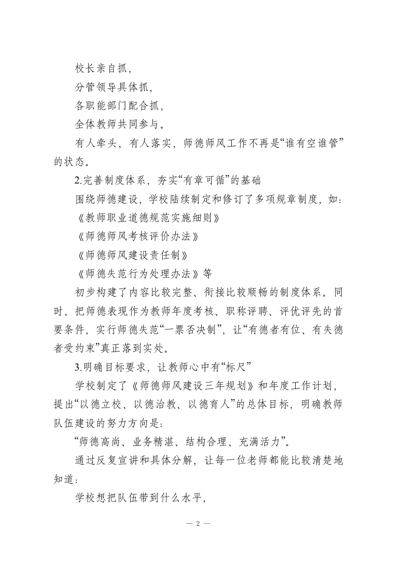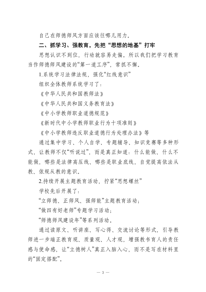 学校师德师风自查报告校长讲话:师德师风建设不能仅仅停留在口头上,要落实到具体的行动当中去!各位领导、各位同仁:师德师风建设,说高一点,是教育事业改革发展的“生命线:说具体一点,直接关系到一所学校的办学方向、教育质量和每一个孩子的成长。按照上级教育主管部门关于开展师德师风建设专项督查的要求,我校高度重视,认真组织,在前期已经有一定基础工作的前提下,又集中开展了一轮较为系统的师德师风自查自纠。这段时间,我们边查边改、边梳理边反思,既看到了成绩,也看到了差距。现将有关情况向各位领导作如下汇报,请审阅、指正。一、把机制建起来,把师德师风真正放到“重要位置”上师德师风不是“软任务”,而是硬要求。我们在这方面主要做了三件基础性工作:1.强化组织领导,拧紧“责任链条”学校成立了师德师风建设工作领导小组,由校长任组长、分管副校长任副组长,各处室负责人为成员,负责师德师风工作的总体谋划、制度建设、活动组织和监督检查等。领导小组下设办公室,负责日常协调和资料归档。形成了这样一个格局:一1