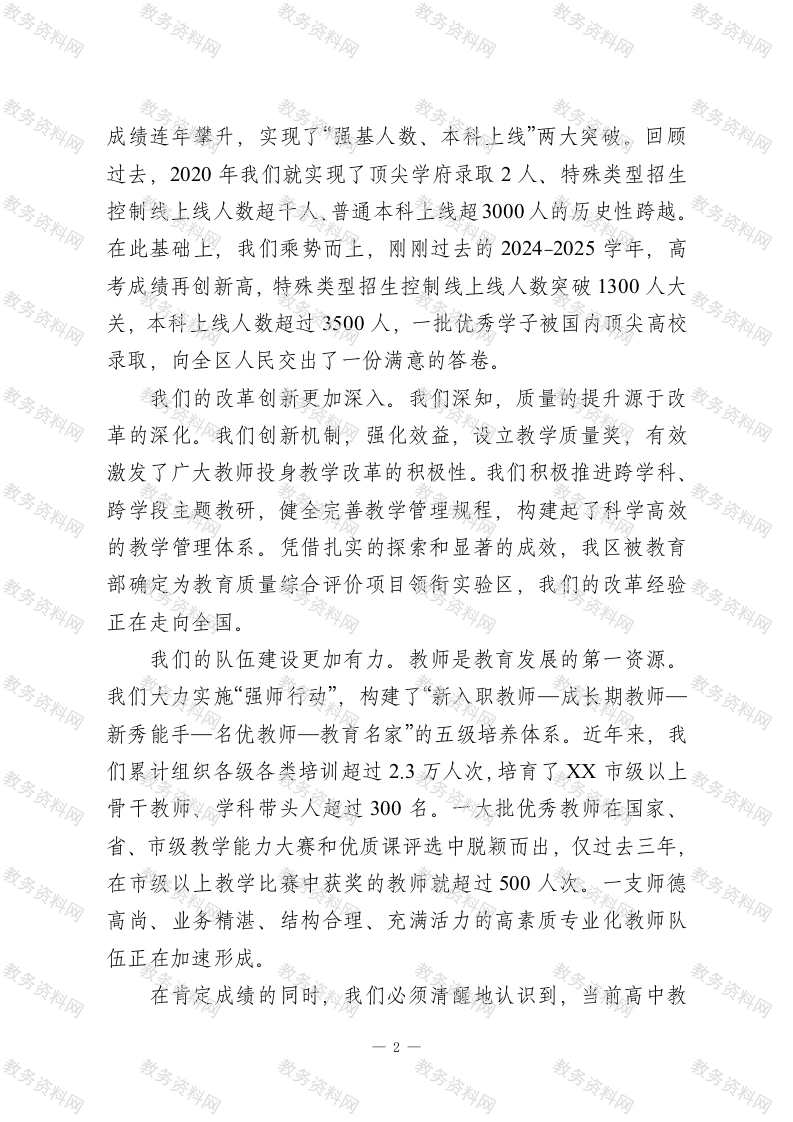 在XX区高中教学高质量发展暨拔尖创新人才培养推进会上的讲话同志们:今天,我们齐聚XX第四中学,隆重召开全区高中教学高质量发展暨拔尖创新人才培养推进会。这次会议,既是一次回顾过去、总结经验的表彰会,也是一次分析形势、明确任务的部署会,更是一次凝聚力量、加压奋进的动员会。刚才,我们对2024-2025学年度普通高中教学教研工作先进单位进行了表彰,XX第四中学、XX实验学校等一批先进集体获得了荣誉。在此,我代表区委教育工委、区教体局,向受到表彰的单位表示热烈的祝贺!向长期以来辛勤耕耘、默默奉献在高中教育一线的全体教职员工,致以崇高的敬意和衷心的感谢!下面,我讲四点意见。一、总结经验,正视挑战,切实增强推动高中教育高质量发展的责任感和紧迫感惟有总结过去,方能更好地开创未来。近年来,在区委、区政府的坚强领导下,在社会各界的大力支持下,我们始终坚持教育优先发展战略,以立德树人为根本,以质量提升为核心,全区高中教育事业呈现出蓬勃向上、整体推进、重点突破的良好态势。我们的办学成果更加辉煌。凭借卓越的办学业绩,我区已连续多年蝉联“XX市普通高中教学工作先进县区”第一名的殊荣,这是对我们全区高中教育工作者的最高肯定。我们的高考1