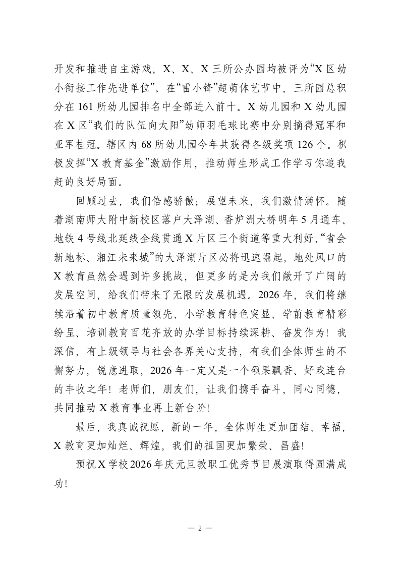 在某学校2026年迎元旦教职工优秀节目展演上的讲话尊敬的X书记、各位领导、嘉宾,亲爱的老师们、朋友们:大家晚上好!带着收获的喜悦,我们顺利地走过了不平凡的2025年,满怀豪情,我们即将迎来充满希望的2026年。在这辞旧迎新的喜庆时刻,我们欢聚一堂,放飞梦想,迎接新年的钟声。在此,我谨代表X学校向一直以来支持关心我们工作的各位领导嘉宾以及辛勤工作在一线的全体教职员工表示最衷心的感谢,祝大家在新的一年里工作顺利,家庭幸福,万事如意!一年来,X学校各方面工作都取得了显著成绩。X片区教育党总支今年又新建了6个两新民办联合支部,现共有两新支部15个,真正把党支部建到了辖区内的所有中小学、幼儿园及培训机构,实现了党J引领全覆盖。大湖中学党支部被评为2023年度X区教育系统先进基层党组织。我们始终牢记校园安全责任重于泰山,全面推进“我们的阵地安如磐”主题活动。片区内悦迪等7所幼儿园荣获X市X区2023年度“平安校园”荣誉称号。大湖中学2023届中考成绩斐然,四大、五小、省示范高中上线率以及普高上线率均创造历史新高。九年级团队被评为2023年X区教育系统“红日型”团队。X小学在X区第二届“雷小锋”超级运动会中获得武术比赛集体项目小学生组冠军,并多次获得全省校园武术比赛集体项目一等奖、武术特色学校、后备人才培养基地等荣誉。学前教育方面积极开展幼小衔接课程,大力1
