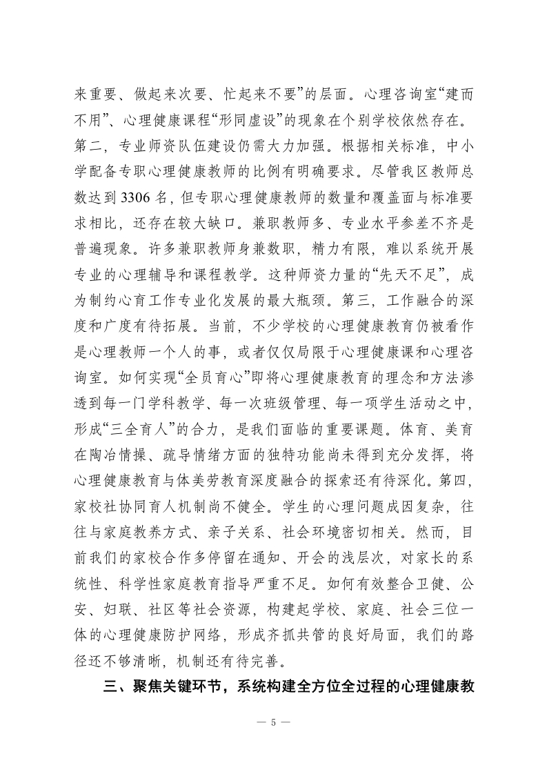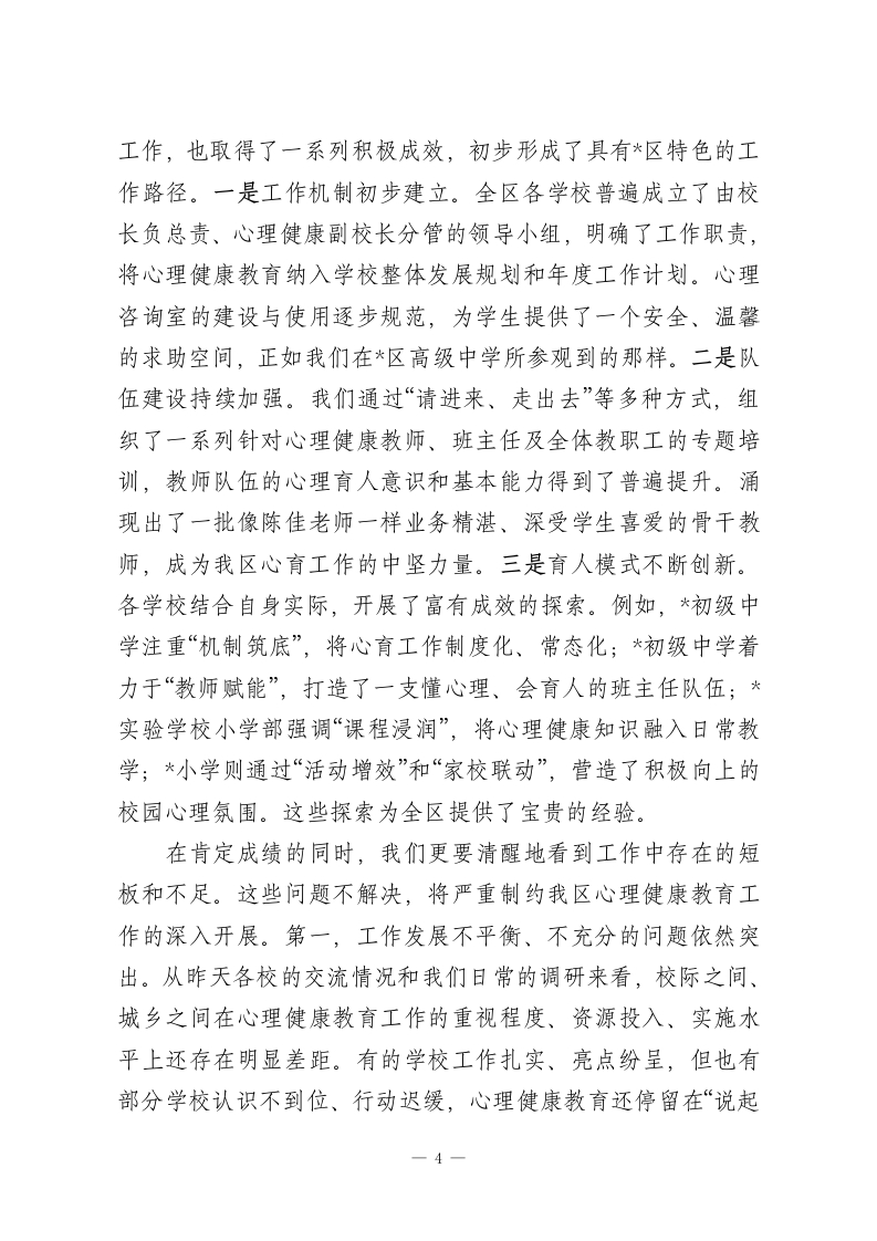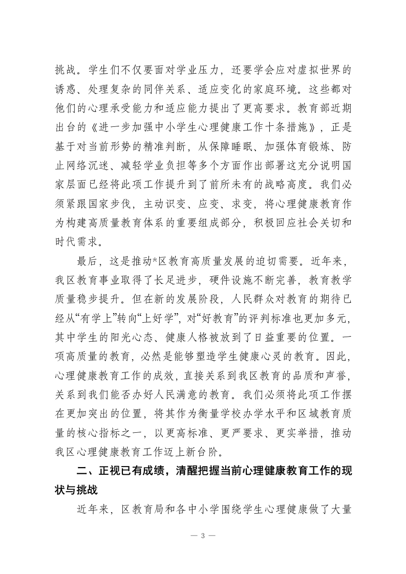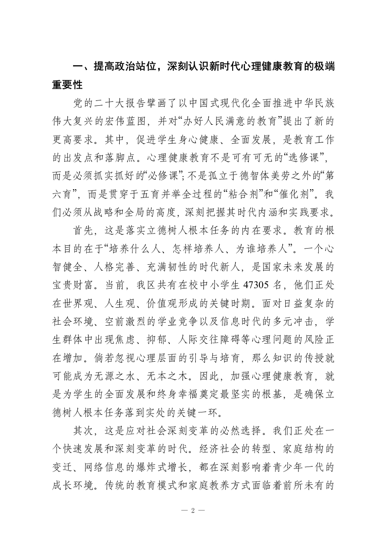 在全区中小学心理健康教育工作推进会上的讲话同志们:今天,我们在这里召开全区中小学心理健康教育工作推进会,主要任务是深入学习领会并贯彻落实教育部《进一步加强中小学生心理健康工作十条措施》的核心精神总结前一阶段的工作,分析当前面临的形势与挑战,并对下一阶段的工作进行系统部署,旨在切实筑牢我区广大中小学生的心理健康防线,为他们的茁壮成长保驾护航。昨天下午,我们组织了现场观摩和经验交流活动。*区高级中学的*老师以《学会正确归因》为题,为我们呈现了一堂高水平的心理健康公开课,充分展示了新时代心理教师的专业素养与教学智慧。随后,*初级中学、第*初级中学、*实验学校小学部、*小学的负责同志分别从不同维度分享了各自学校的宝贵经验,内容涵盖机制建设、教师赋能、课程浸润、家校协同等多个方面,为我们全面推进此项工作提供了极具价值的实践范本。这些成果的取得,离不开在座各位以及全区广大教育工作者的辛勤付出。在此,我代表区教育局,向长期以来奋战在教育工作第一线的同志们,表示衷心的感谢和崇高的敬意!学生心理健康是立德树人的重要基础,事关每一个家庭的幸福安宁,更关系到国家的发展和民族的未来。召开此次会议,既是一次工作部署会,更是一次思想统一会、责任压实会。下面,我结合我区的实际情况,讲几点意见。—1