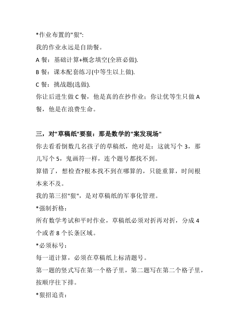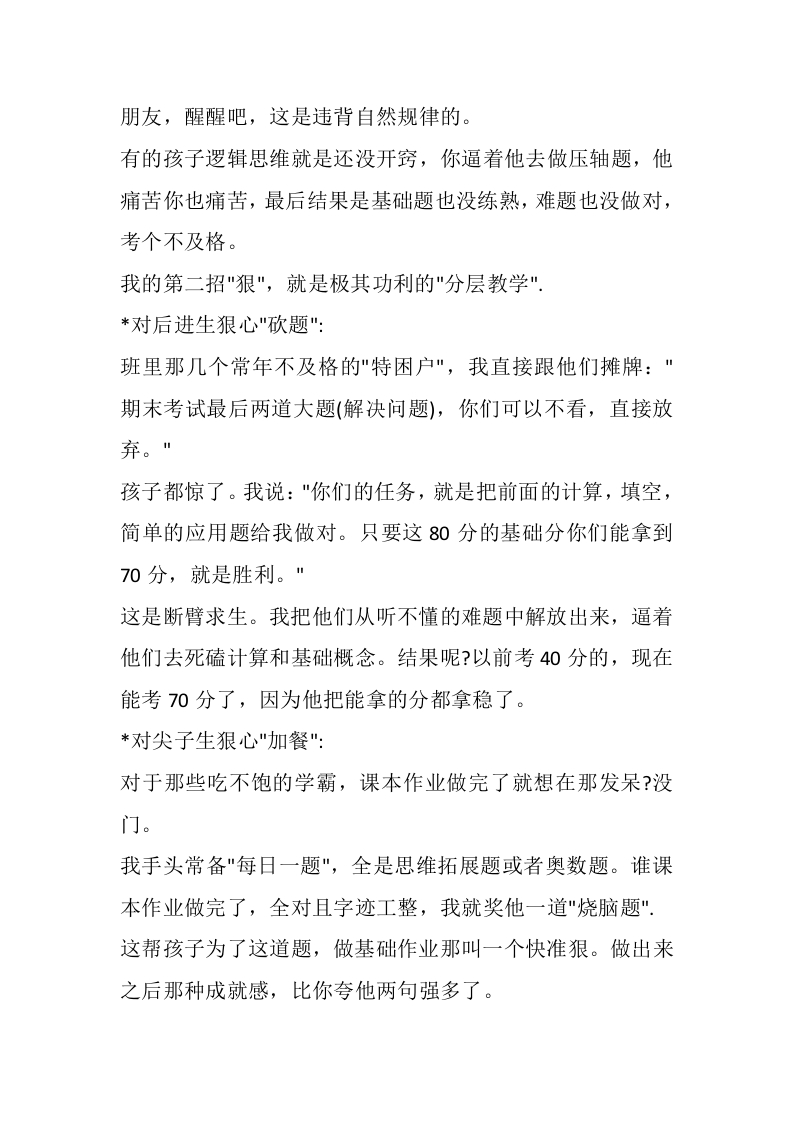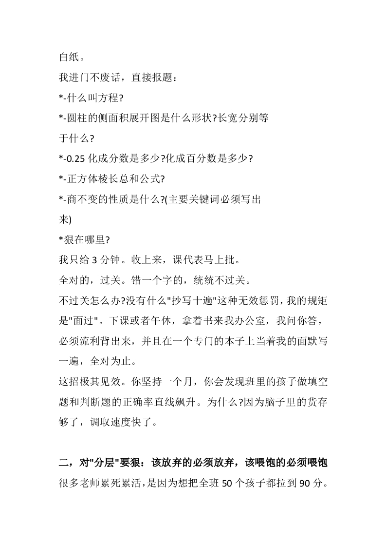 数学带班成绩第一的秘诀:狠带了这么多年数学,从刚毕业时的"温柔知心姐姐"变成了现在的"灭绝师太",我的班级成绩也从年级中游变成了雷打不动的年级第一。很多年轻老师来问我:“姐,你是不是给学生加课了?"我说没有。我的秘诀只有一个字:狠。所谓的"狠",是你对学习规则的寸步不让,是你对教学环节的极致压榨,是你敢于打破"大锅饭"的魄力。想拿第一?把下面这四点"狠招"落实到位,成绩不可能上不来。一,对"概念"要狠:数学也是需要背的!这是很多小学数学老师最大的误区:觉得数学是理科,靠理解,不需要背。扯淡!小学数学里充斥着大量的定义,公式,单位换算,性质。孩子理解了吗?上课点头如捣蒜,那是真的理解了吗?不是,那是他当时觉得自己听懂了。一做题,梯形面积公式忘了除以2,单位换算进率搞错了,这是理解问题吗?这是基本功没砸实!我的第一招"狠",就是雷打不动的"概念默写"你没听错,就是像语文听写生字一样默写数学。*怎么操作?每节数学课预备铃一响,不用我进教室,课代表直接发半张